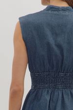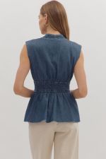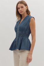 Effortlessly flattering and undeniably chic, our Sleeveless Denim Peplum Top is a coastal classic in the making. Crafted from lightweight woven denim, it features a wide smocked waist that creates a beautifully defined silhouette, balanced by a playful peplum hem. The front zipper closure adds a modern touch, while the sleeveless cut keeps it breezy and versatile for year-round wear. Pair it with white pants, skirts, or casual denim for an easy coastal look that’s as timeless as it is stylish.