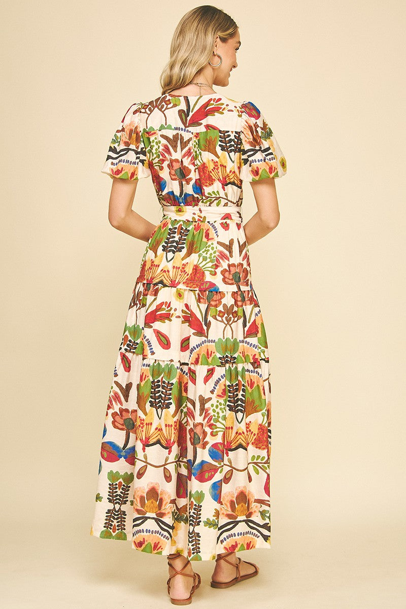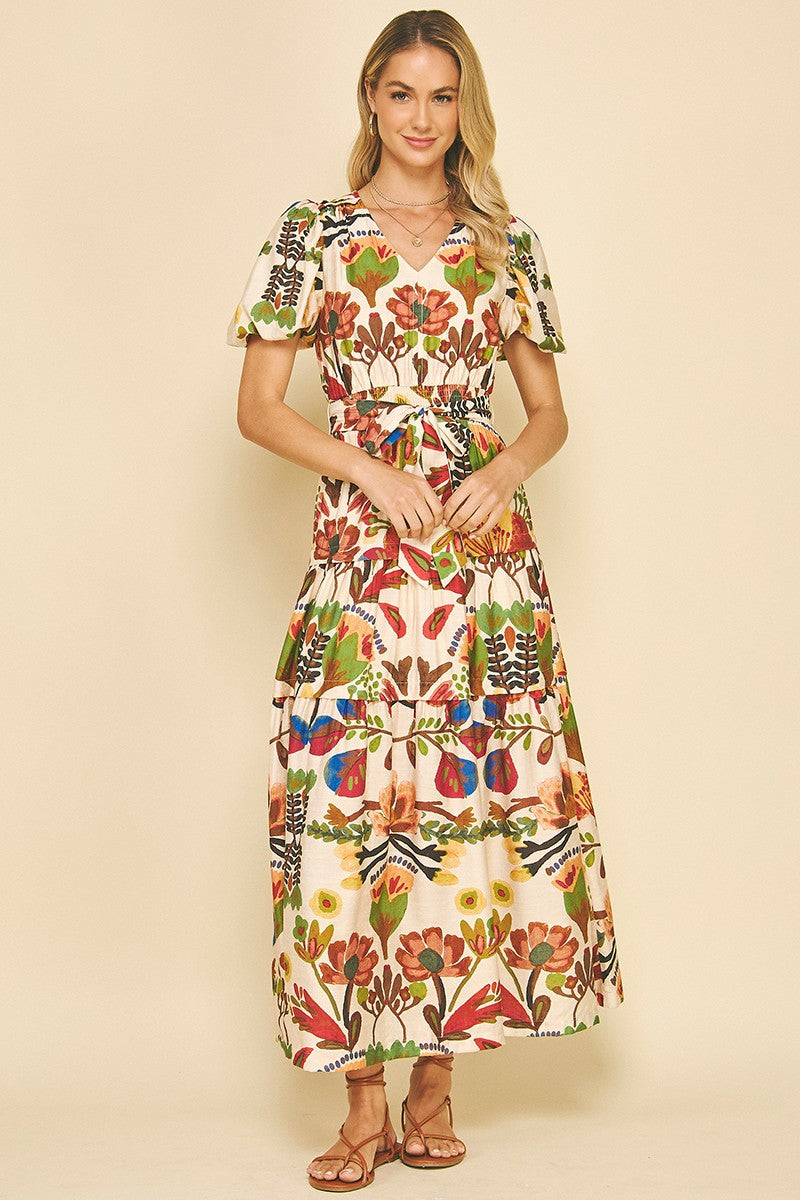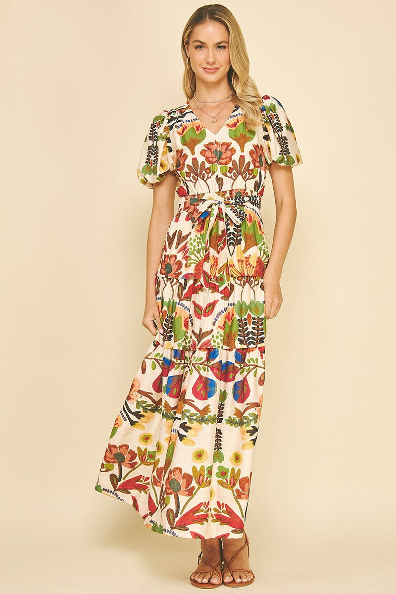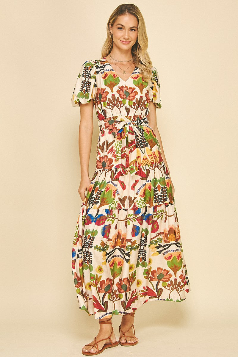 Step into effortless elegance with our Floral Breeze Tiered Maxi Dress, where earthy tones meet coastal charm. Featuring a flattering V-neckline, breezy balloon sleeves, and soft tiered layers that move with grace, this dress is perfect for sun-drenched strolls or sunset soirées. The belted waist cinches just right for a flattering fit, while the rich florals in shades of rust, red, green, and brown bloom beautifully against an ivory canvas. It’s a nature-inspired style with a coastal soul.