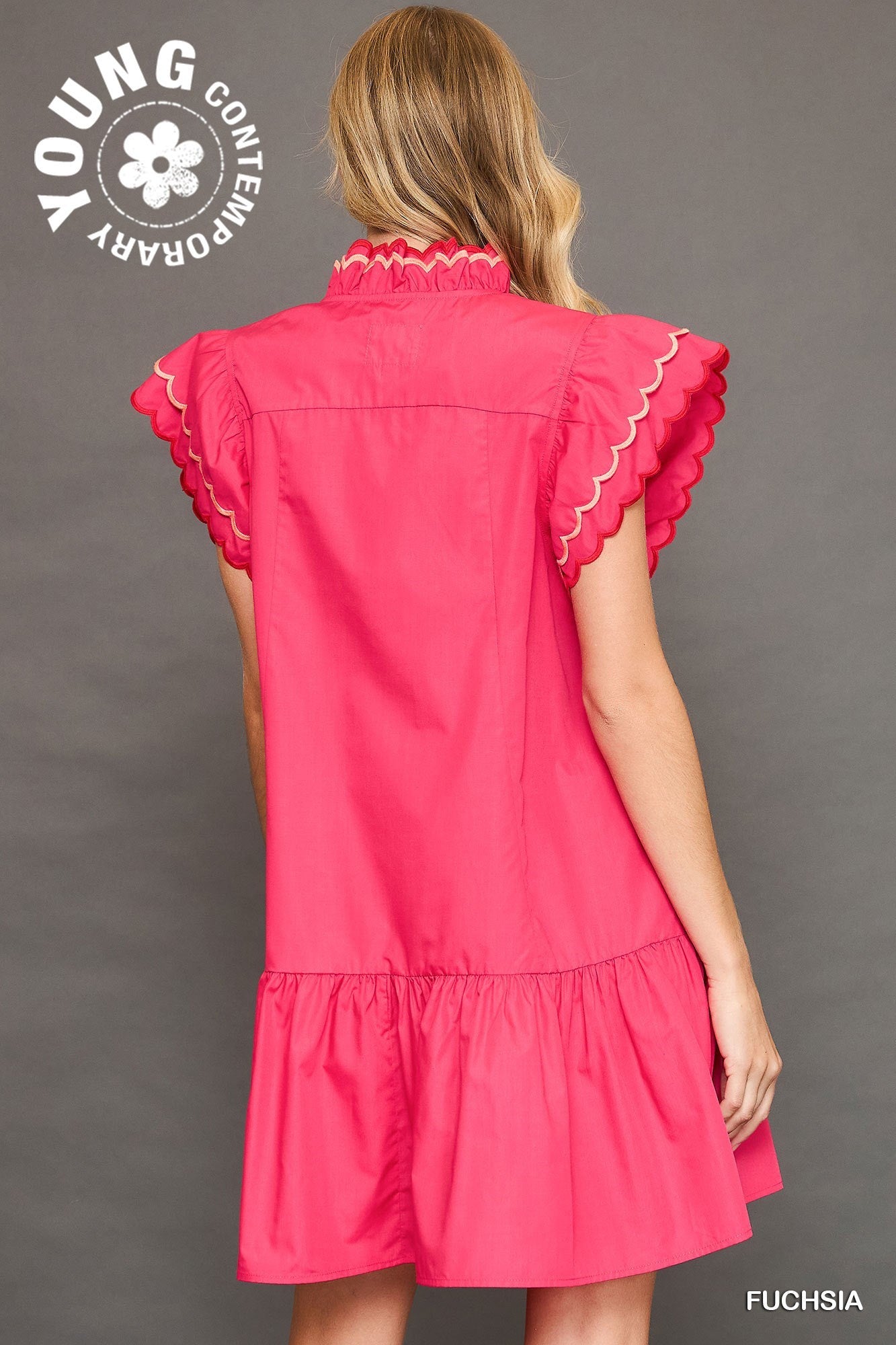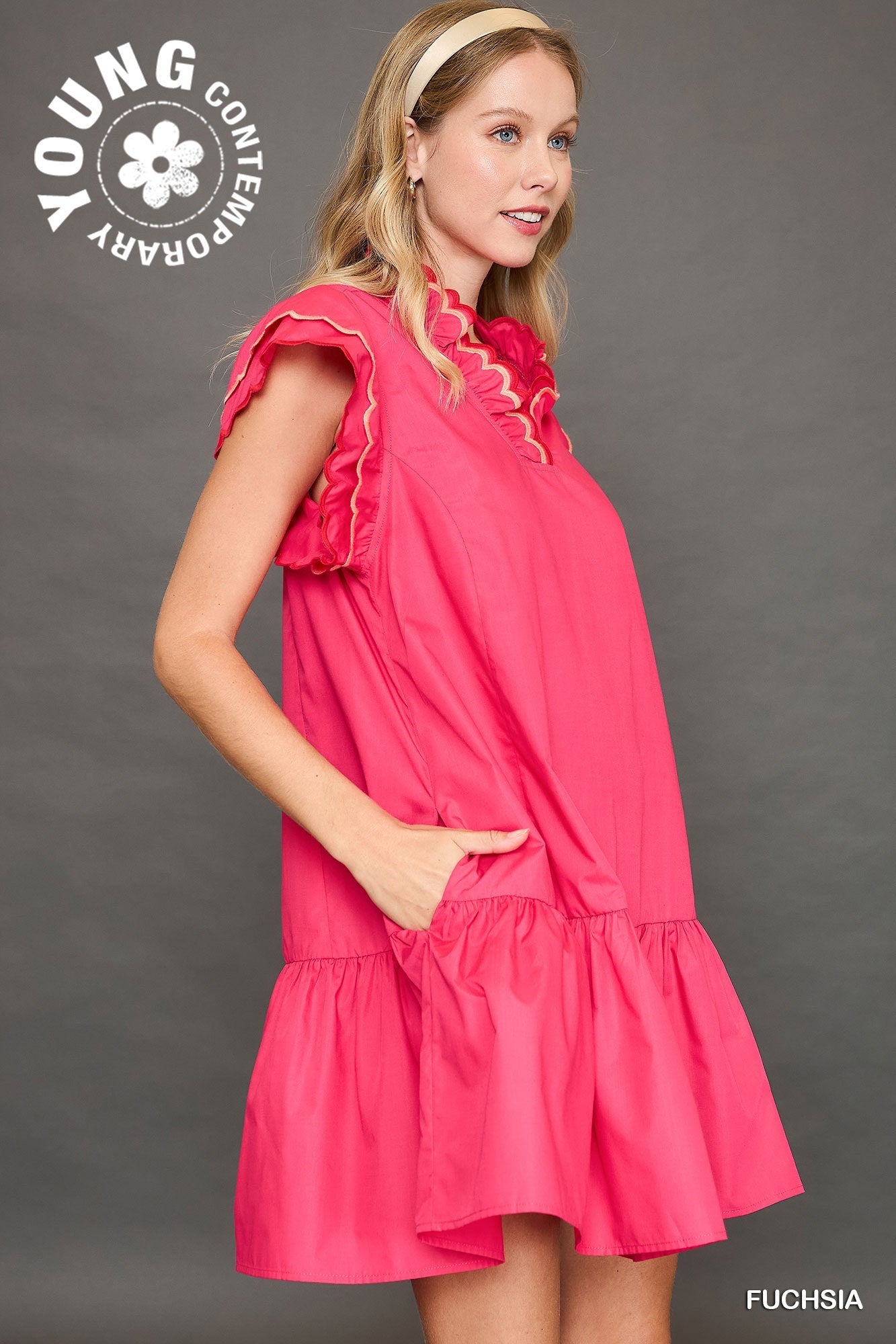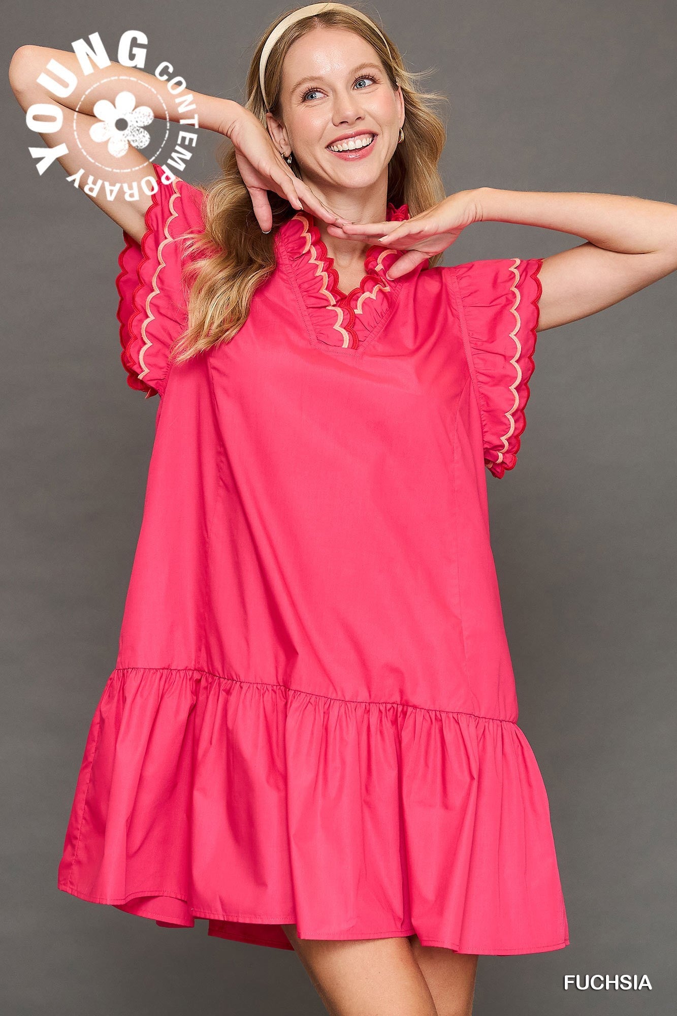Bright, bold, and effortlessly breezy - this fuchsia dress brings coastal charm to any warm weather outing. Designed with a flattering split neckline and scallop trimmed layer flutter sleeves, it features a flowy tiered hem and hidden side pockets for added ease. Lightweight and unlined, it's perfect for sun-drenched days and balmy beachside evenings.