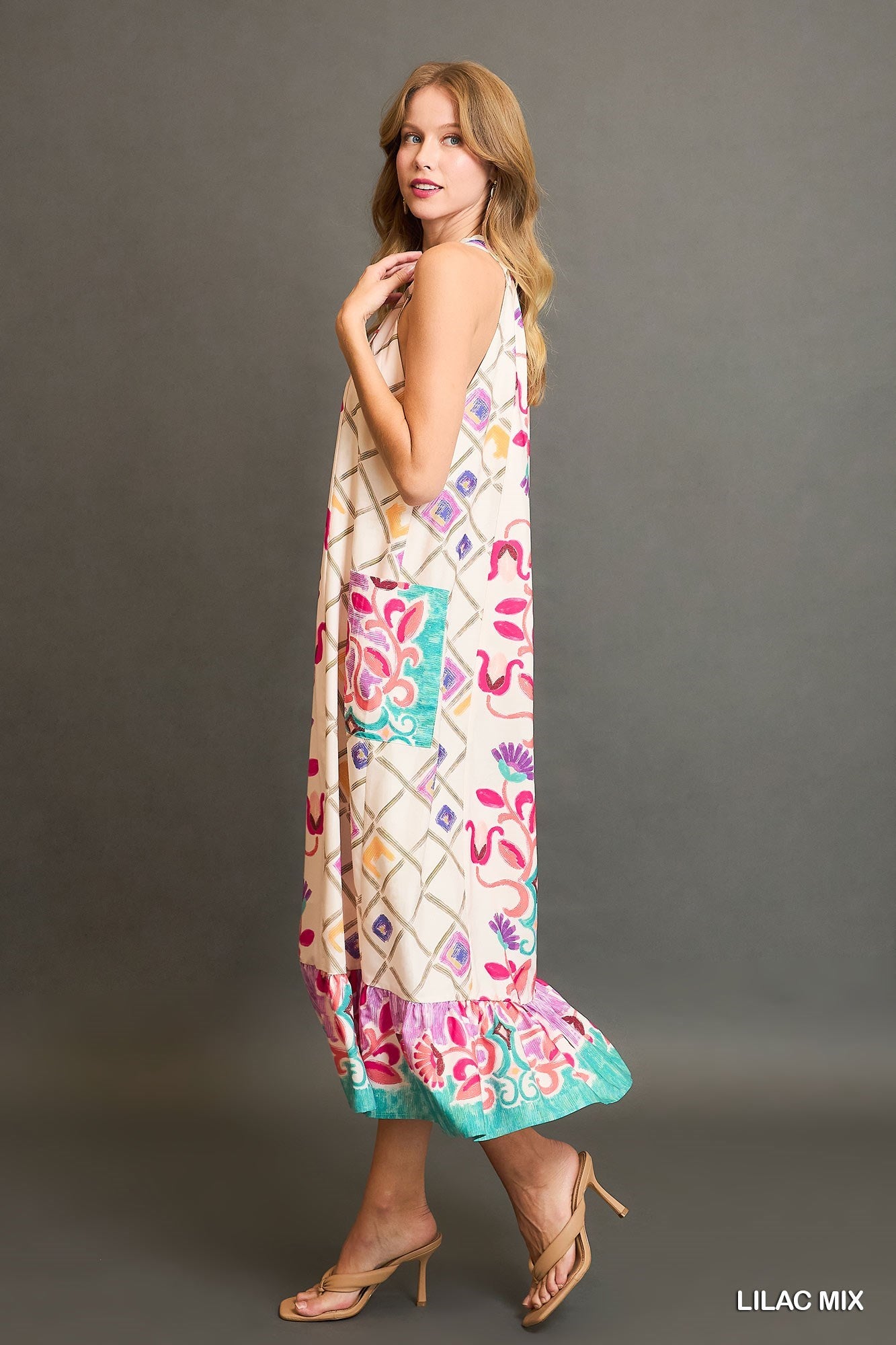 Breezy and beautifully bold, this halter neck maxi dress features a lilac mix of striking patterns for a standout coastal look. Designed with a ruffle-trimmed halter neckline, flowy full-length skirt, and hidden side pockets, it’s as practical as it is elegant. Fully lined for all-day comfort, this dress moves with grace and color — perfect for warm evenings, beach weddings, or sunset dinners by the shore.