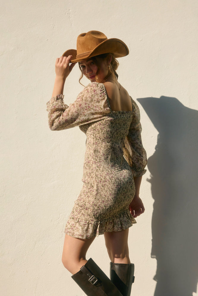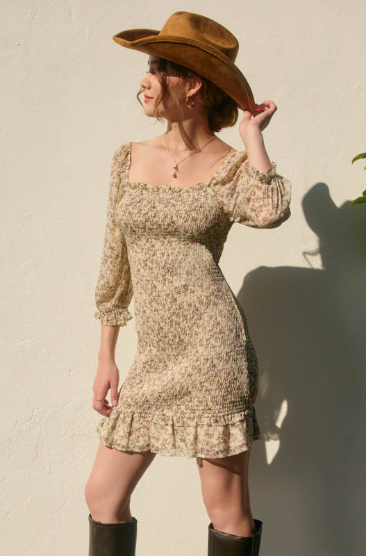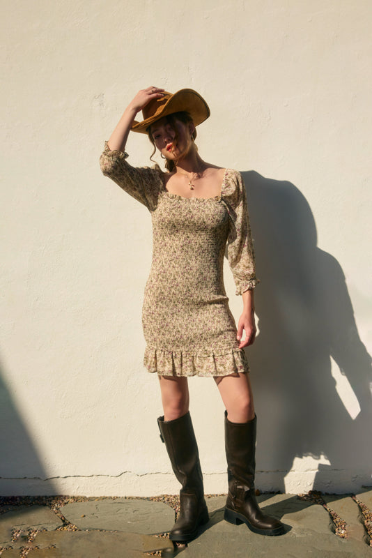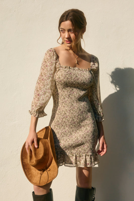 Bring a touch of seaside charm to your wardrobe with the Seabreeze Smocked Mini Dress. Adorned in a delicate ditzy floral print in soft, natural hues, this breezy favorite captures the essence of coastal romance. The elasticized square neckline and allover smocked bodice offer a flattering, easy fit, while the half puff sleeves and ruffle accents add a playful, feminine flair. Lightweight and effortlessly sweet, it’s the perfect mini for strolls by the shore, brunch with friends, or beachside sunsets.