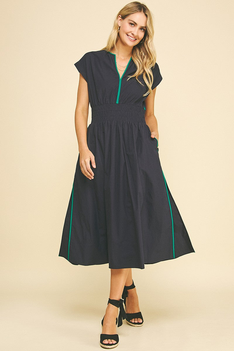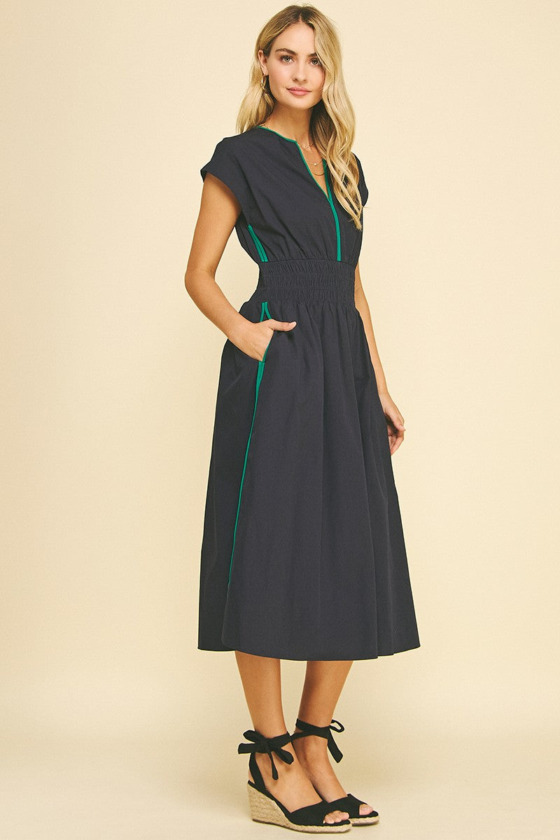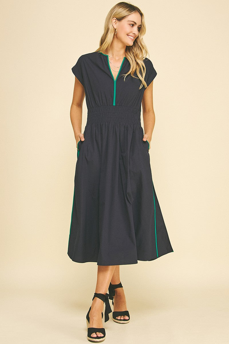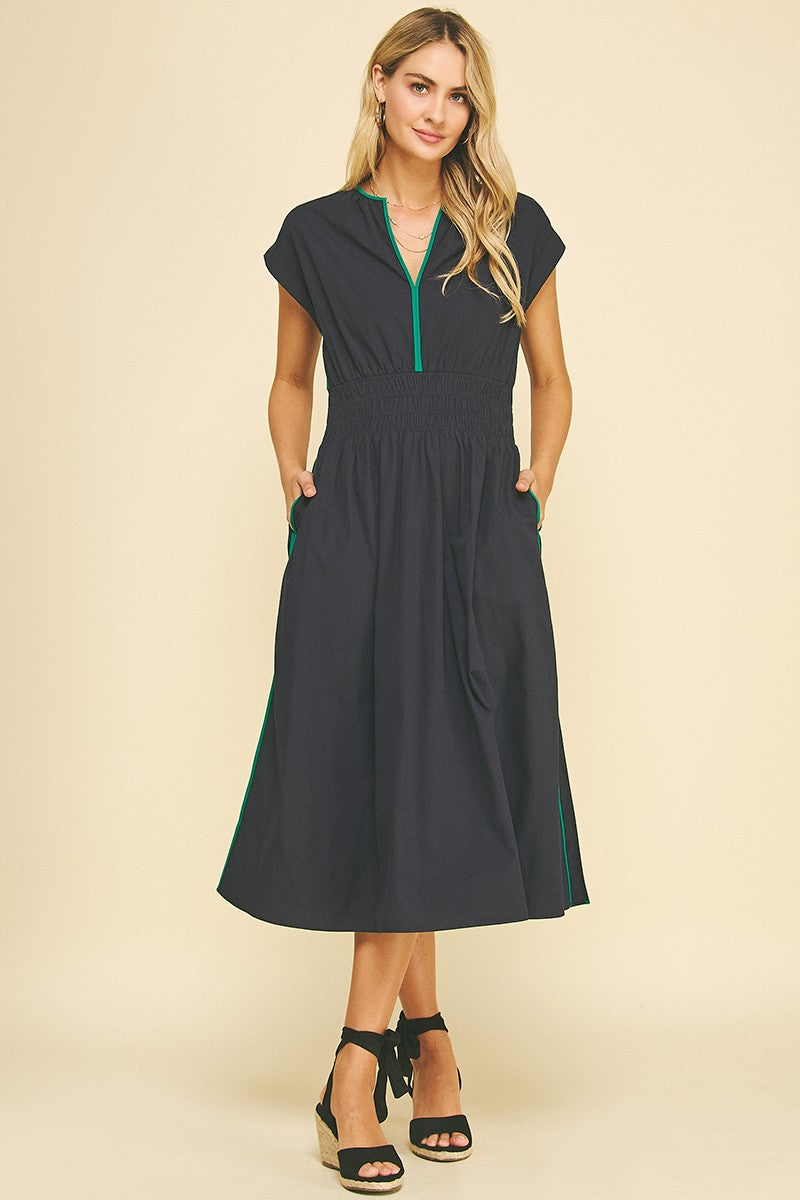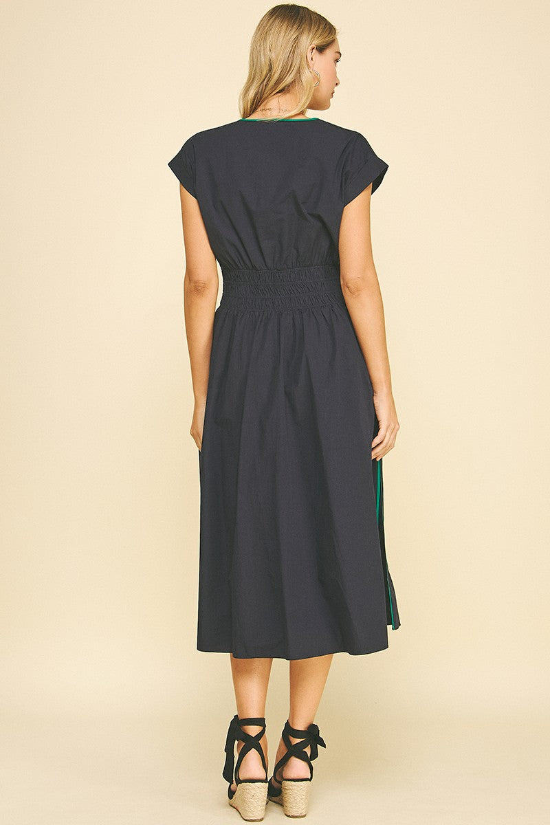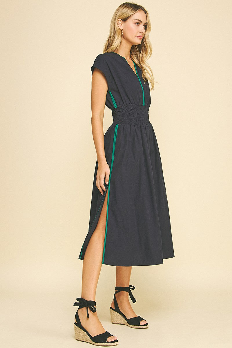 Make waves in our Tidebreak Color Block Midi Dress, where coastal ease meets effortless allure. Designed in a classic navy with eye-catching trim along the V-neckline, pockets, and side slits, this dress brings subtle contrast and standout detail. The thick elastic waistband flatters the figure while offering all-day comfort, and the midi length with flirty side slits adds just the right touch of movement. Finished with side pockets for everyday ease, this sleeveless favorite is perfect for beachside dinners, boardwalk strolls, or wherever the breeze takes you.