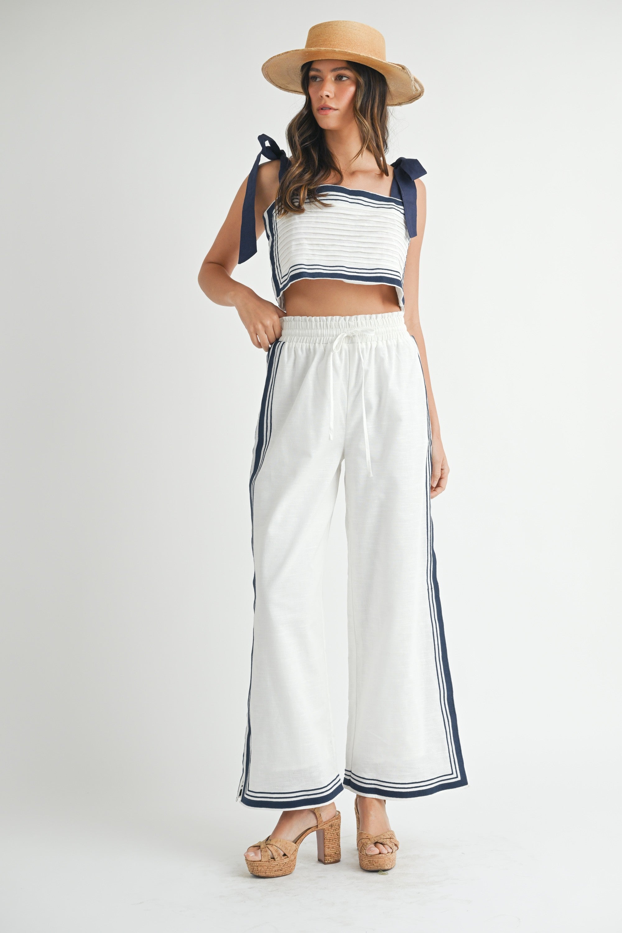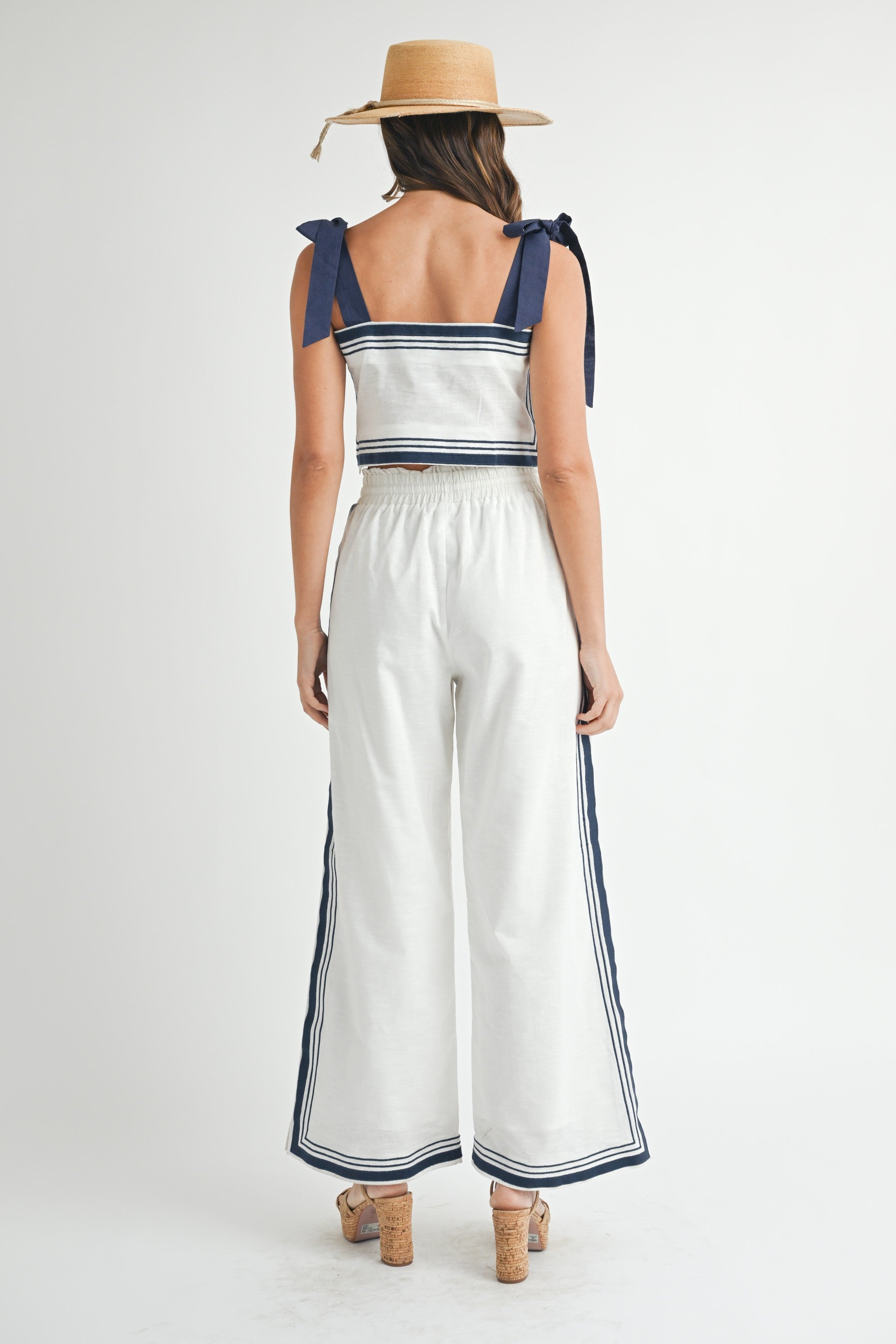 Set your sights on sun-drenched escapes in our Sail Away Set — a breezy two-piece ensemble inspired by the timeless appeal of coastal living. Crafted from a luxe linen-rayon blend, this nautical white set features a chevron sail-inspired crop top with charming self-tie shoulder straps and intricate navy embroidery that echoes classic sailor stripes. The matching wide-leg pants offer a relaxed silhouette with an elastic waistband for all-day comfort and ease.