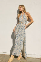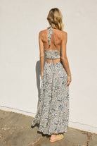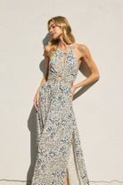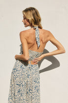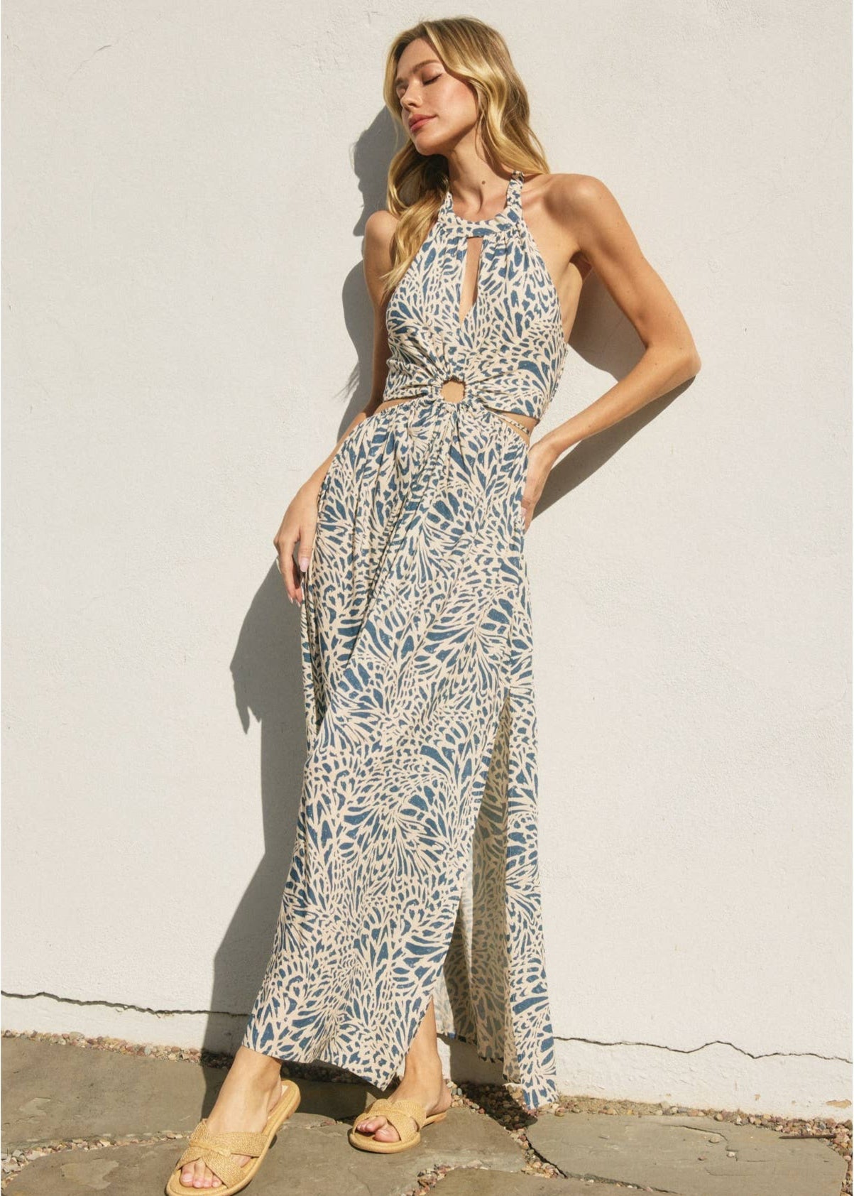 Printed halter neck dress with an O ring and cutouts. Model is 5'9" and wearing size Small. - Halter neck tie closure with keyhole detail - Smoked back panel - Side cutouts - O ring and string tie closure at the waist - Elastic waistband on the skirt - Partially lined Shell: 80% Rayon, 20% Linen Lining: 100% Rayon