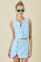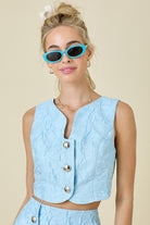 Turn heads in our Blue Jacquard Sleeveless Crop Top, crafted from textured jacquard fabric for an elevated, boutique-worthy look. Featuring a sleek cropped silhouette and charming front button details, this top pairs with your favorite denim or coordinates perfectly with the matching Blue Jacquard Mini Skirt (sold separately)