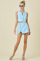 Coastal Blue Jacquard Sleeveless Crop Top with Button Detail