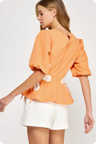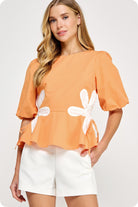 Tangerine Poplin Puff-Sleeve Blouse with Floral Accents