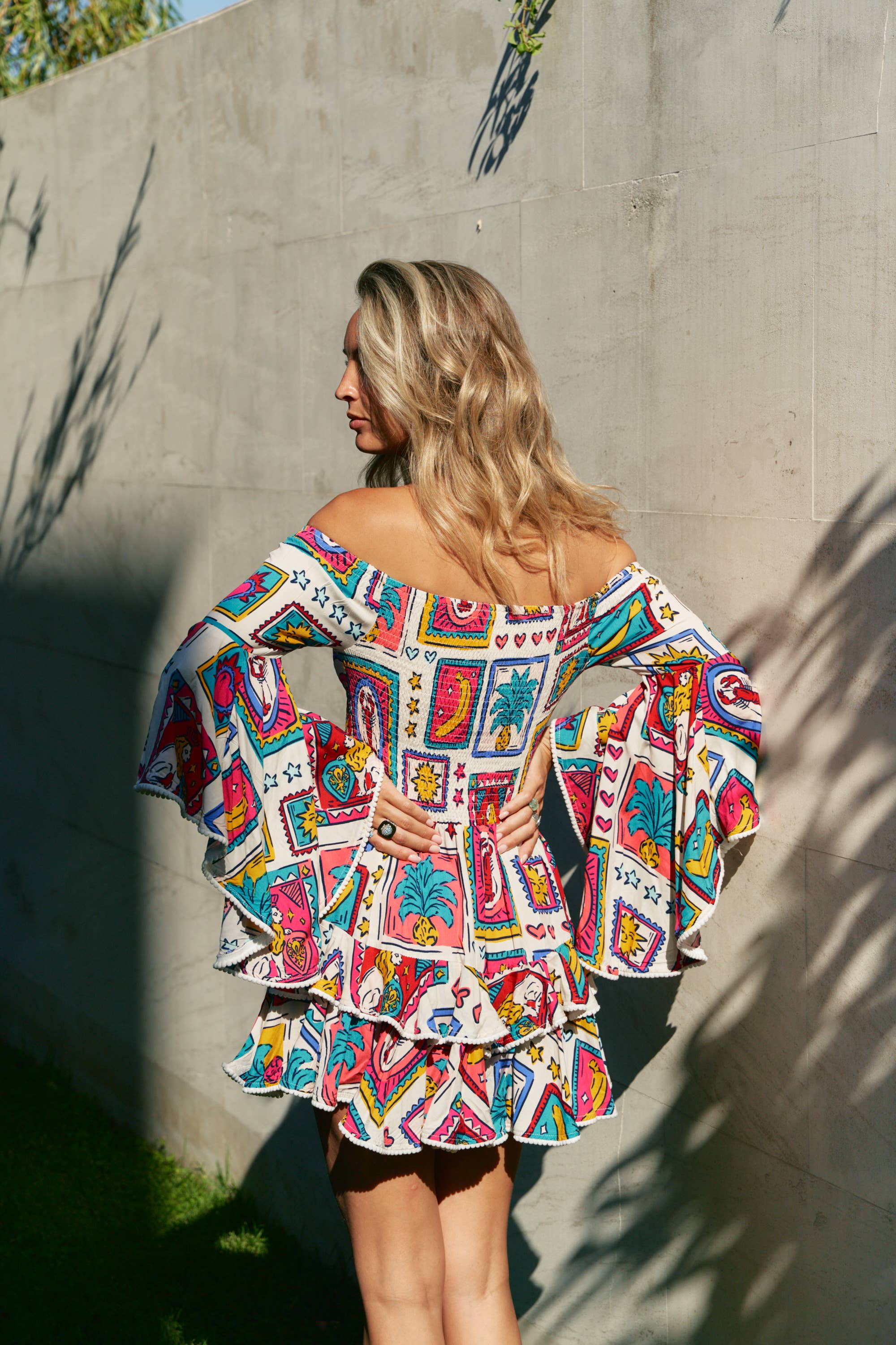Romantic, breezy, and made for golden hour moments, the Coastal Muse Off-the-Shoulder Mini Dress is the definition of seaside elegance. Featuring a Bardot neckline and a shirred bodice for a flattering, secure fit, this dress flows effortlessly with its dramatic bell sleeves and tiered mini skirt. The delicate crochet detailing adds an artisanal touch, evoking the charm of coastal escapes and barefoot dances under the stars. Light and airy in 100% rayon, it's the perfect piece for a flirty night out or a dreamy day by the sea.