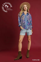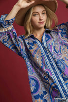 Elevate your coastal wardrobe with the timeless charm of our Paisley Print Button-Down Blouse. Designed with a classic collared neckline and delicate button-front closure, this blouse blends effortless sophistication with a relaxed coastal spirit. The long sleeves feature elastic ruffle cuffs for a feminine touch, while the lightweight rayon-nylon blend drapes beautifully for year-round wear. Its rich jewel-toned paisley print pairs perfectly with denim, skorts, crisp white pants, or shorts, making it a versatile piece for both casual days by the shore and evenings out. A true coastal classic that’s as vibrant as it is timeless.