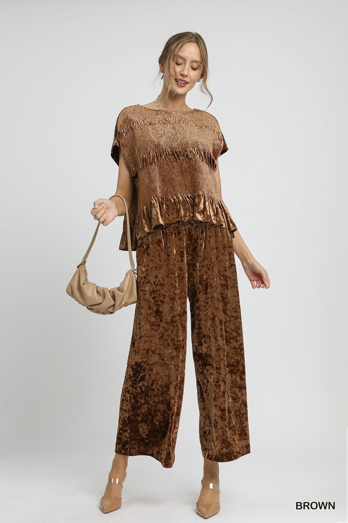 Wrap yourself in understated elegance with the Coastal Luxe Velvet Set. This rich brown velvet duo includes a smocked cap-sleeve top with ruffled hem and matching wide-leg pants featuring a comfortable smocked waistband and handy pockets. Designed for laid-back luxury, this set moves beautifully from daytime coastal strolls to candlelit seaside dinners. A timeless look with soft texture and effortless charm—perfect for year-round style by the shore.