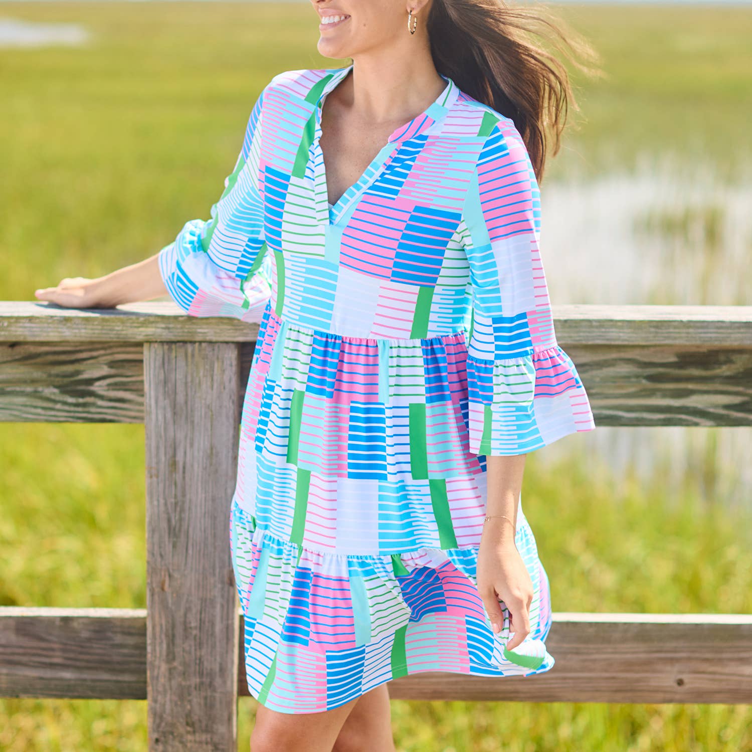 Back by popular demand, the Laguna Dress is the definition of effortless resort elegance. With its soft swirl of coastal blues and pinks, this slip-on favorite is made from breathable, lightweight fabric with built-in UPF 50+ sun protection—perfect for sunny getaways and warm days by the water. The flattering A-line silhouette features a tiered skirt and feminine 3/4 ruffle sleeves, creating a breezy, romantic look that flows from dockside afternoons to sunset dinners with ease.