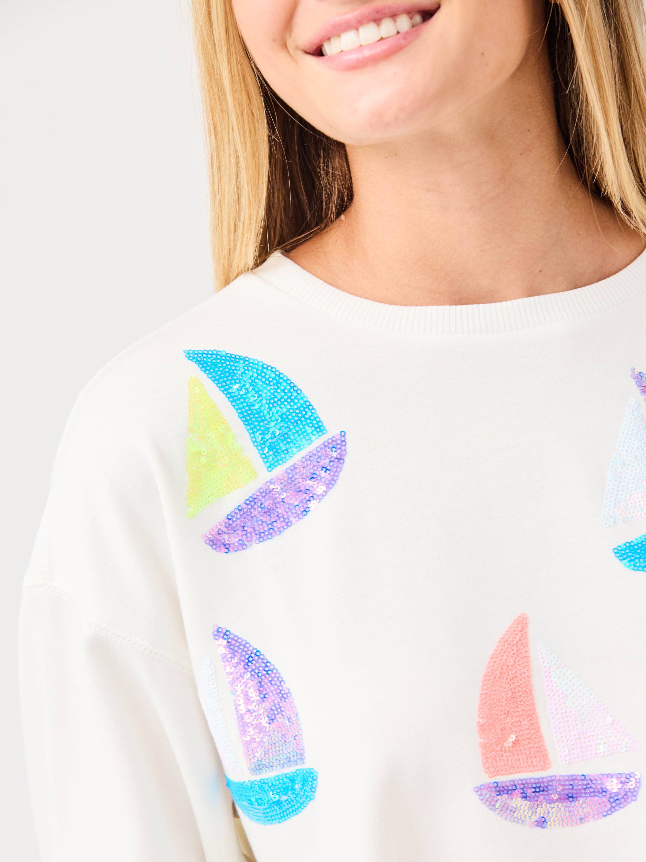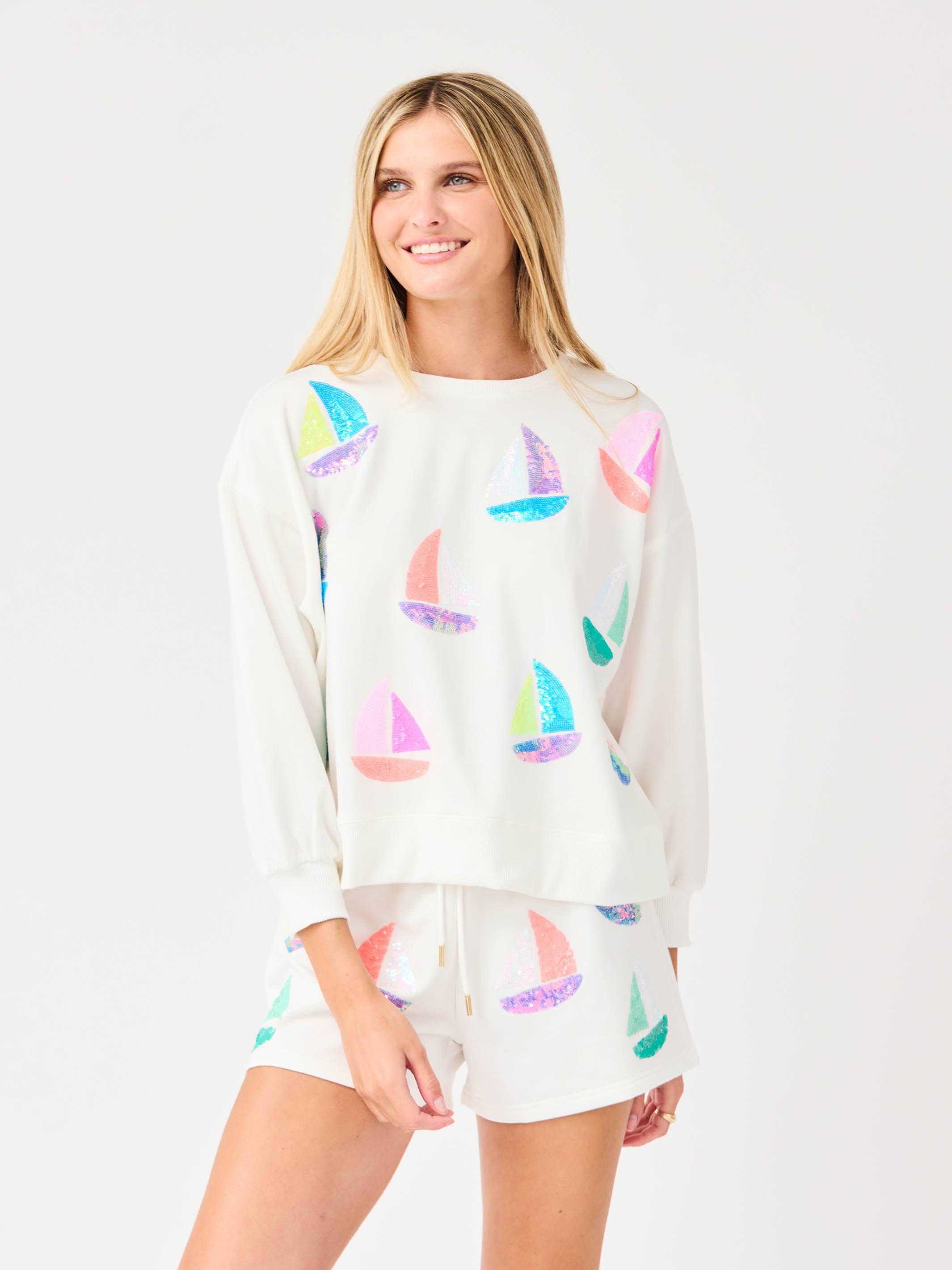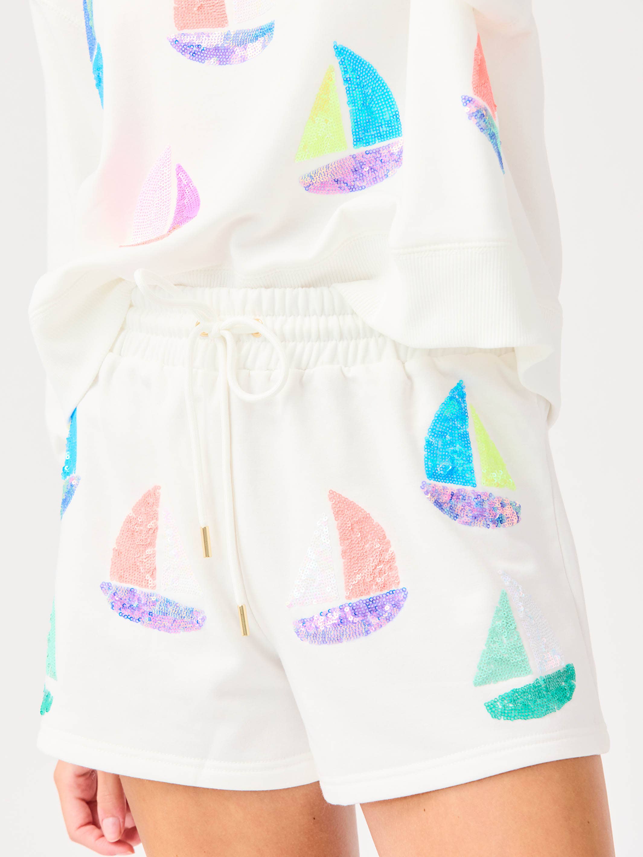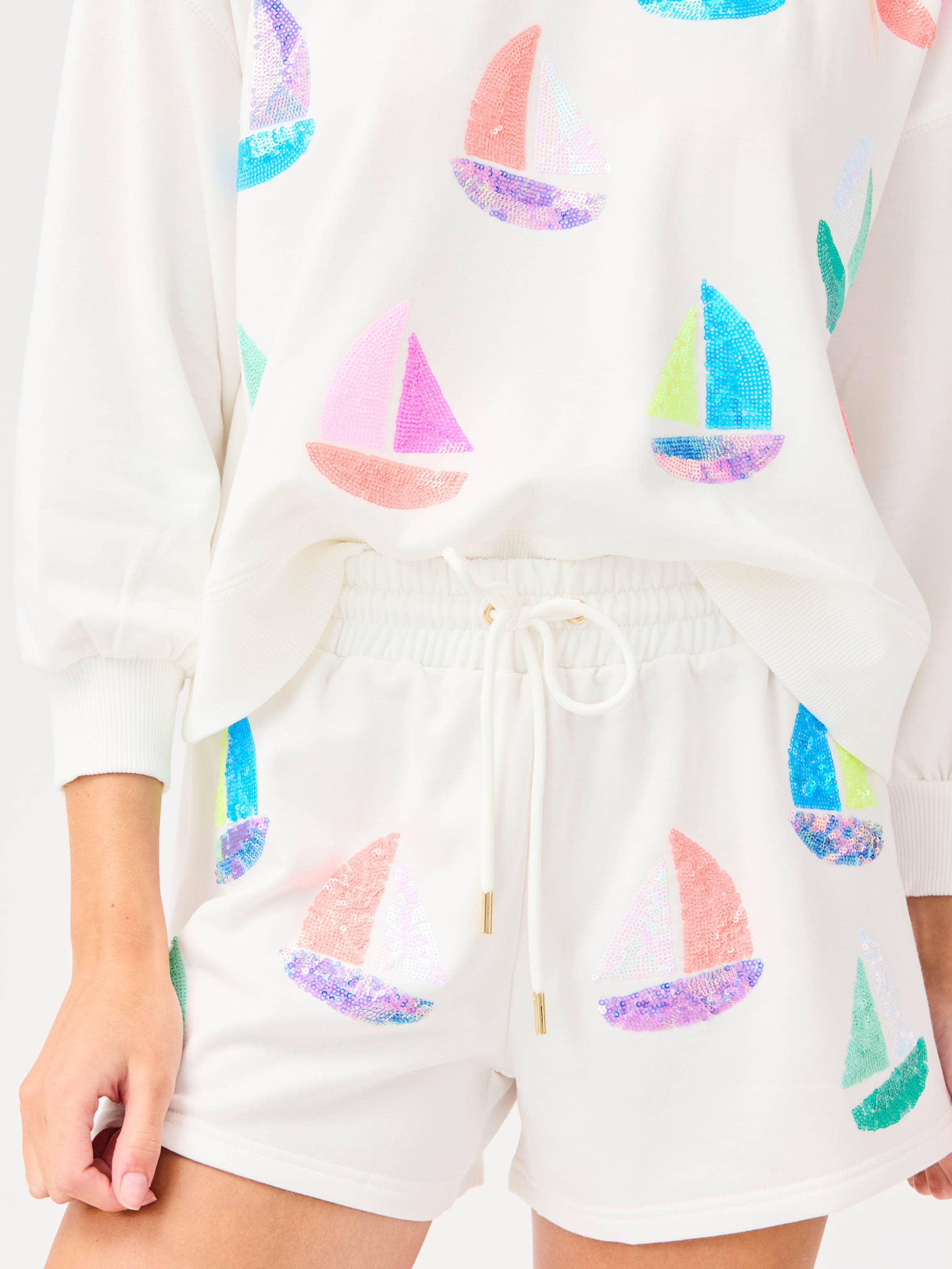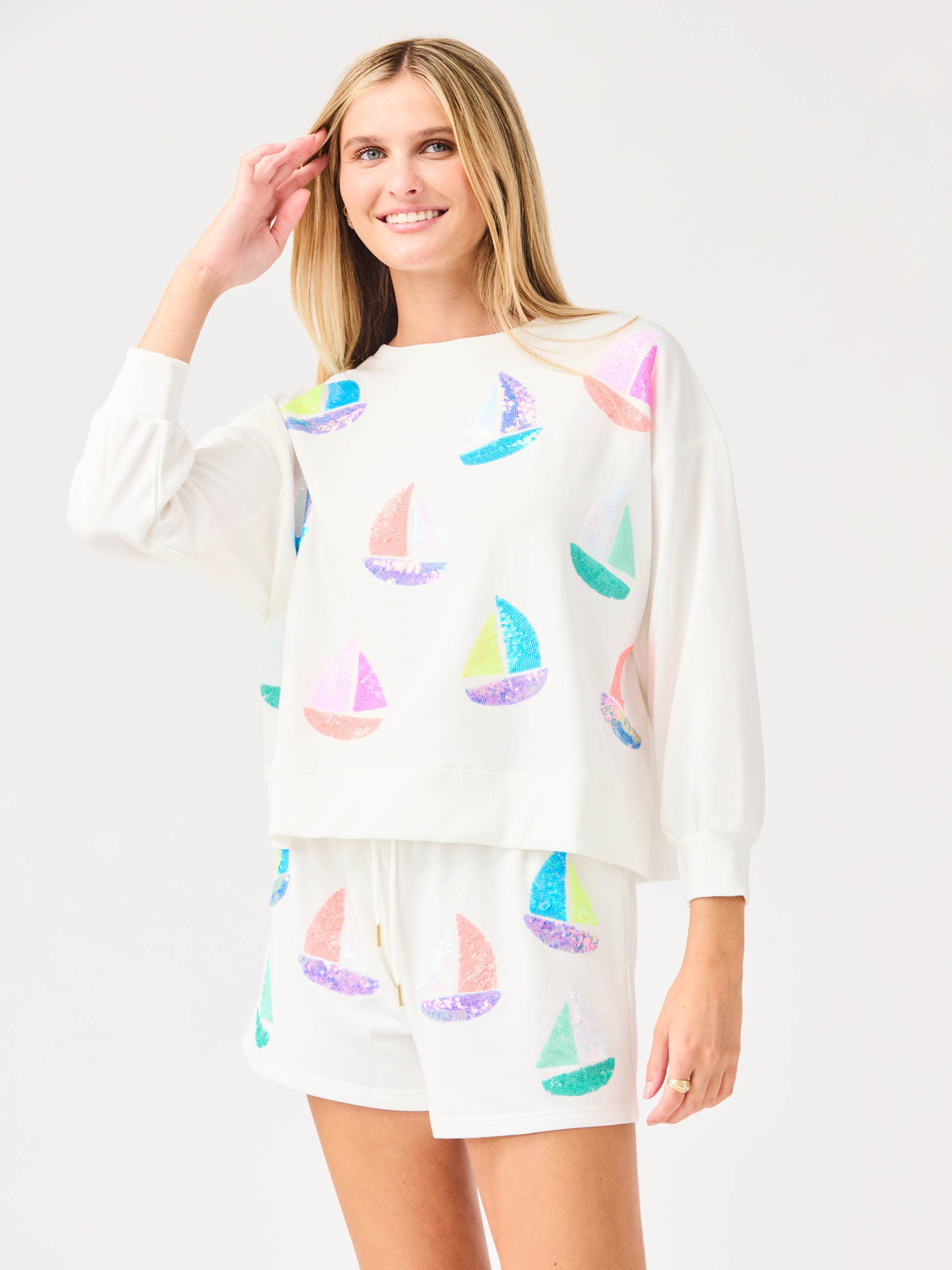 Make a statement on the shore or in the city with the exquisitely crafted Millie Set — a coastal favorite that blends playful charm with refined detail. This standout two-piece features shimmering sequin sailboat embroidery across the front for a whimsical nautical touch. The cropped sweatshirt stuns with full-volume sleeves and a relaxed silhouette, while the coordinating shorts feature a comfy drawstring waistband finished with luxe gold end caps. With its ultra-soft terry interior and effortless style, the Millie Set brings coastal glam to everyday lounging or breezy boardwalk strolls.