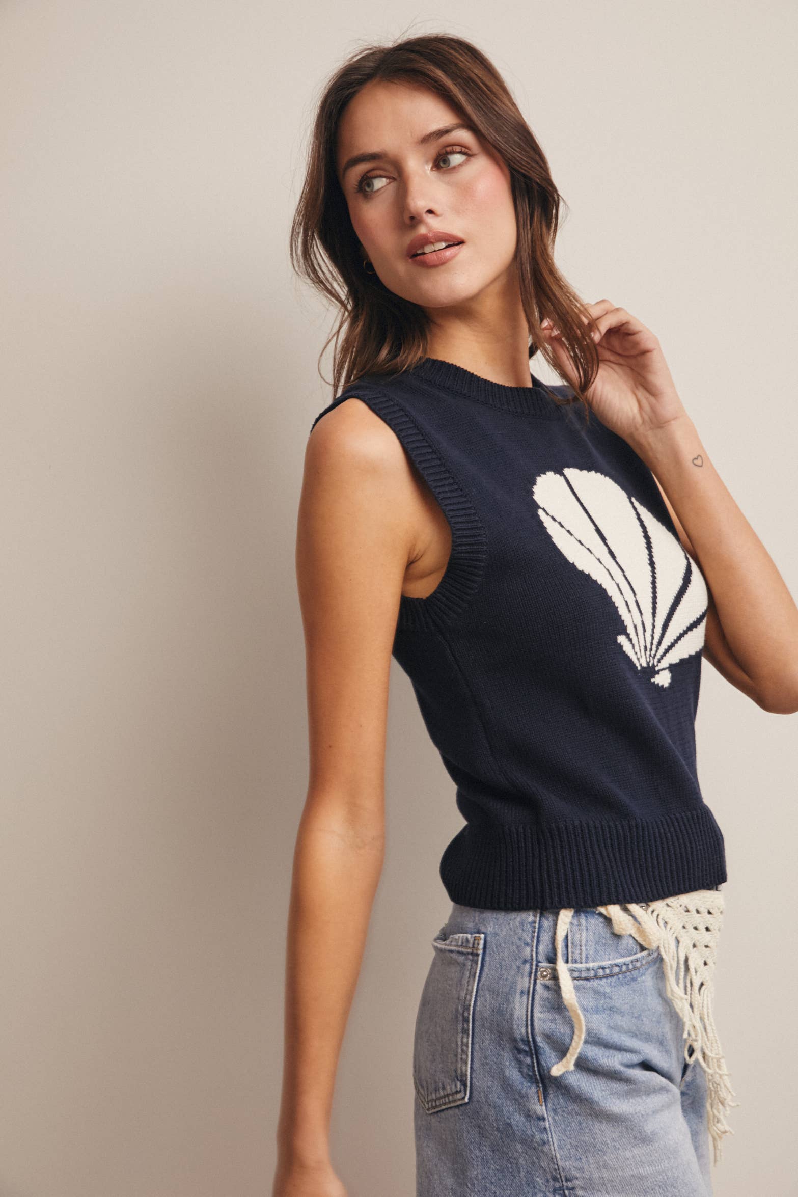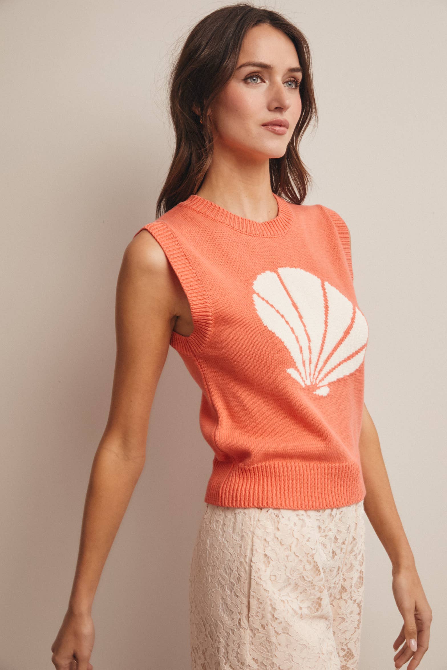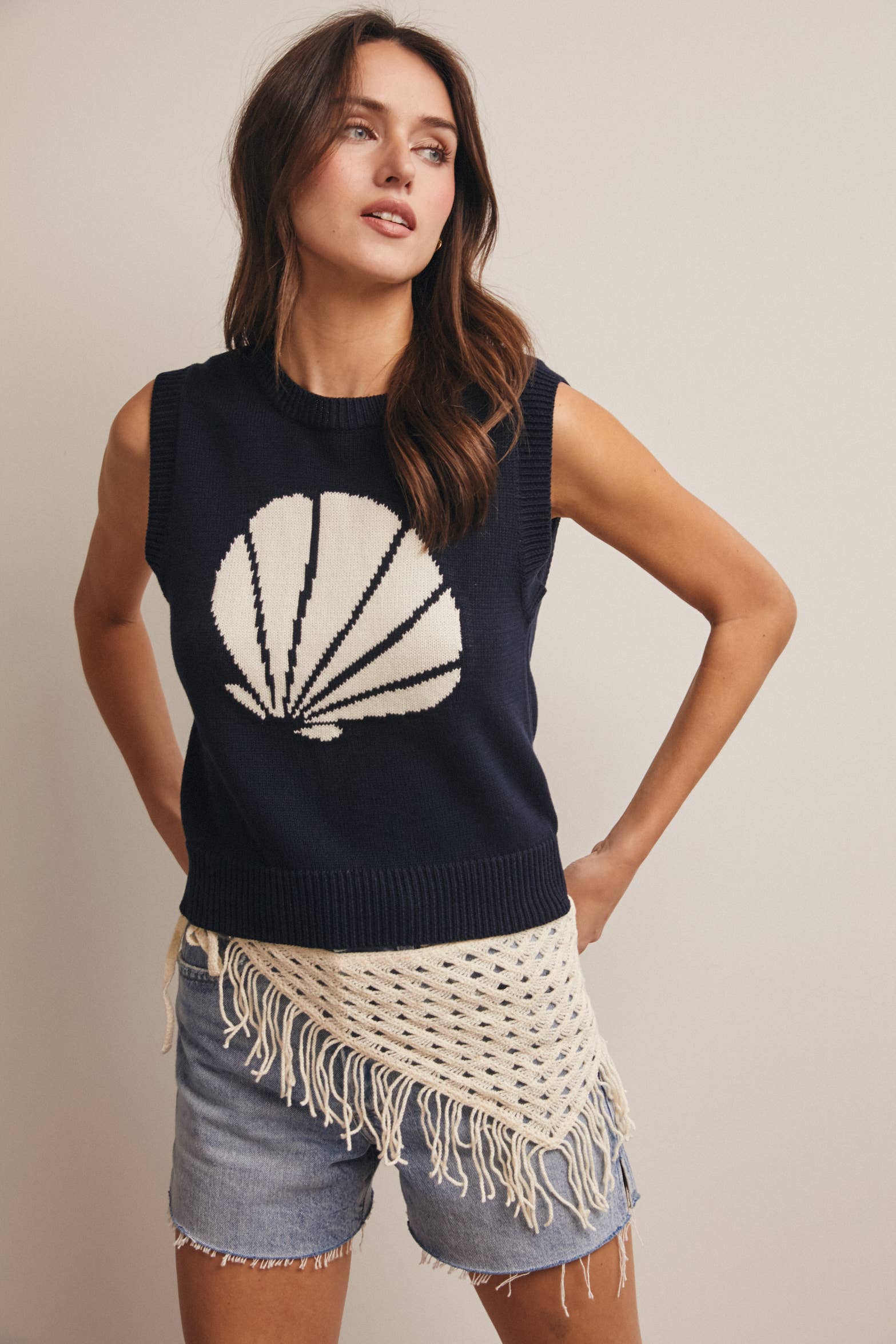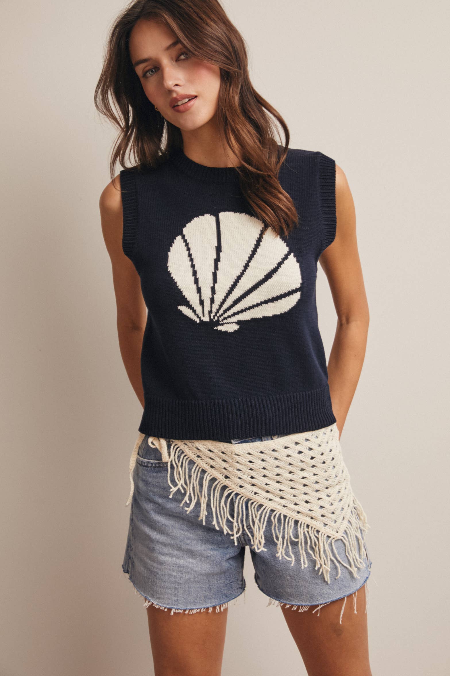 The bold intarsia shell graphic brings an elevated coastal charm, while the sleeveless silhouette makes layering easy over tanks, tees, or even lightweight dresses. Ribbed trim at the neckline, armholes, and hem adds structure and polish, and the straight waist-length hem creates the perfect proportion for pairing with denim shorts, flowy skirts, or relaxed summer sets.