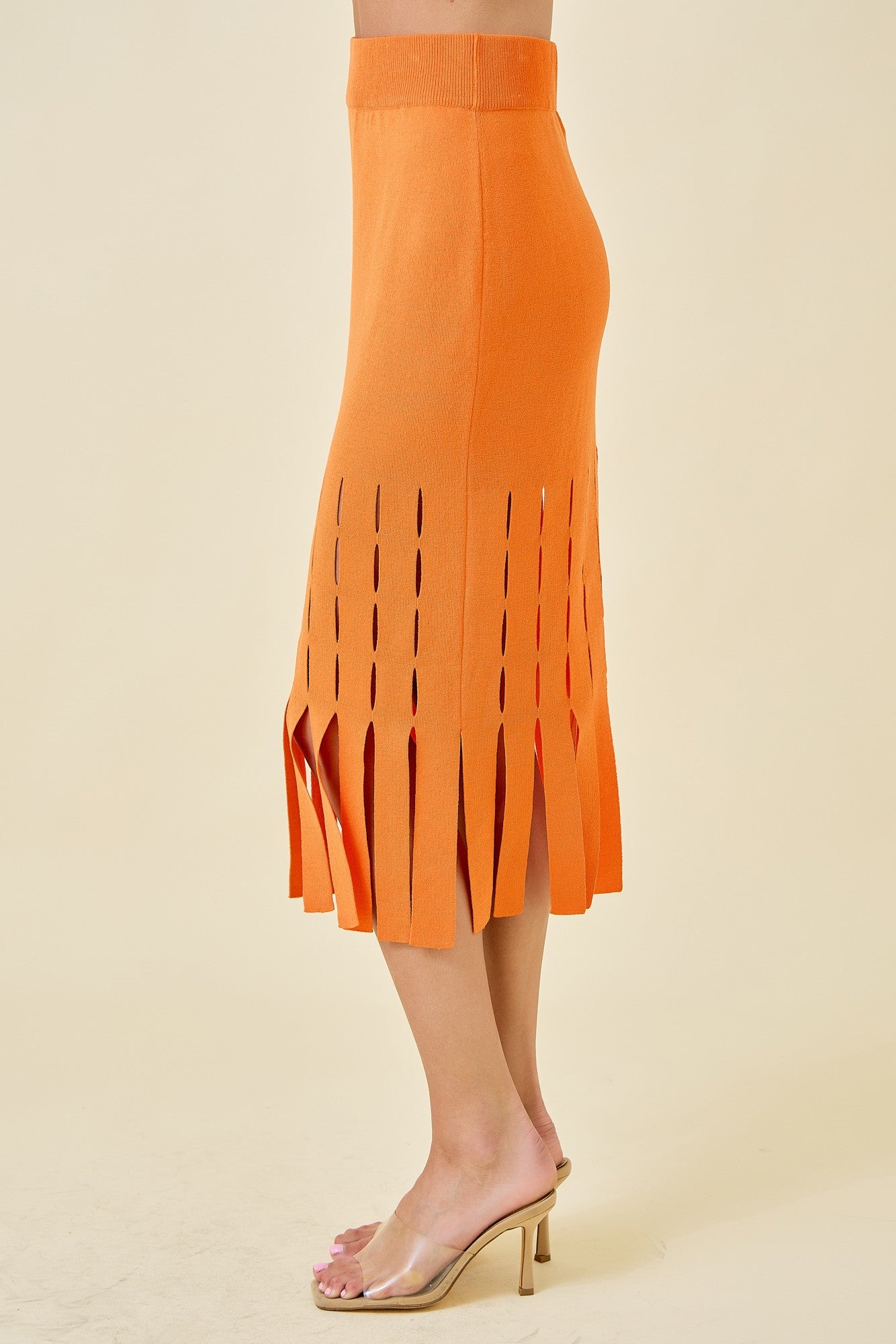 Meet the Sunset Fringe Coastal Set—a radiant, effortlessly chic two-piece designed to glow from sunrise to starlight. Drenched in a vibrant tangerine-apricot hue that channels golden summer skies, this sweater-knit duo features a sleeveless cropped tank top with playful fringe at the hem, perfectly paired with a matching midi skirt adorned in coordinating fringe detail.