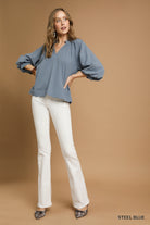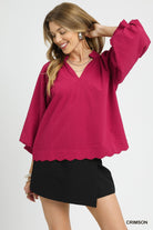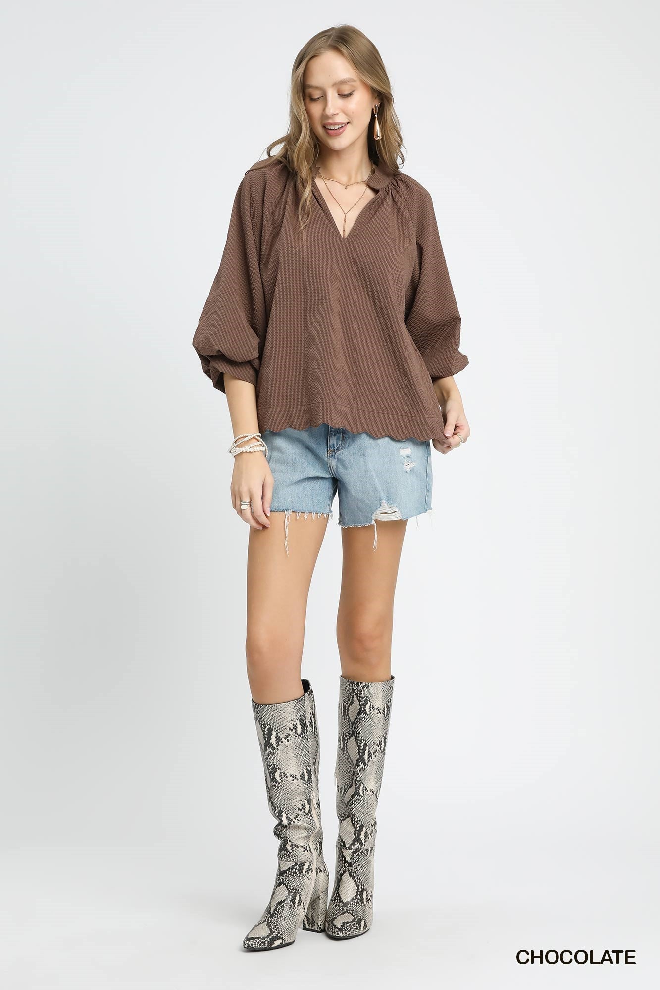 Meet your new all-season favorite—the Isla Scallop Blouse. This effortless essential features a soft, textured fabric, a flattering V-neckline, and three-quarter balloon sleeves for the perfect touch of coastal charm. Designed with a relaxed, flowy fit and a subtle scalloped hemline, it pairs beautifully with everything from shorts and skorts to denim, trousers, and skirts.