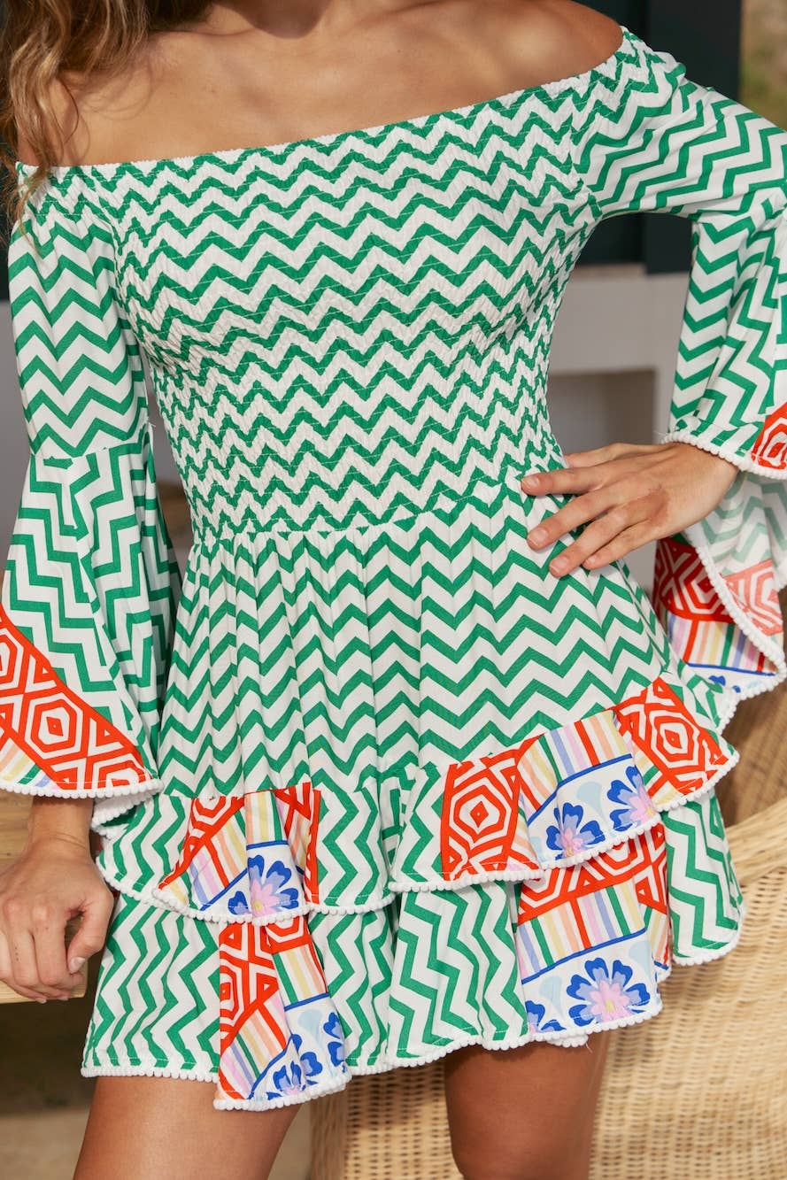 Bold, breezy, and bursting with personality, the Ziggy Za Off-the-Shoulder Mini Dress is your coastal night-out essential. Featuring a striking Ziggy Za print, this playful mini stuns with a romantic Bardot neckline, a flattering shirred bodice, and dramatic bell sleeves that add effortless flair. The multi-tiered skirt moves with you, while delicate crochet detailing lends an artisanal, beach-chic touch. Made from lightweight rayon, it’s perfect for warm seaside evenings, barefoot dancing, and unforgettable island moments.