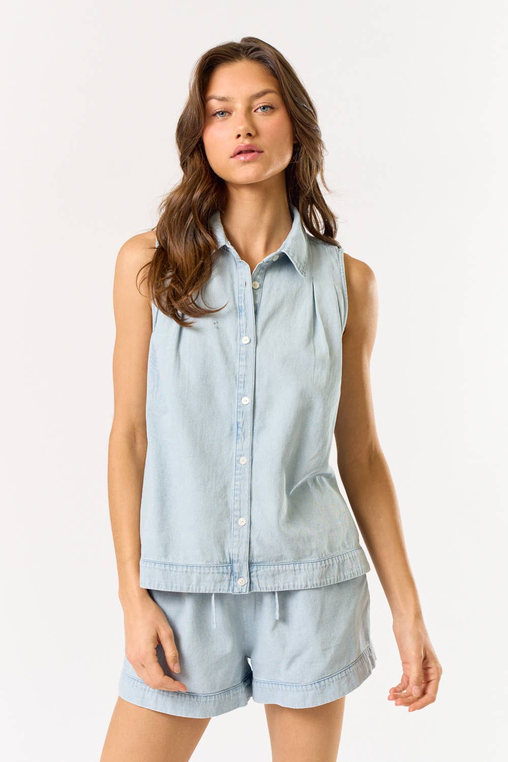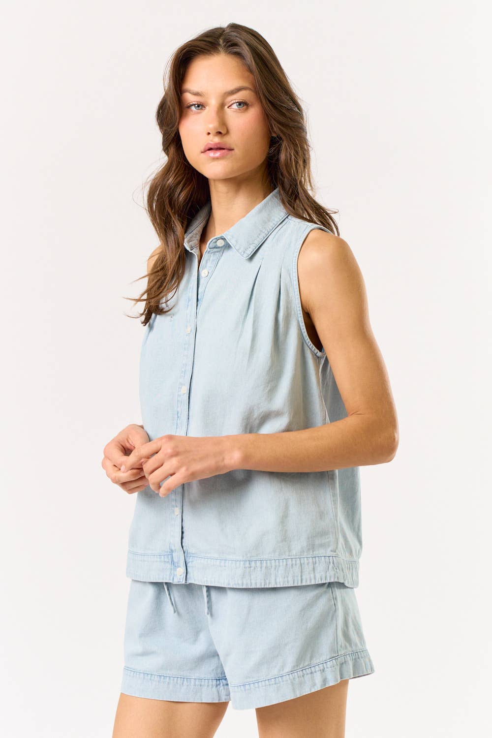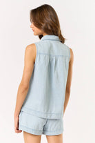 Breezy and bold with a nod to nautical charm, this sleeveless collared denim top is the perfect piece for sun-drenched days. Featuring a classic button-down front and structured yet soft feel, it’s both polished and playful. Whether you're exploring the coast or catching brunch dockside, this top brings effortless style to your summer wardrobe. Pair it with the matching Sail Away Shorts for a coordinated set that’s laid-back, coastal, and totally on trend.