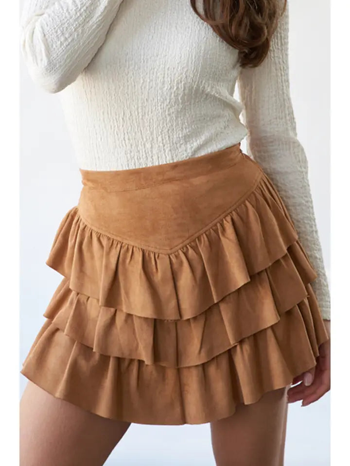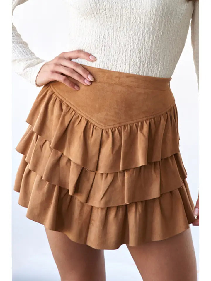 Channel warm coastal tones and effortless elegance with the Sandswept Tiered Suede Mini Skirt. Designed in a rich camel hue, this soft suede-look piece features a flattering V-shaped waistline, tiered layers for added texture and movement, and a sleek invisible side zipper for a clean finish.