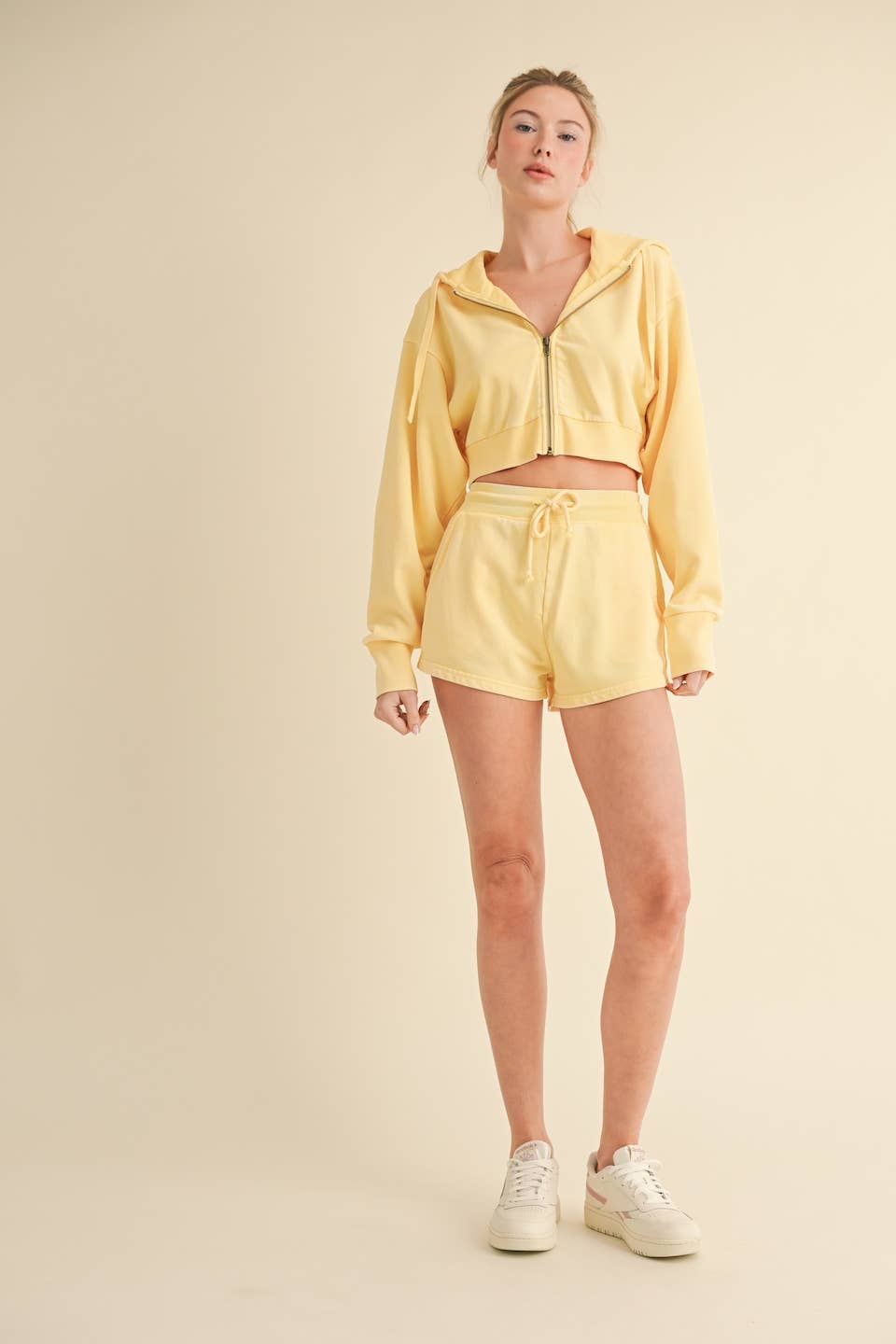 Breezy, bright, and effortlessly cool — the Lemon Haze Mineral Wash Shorts are your go-to for laid-back, sunny-day vibes. Made from soft cotton French terry, these easy-fit shorts feature a comfy drawstring waistband and handy side pockets for that perfect mix of function and style. The unique mineral wash in a cheerful lemon hue adds a fresh, lived-in look. Pair them with the matching Lemon Haze Cropped Hoodie for the ultimate cozy-coastal set you’ll want to live in all season long.