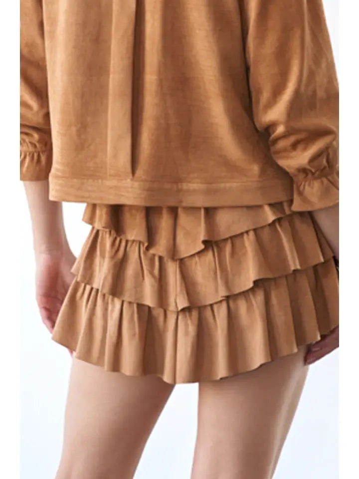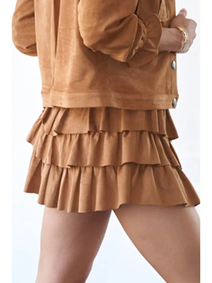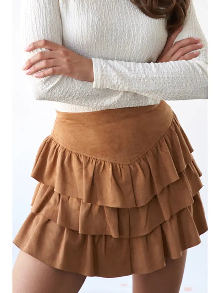 Channel warm coastal tones and effortless elegance with the Sandswept Tiered Suede Mini Skirt. Designed in a rich camel hue, this soft suede-look piece features a flattering V-shaped waistline, tiered layers for added texture and movement, and a sleek invisible side zipper for a clean finish.