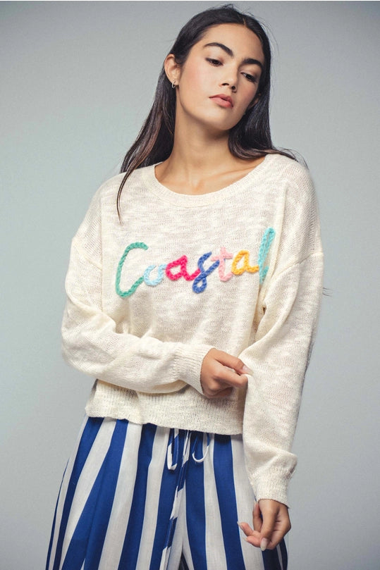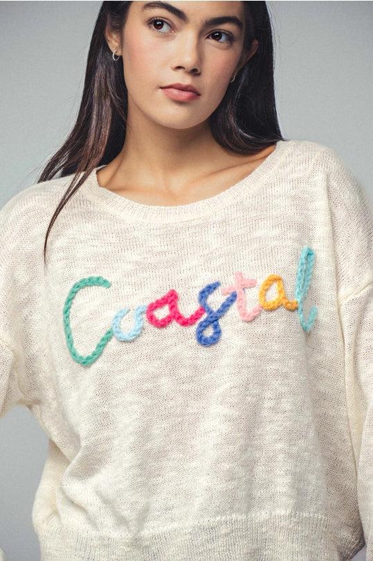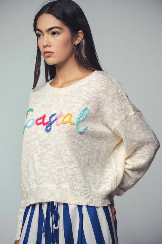 Bring playful tropical vibes to your look with this lightweight off-white sweater top, featuring the word "Coastal" in cheerful rainbow hues. The breezy knit makes it perfect for warm-weather layering — whether you're beach-bound, brunch-ready, or catching a coastal sunset. Soft, relaxed, and full of feel-good energy, it’s a must-have for your Pura Coastal collection.