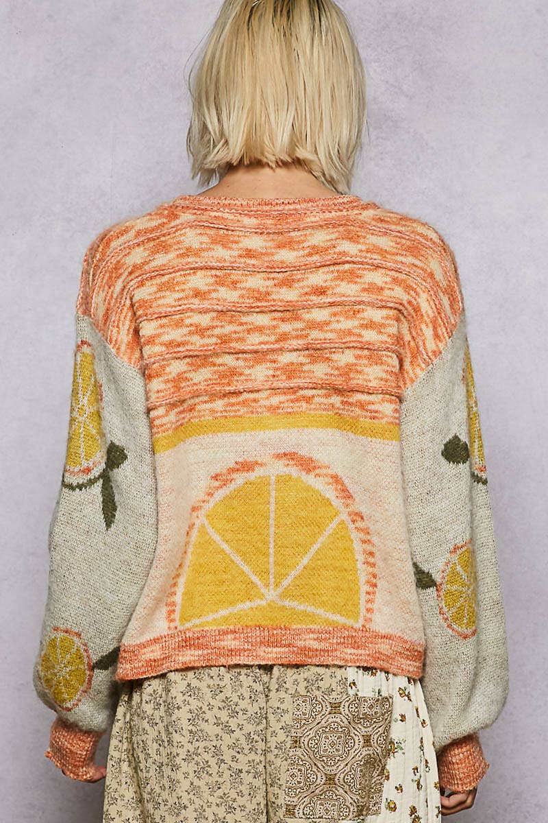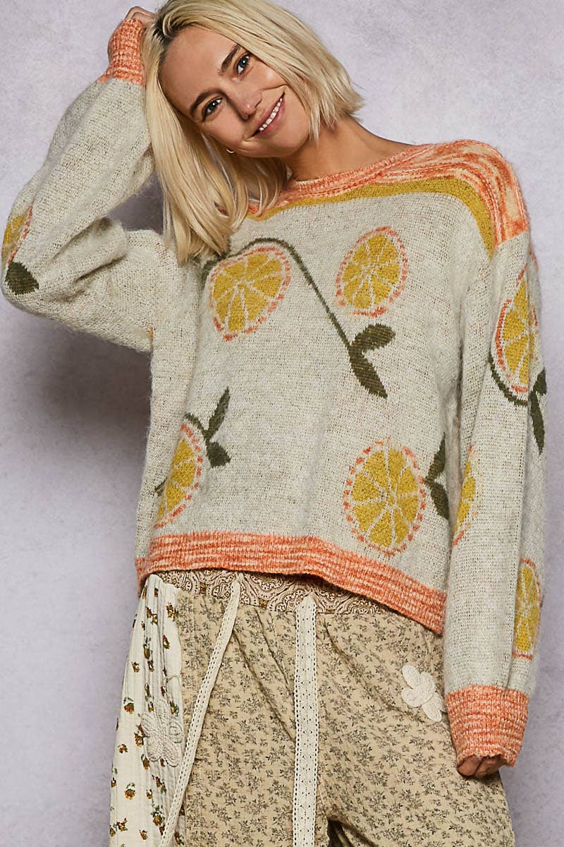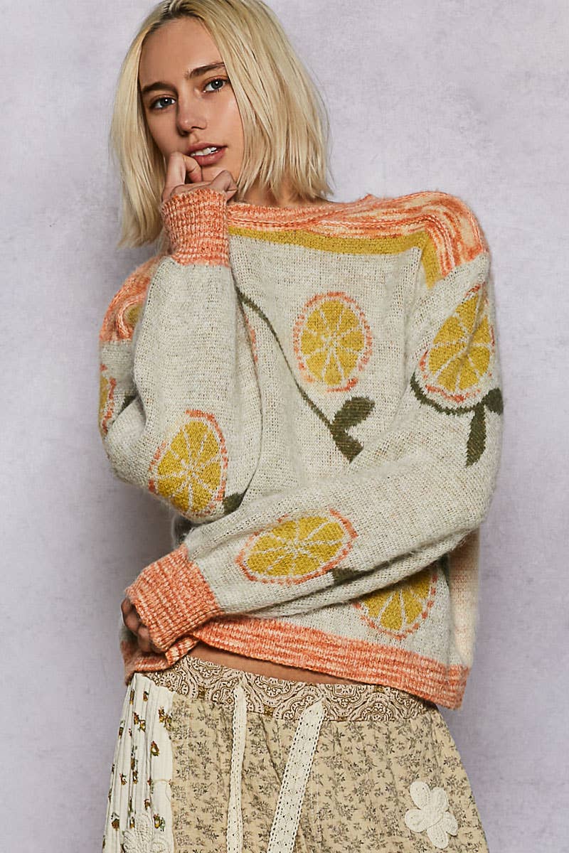 Fresh, fun, and full of charm, this cream-based sweater is adorned with a vibrant fruit motif in sunny yellows, bright oranges, and refreshing greens. Designed with a classic round neckline, long sleeves, and a regular fit, it’s finished with playful multicolored ribbed accents for a lively coastal touch. Crafted in soft acrylic, this beautiful knit is perfect for adding a pop of personality to your wardrobe—pair it with jeans, skorts, or shorts for a look that’s as bright and breezy as a day by the shore.