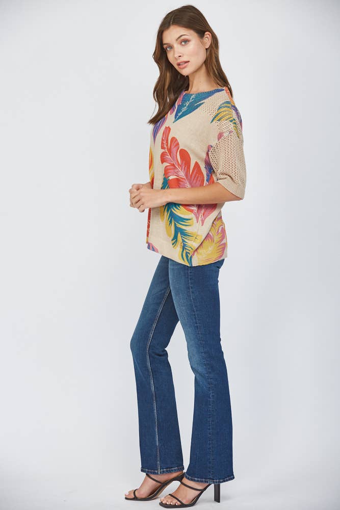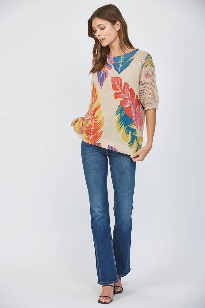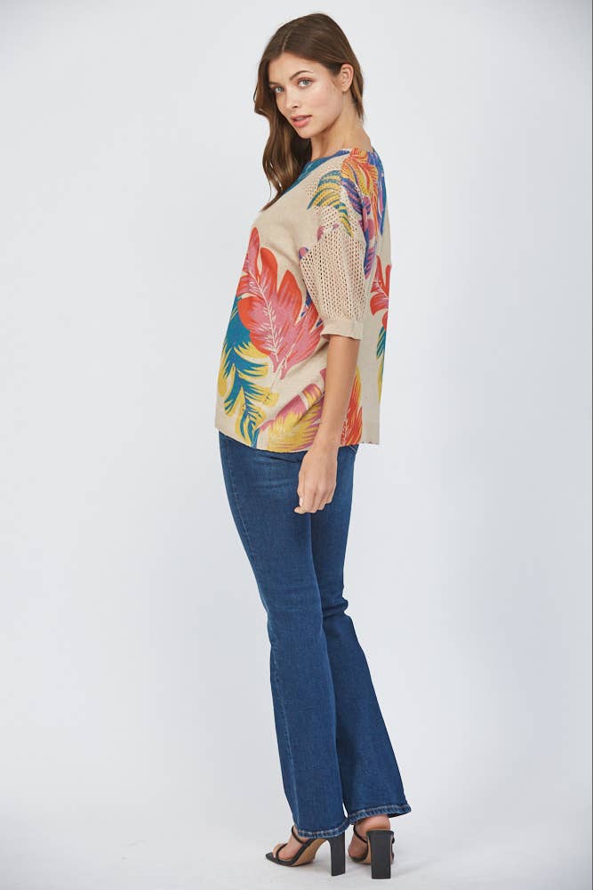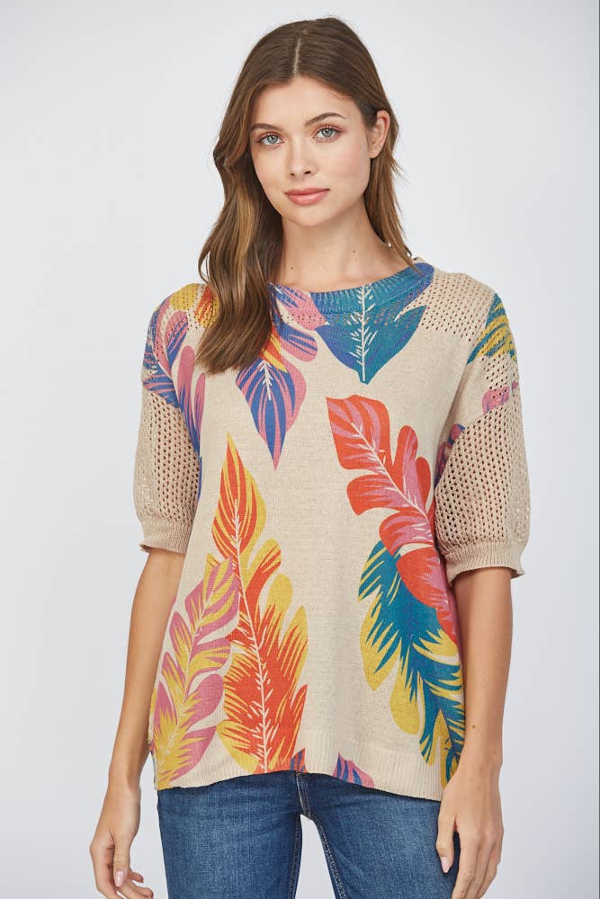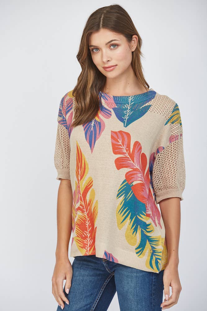 Bring a touch of paradise to your wardrobe with our Tropical Glow Open-Knit Short Sleeve Sweater. Featuring a vibrant mix of jewel-toned hues in a breezy open-knit design, this piece perfectly balances comfort and color. Its relaxed fit and airy sleeves make it ideal for layering through every season — pair it with jeans, shorts, or a skort for an effortlessly chic look. Lightweight yet cozy, this tropical-inspired sweater is your year-round go-to for laid-back coastal charm and radiant style.