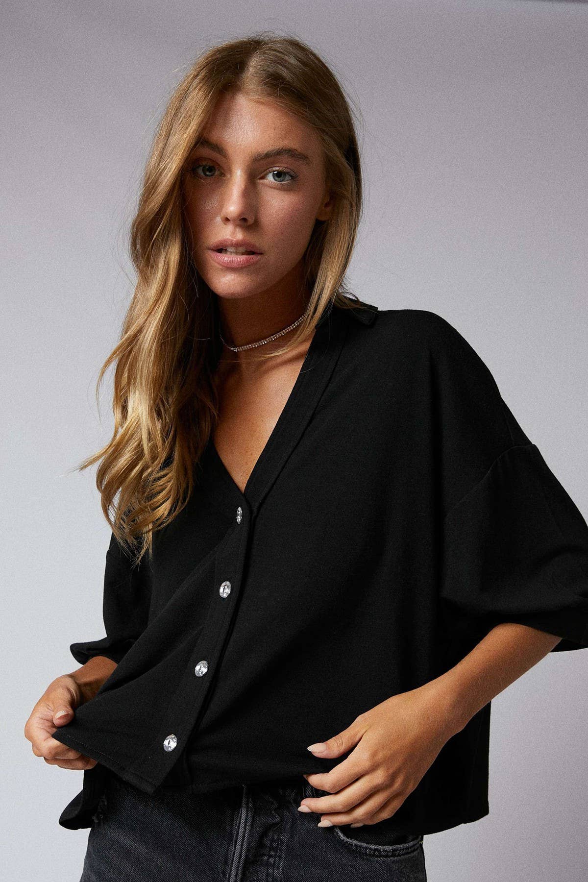 Simple, striking, and endlessly versatile—the Shoreline Chic Button Crop in classic black is your new go-to for effortless coastal style. Featuring a flattering V-neckline, elbow-length sleeves, and eye-catching rhinestone buttons, this cropped silhouette pairs perfectly with all your favorite printed pants, especially those with black, white, or vibrant hues. Soft, stretchy fabric offers all-day comfort while the polished design keeps you looking put-together from dockside brunches to sunset boardwalk strolls. It's that perfect blend of sleek and seaside.