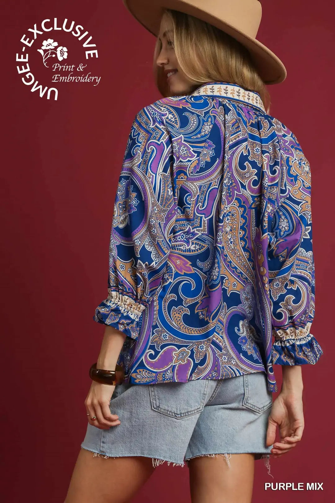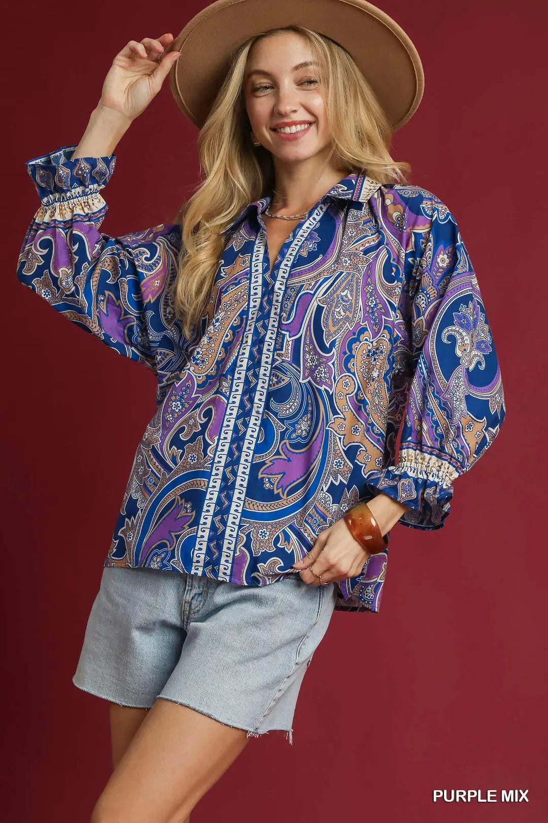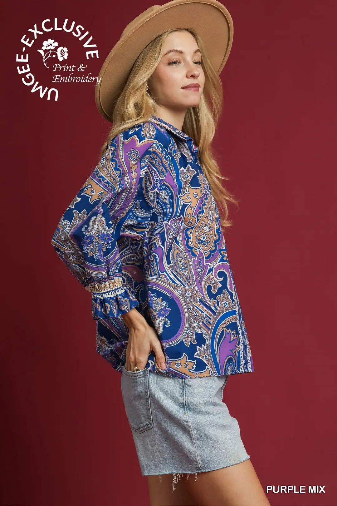 Elevate your coastal wardrobe with the timeless charm of our Paisley Print Button-Down Blouse. Designed with a classic collared neckline and delicate button-front closure, this blouse blends effortless sophistication with a relaxed coastal spirit. The long sleeves feature elastic ruffle cuffs for a feminine touch, while the lightweight rayon-nylon blend drapes beautifully for year-round wear. Its rich jewel-toned paisley print pairs perfectly with denim, skorts, crisp white pants, or shorts, making it a versatile piece for both casual days by the shore and evenings out. A true coastal classic that’s as vibrant as it is timeless.
