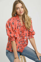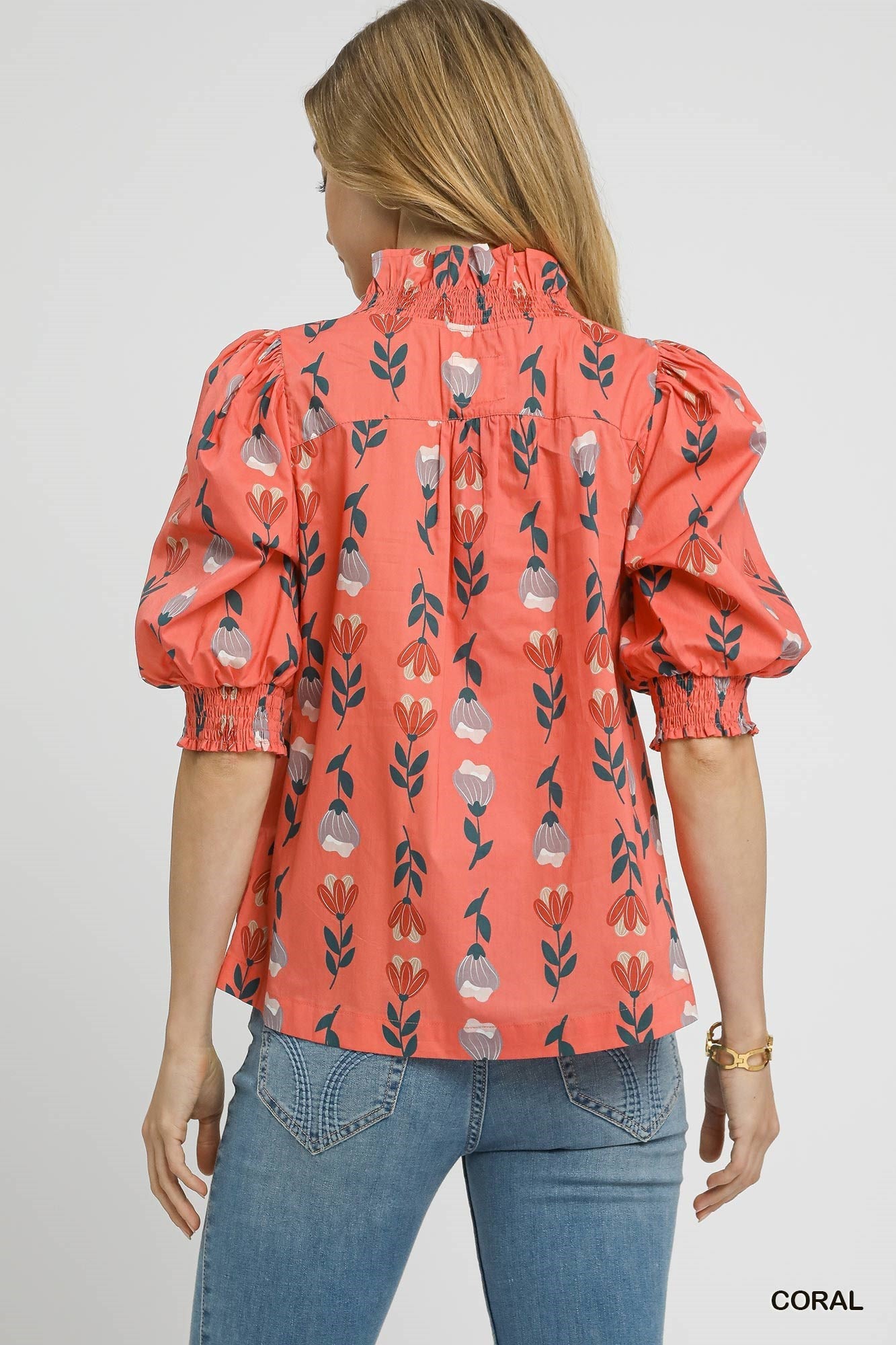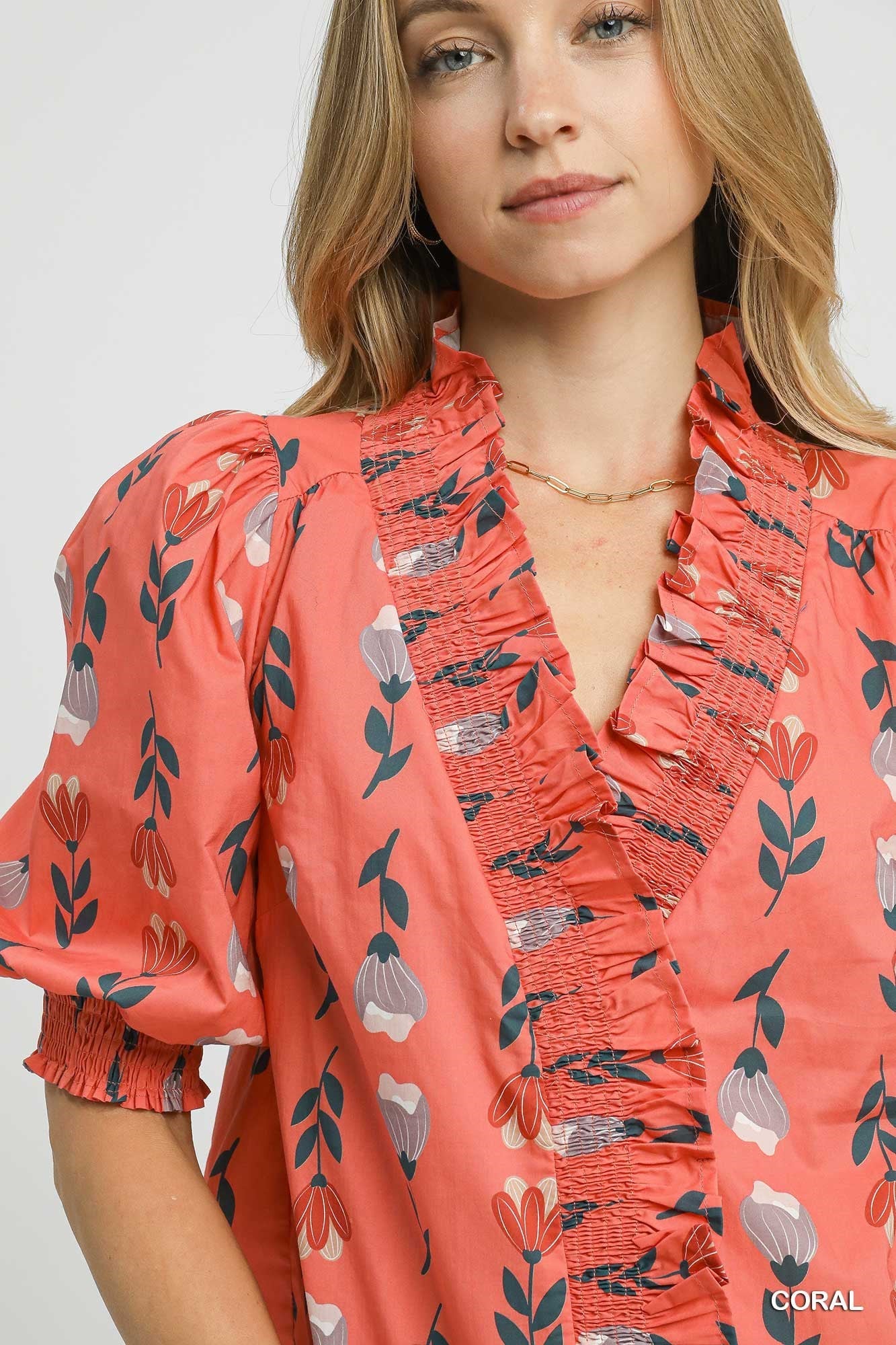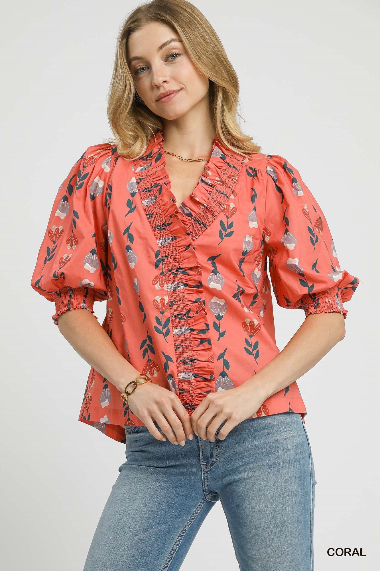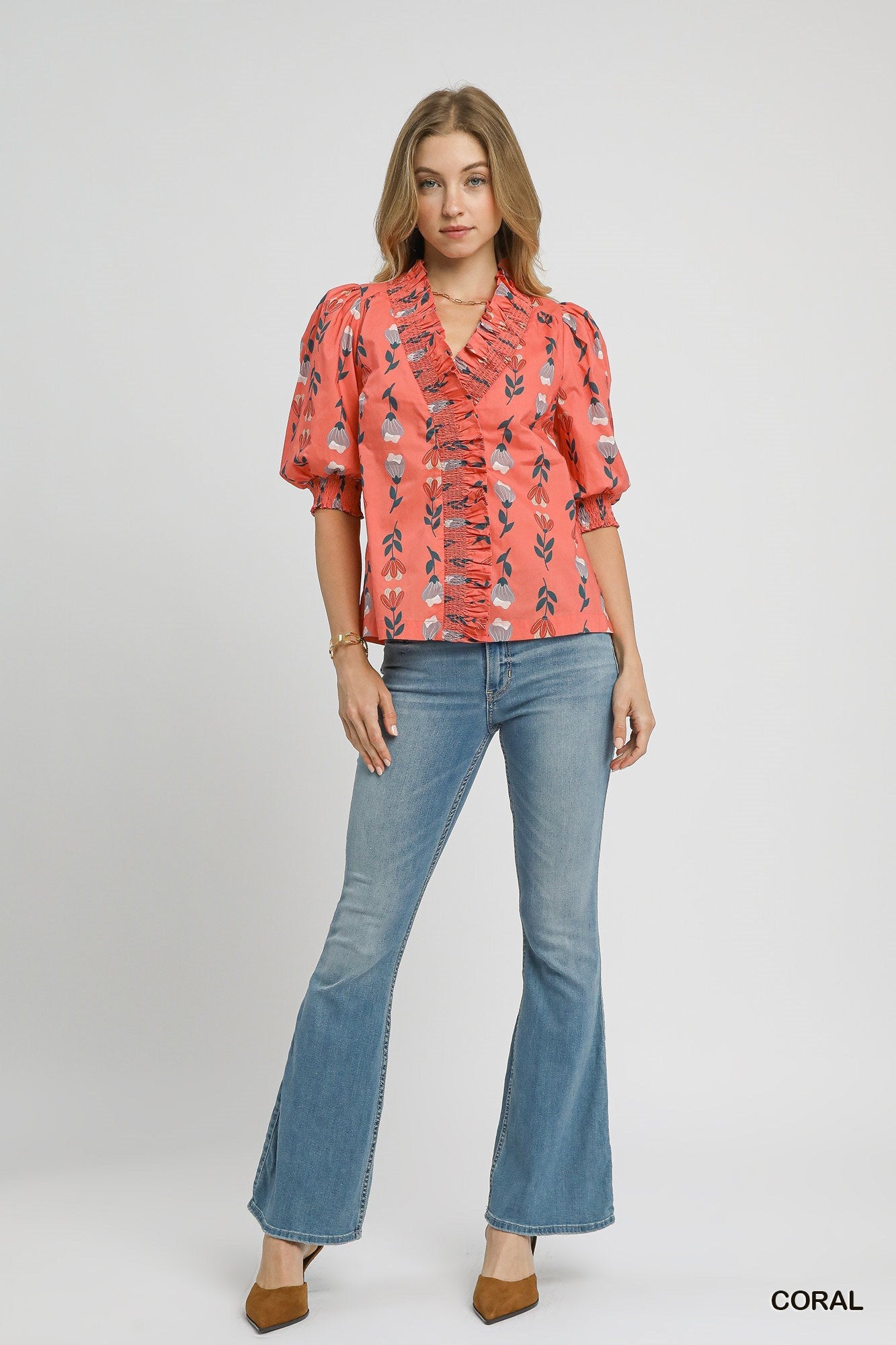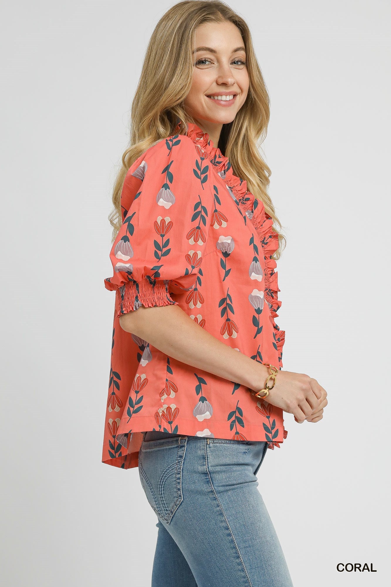 Coral Bloom Ruffle Trim Puff Sleeve Blouse