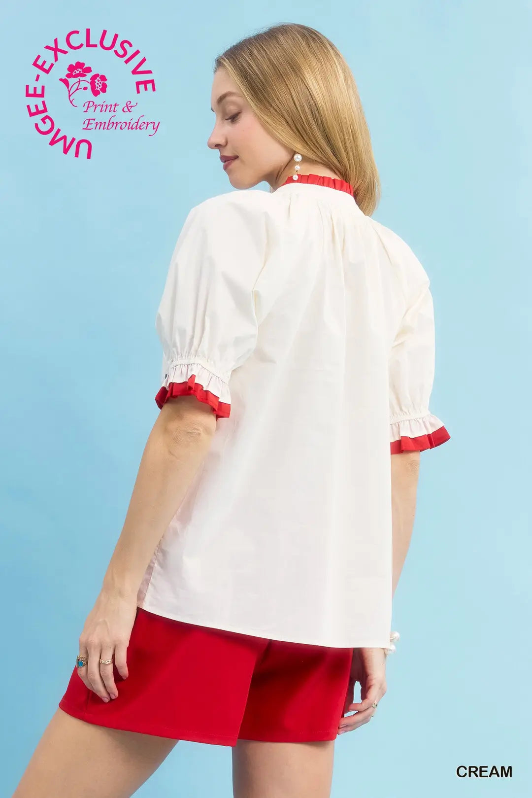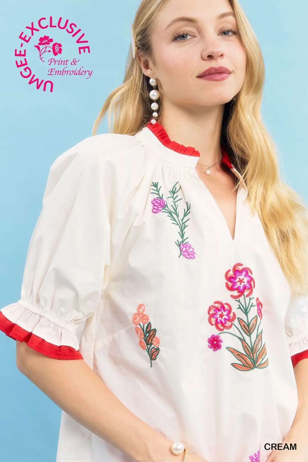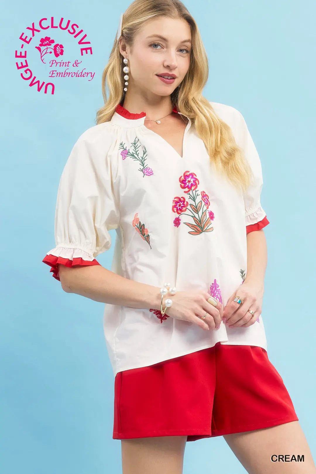 Delicate, feminine, and effortlessly coastal — the Embroidered Bloom Ruffle Top is a timeless piece that radiates charm. Crafted in a soft cream hue, this 100% cotton top features exquisite floral embroidery accented with touches of red along the neckline, sleeves, and ruffle trim. The V-neckline and bubble sleeves add a romantic, airy feel, making it perfect for both casual days and special outings. Pair it with denim, linen pants, or a flowy skirt for an elegant look that embodies the beauty of handcrafted coastal style.