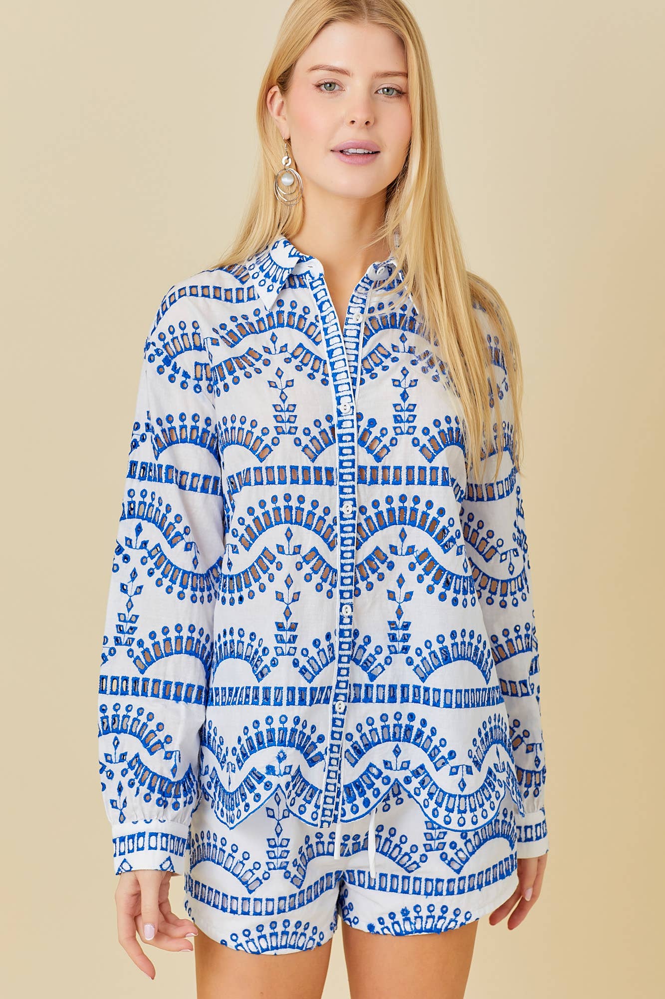 Breeze through the day in timeless coastal style with our Eyelet Lace Beach Shirt. This stunning button-down features delicate white and blue contrast lace detailing, a classic collar, and button sleeves for a polished finish. Whether worn as a breezy cover-up or styled as a chic top, this versatile piece blends effortless elegance with relaxed beach vibes. Dress it up or down—it’s your perfect companion from sun-soaked shores to evening cocktails.