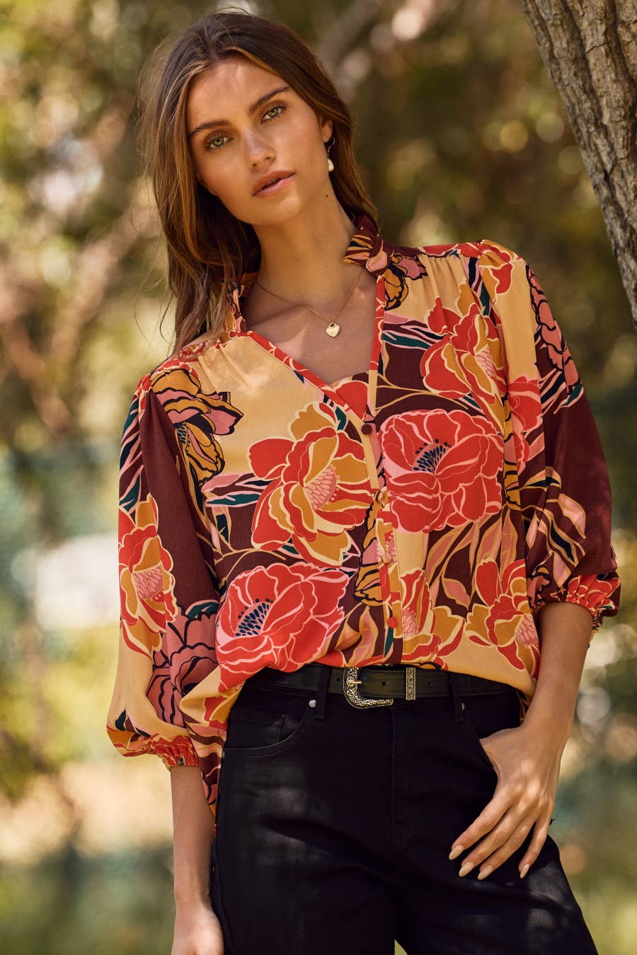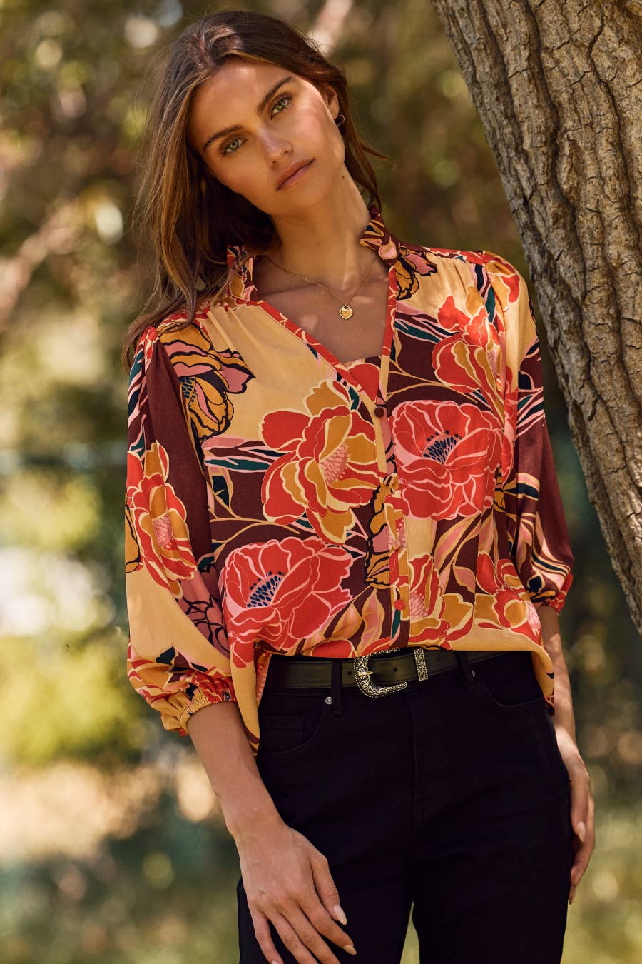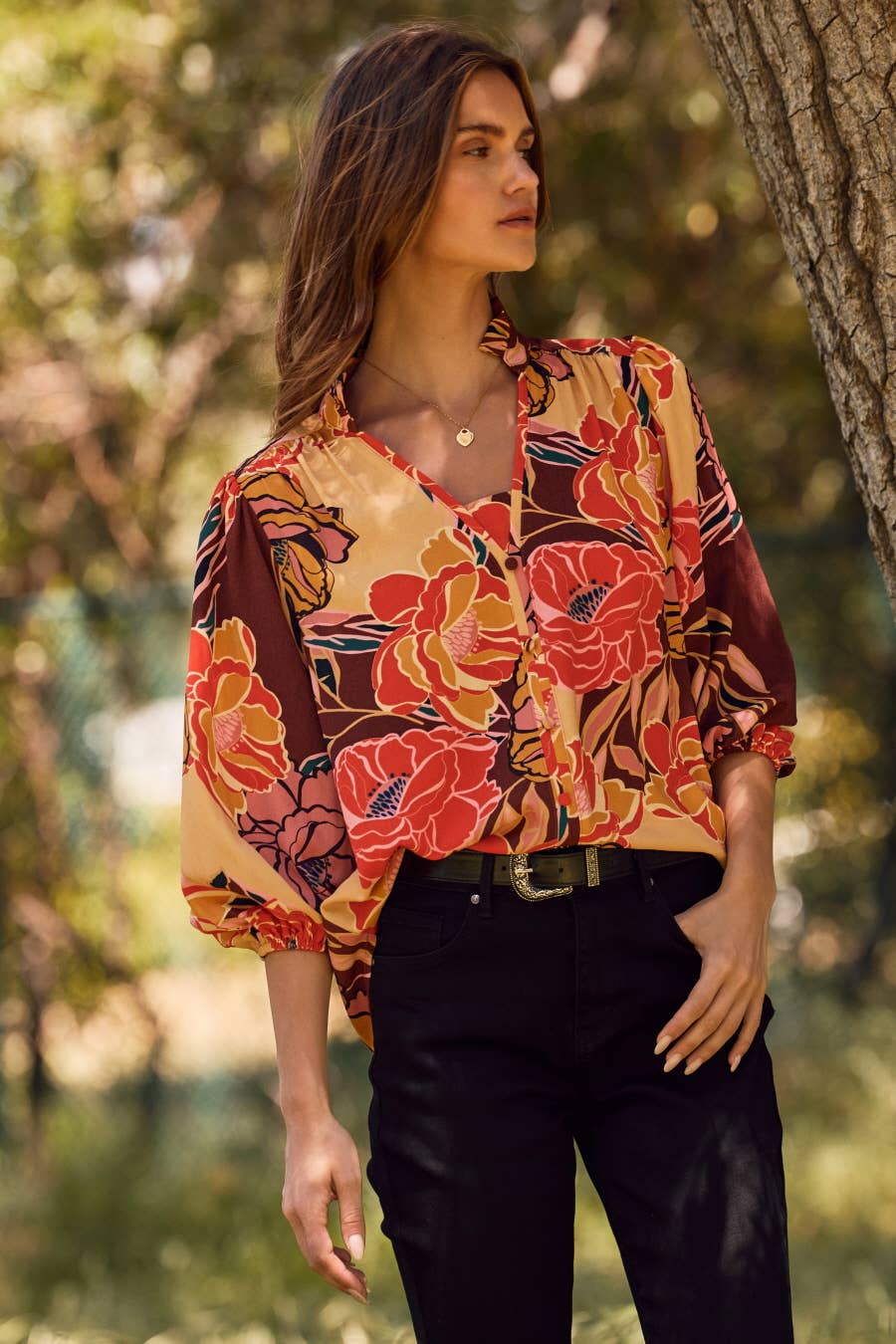 Embrace timeless coastal elegance with this stunning floral printed blouse, designed in rich fall-inspired hues that transition effortlessly through every season. Featuring a graceful ruffled neckline and flattering three-quarter sleeves, this piece blends classic charm with modern ease. Whether you're strolling by the shore or heading to brunch, this blouse pairs beautifully with skorts, denim, or linen—making it a year-round favorite in your wardrobe.