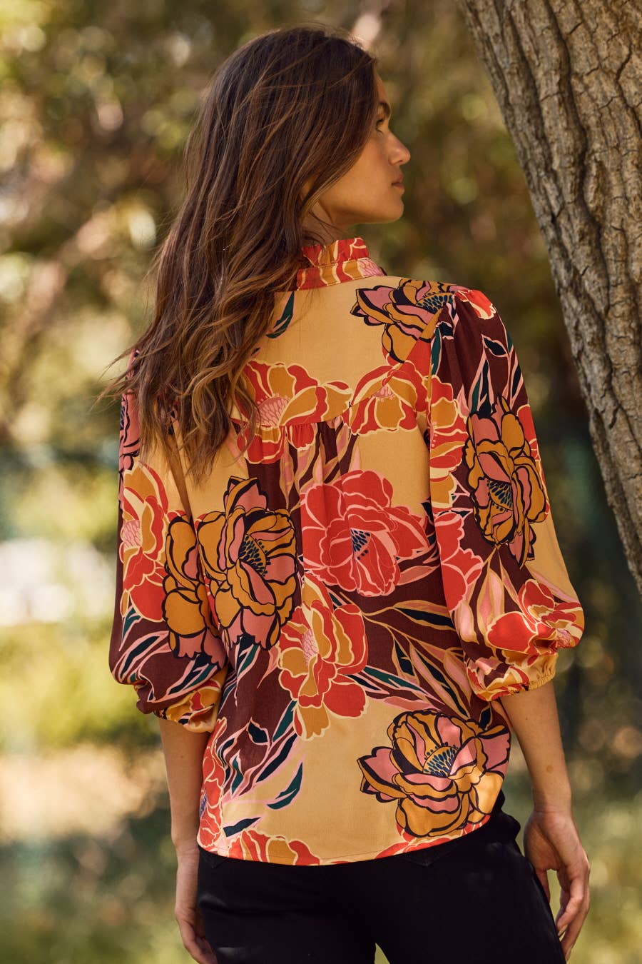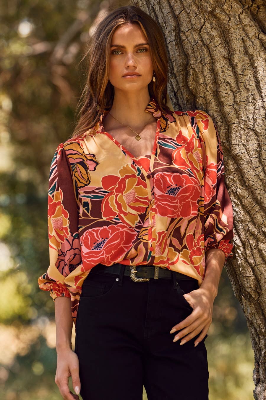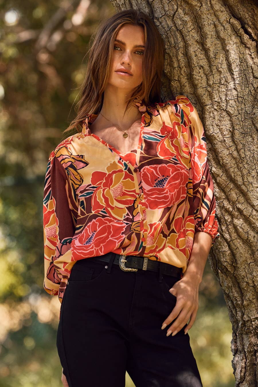 Embrace timeless coastal elegance with this stunning floral printed blouse, designed in rich fall-inspired hues that transition effortlessly through every season. Featuring a graceful ruffled neckline and flattering three-quarter sleeves, this piece blends classic charm with modern ease. Whether you're strolling by the shore or heading to brunch, this blouse pairs beautifully with skorts, denim, or linen—making it a year-round favorite in your wardrobe.