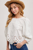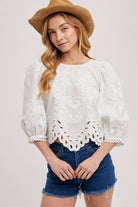 Effortless beauty meets coastal charm with our Ivory Lace Cutout Bubble Sleeve Top. Designed with delicate lace hem detailing and voluminous bubble sleeves, this piece is a timeless blend of femininity and modern style. Lightweight and versatile, it transitions seamlessly from day to night, season to season. Pair it with your favorite skort, flowing skirt, tailored pants, or classic denim for a look that feels polished yet relaxed. A true year-round staple, this top embodies the breezy sophistication of Pura Coastal.