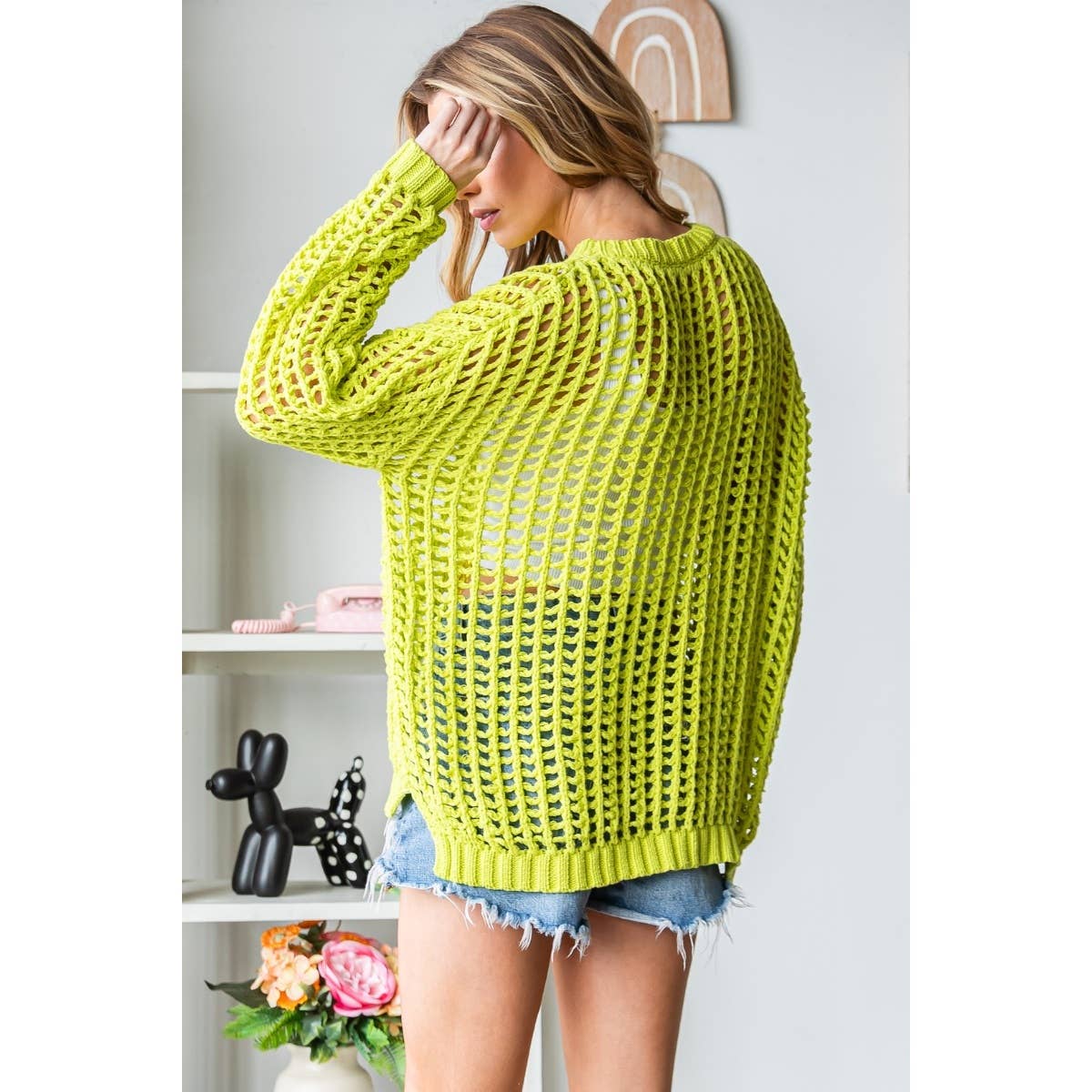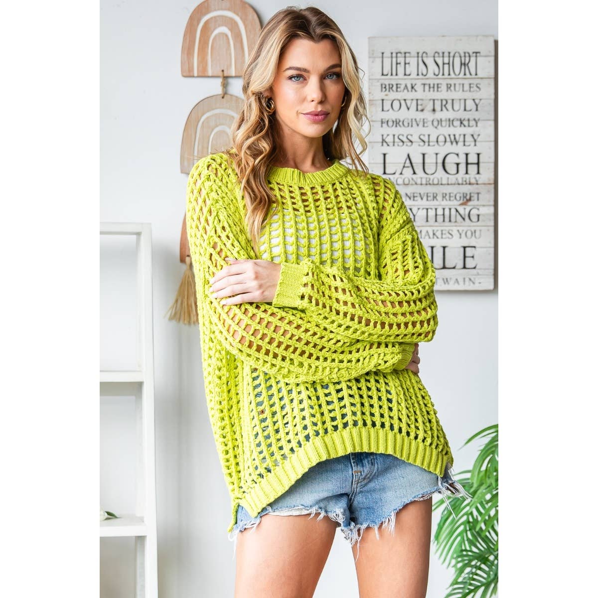 Bring a pop of coastal sunshine to your wardrobe with our Lime Tide Crochet Sweater. Featuring a breezy fishnet-style crochet knit in a vibrant lime hue, this relaxed-fit piece perfectly captures carefree coastal living. The round neckline and long sleeves make it easy to layer over a cami, tank, or swimsuit — ideal for beach strolls, brunch by the bay, or laid-back weekends. Lightweight, playful, and effortlessly chic, it’s the perfect blend of comfort and coastal color.