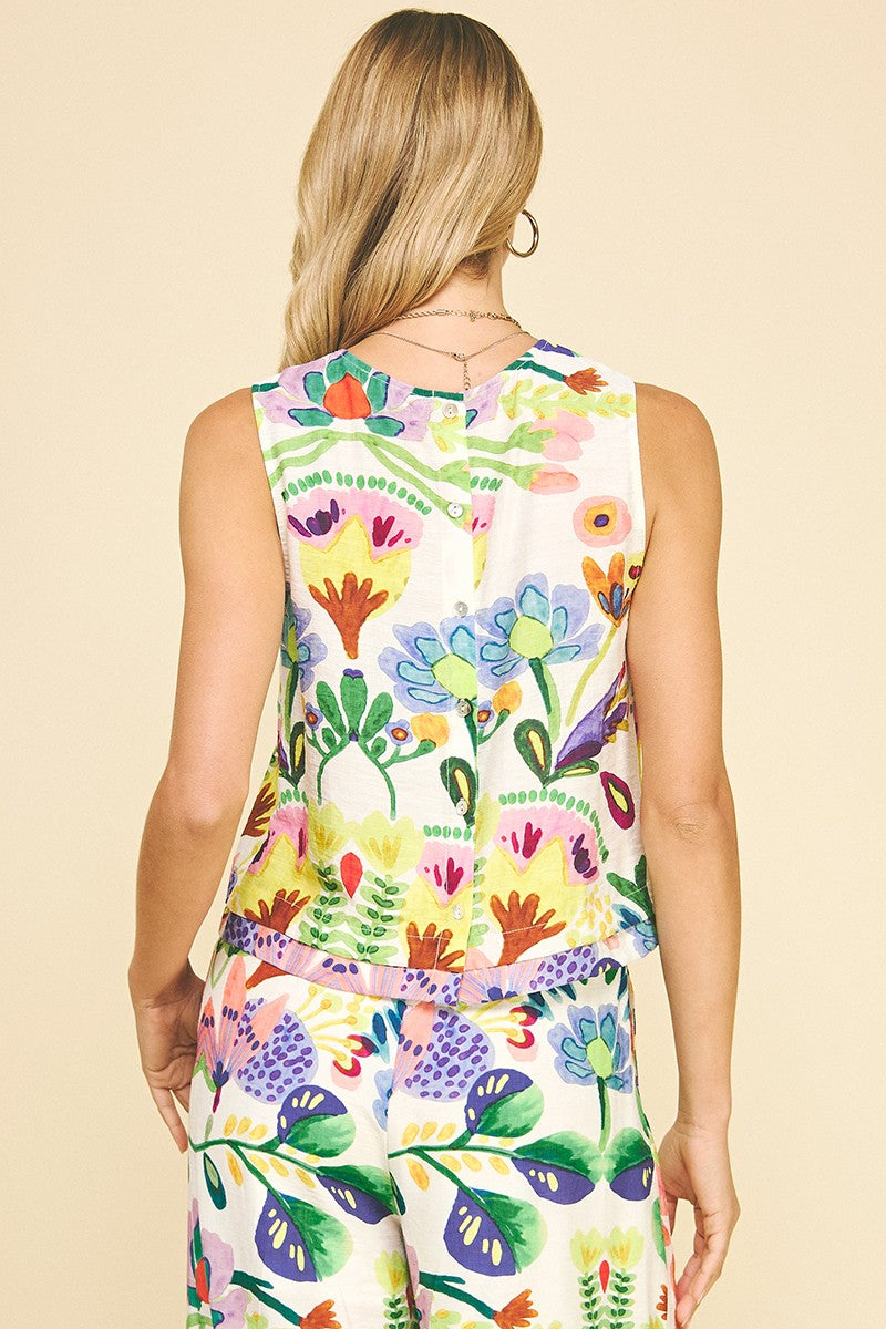 Breezy, beautiful, and full of coastal color, the Meadowlight Sleeveless Top brings effortless elegance to your warm-weather wardrobe. Designed with a flattering rounded neckline, delicate tuck detailing, and a unique button-down back, this piece blends comfort and charm. The ivory base is brought to life with a painterly floral print in soft greens, pops of fuchsia, warm rusts, and touches of yellow and purple — a true garden of hues. Wear it solo or pair it with the matching pants for a dreamy day-to-night look.