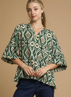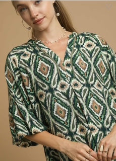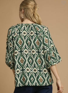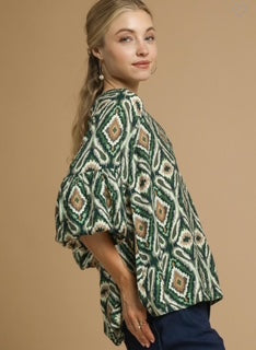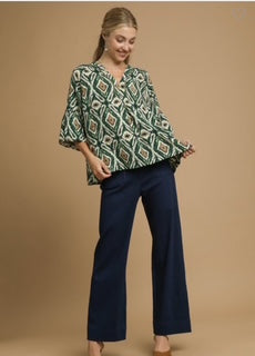 Effortlessly chic and coastal at heart, the Pure Coastal Boho Geoprint Ruffle Sleeve Top is your go-to for relaxed style with a touch of flair. Featuring a soft V-neckline with a delicate tie detail, this flowy silhouette is framed by tiered short ruffle sleeves for a playful, feminine touch. The hunter green and latte-toned geo print is accented with hints of navy, making it incredibly versatile—pair it with cream, latte, or navy pants, skirts, or skorts. Lightweight and fully polyester, this top is perfect for sunny strolls, weekend getaways, or anytime coastal ease is calling.