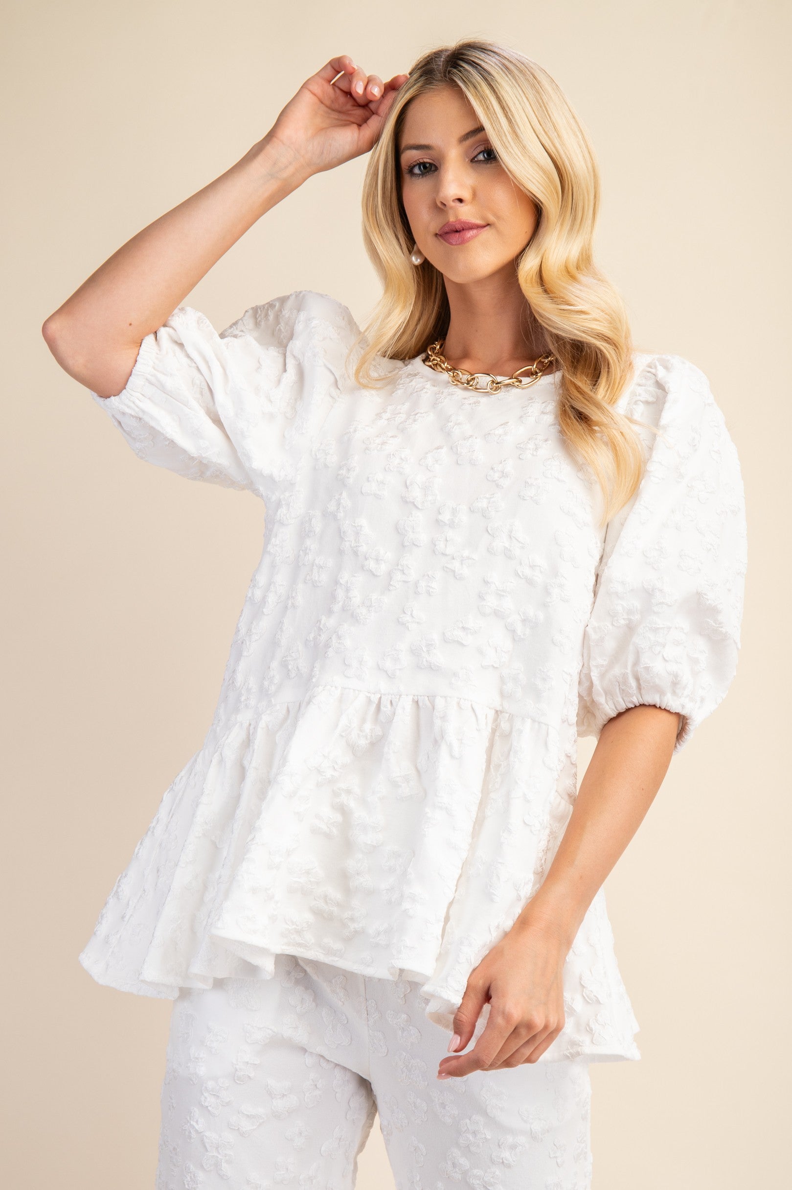 White Jacquard Puff-Sleeve Peplum Top – Elegant Texture, Bold Silhouette