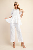 Elevate your style with this modern, structured look. Pair the White Jacquard Puff-Sleeve Peplum Top with the matching White Jacquard Pants (sold separately) for a refined yet fashion-forward ensemble that’s full of texture and movement.
