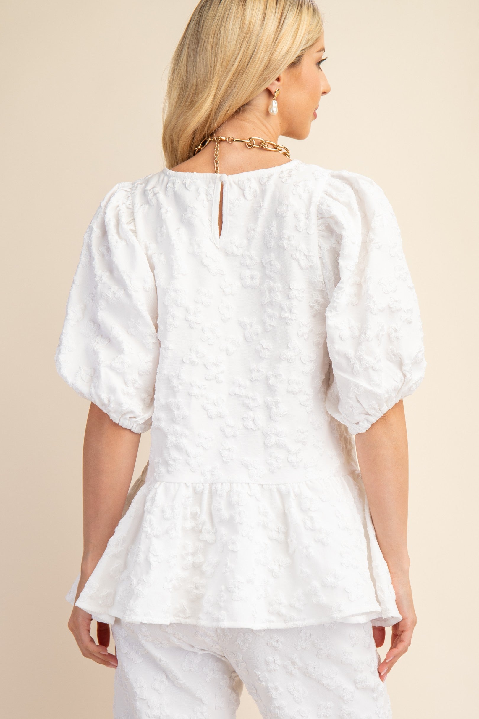 Top: White Jacquard Puff-Sleeve Peplum Top