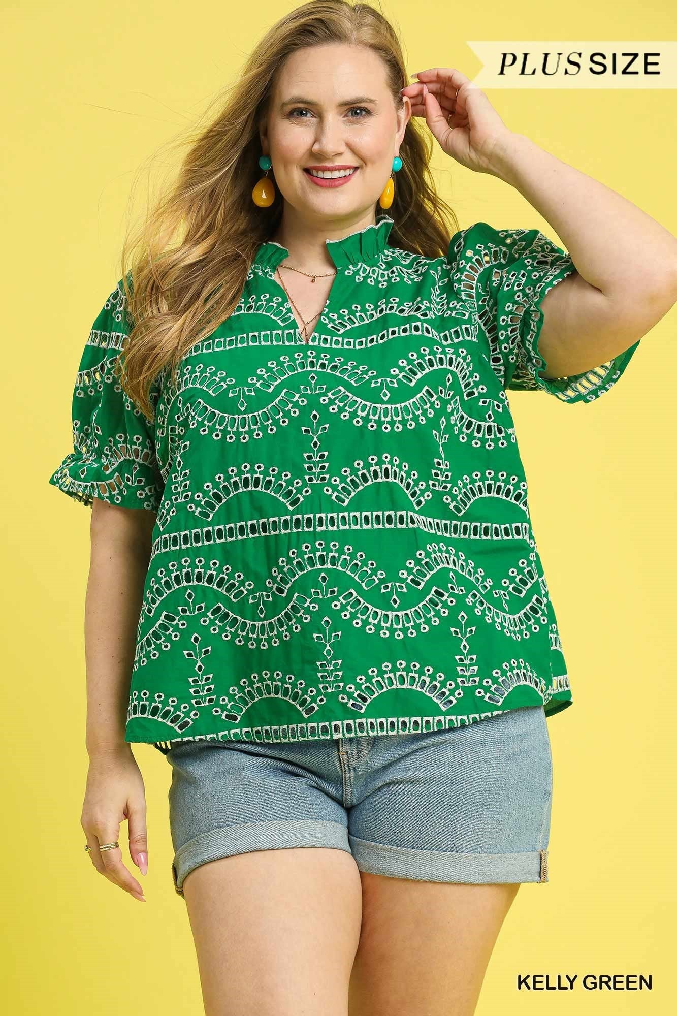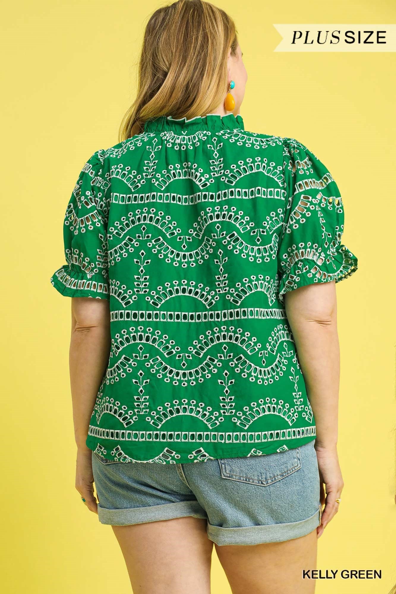 Capture island energy in our Kelly Green Island Top — a vibrant, embroidered blouse designed for sunshine and salt air. Featuring playful puff sleeves with ruffled cuffs, a split V-neck with a stand-up collar, and a relaxed silhouette, this lined top offers breathable comfort with a bold, coastal vibe. Whether you're strolling the boardwalk or brunching al fresco, it’s your go-to for easy elegance and endless compliments.