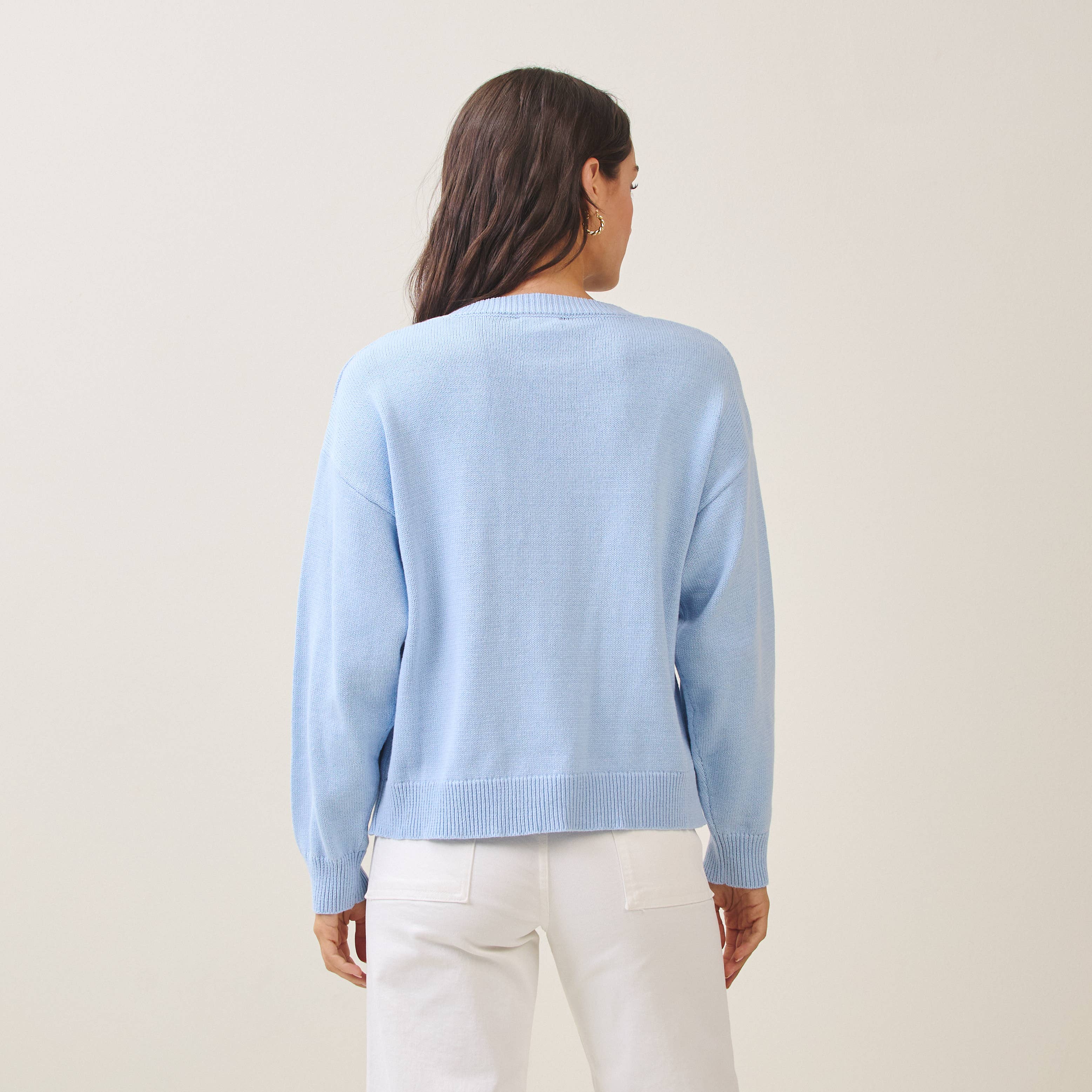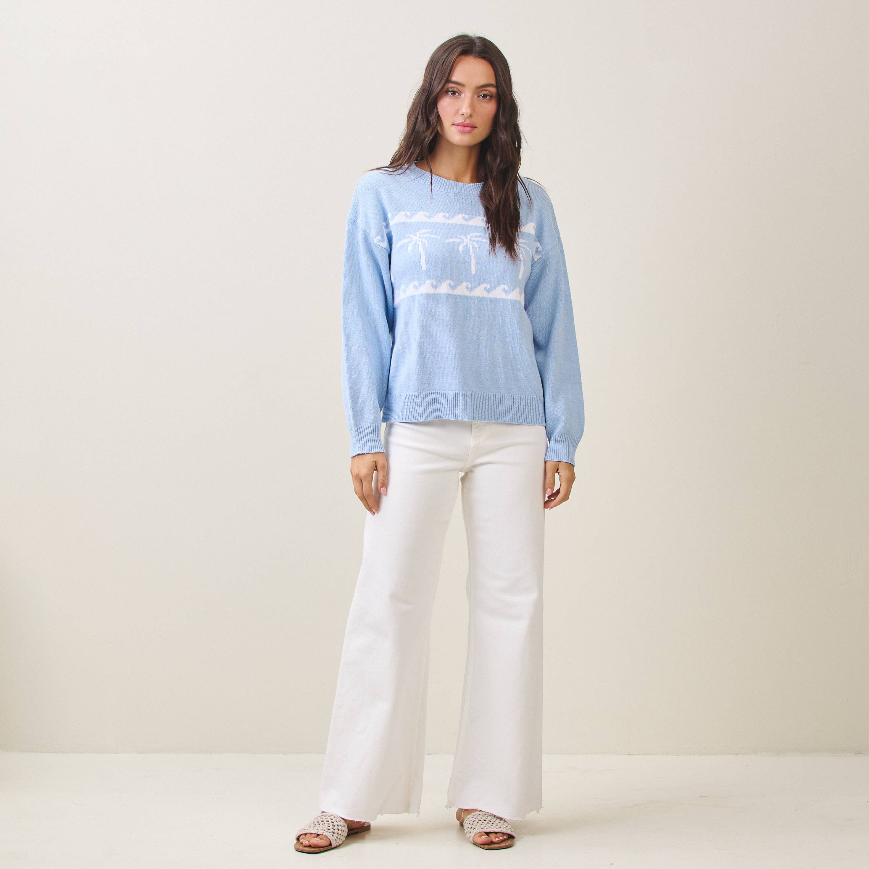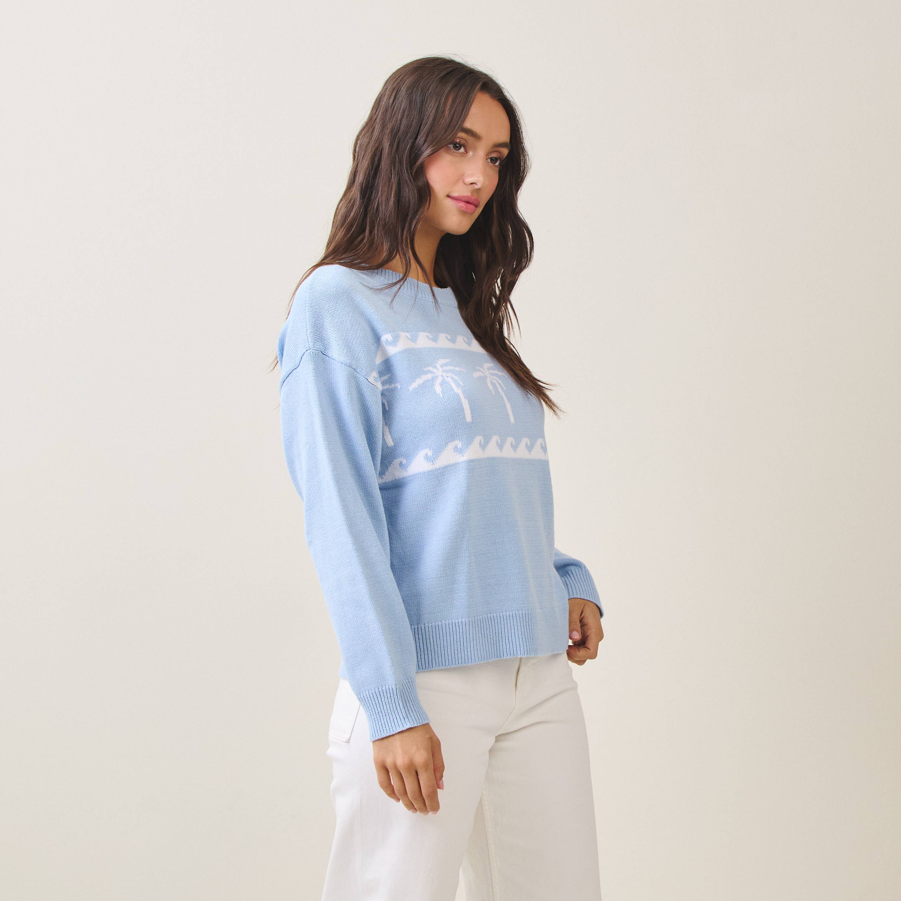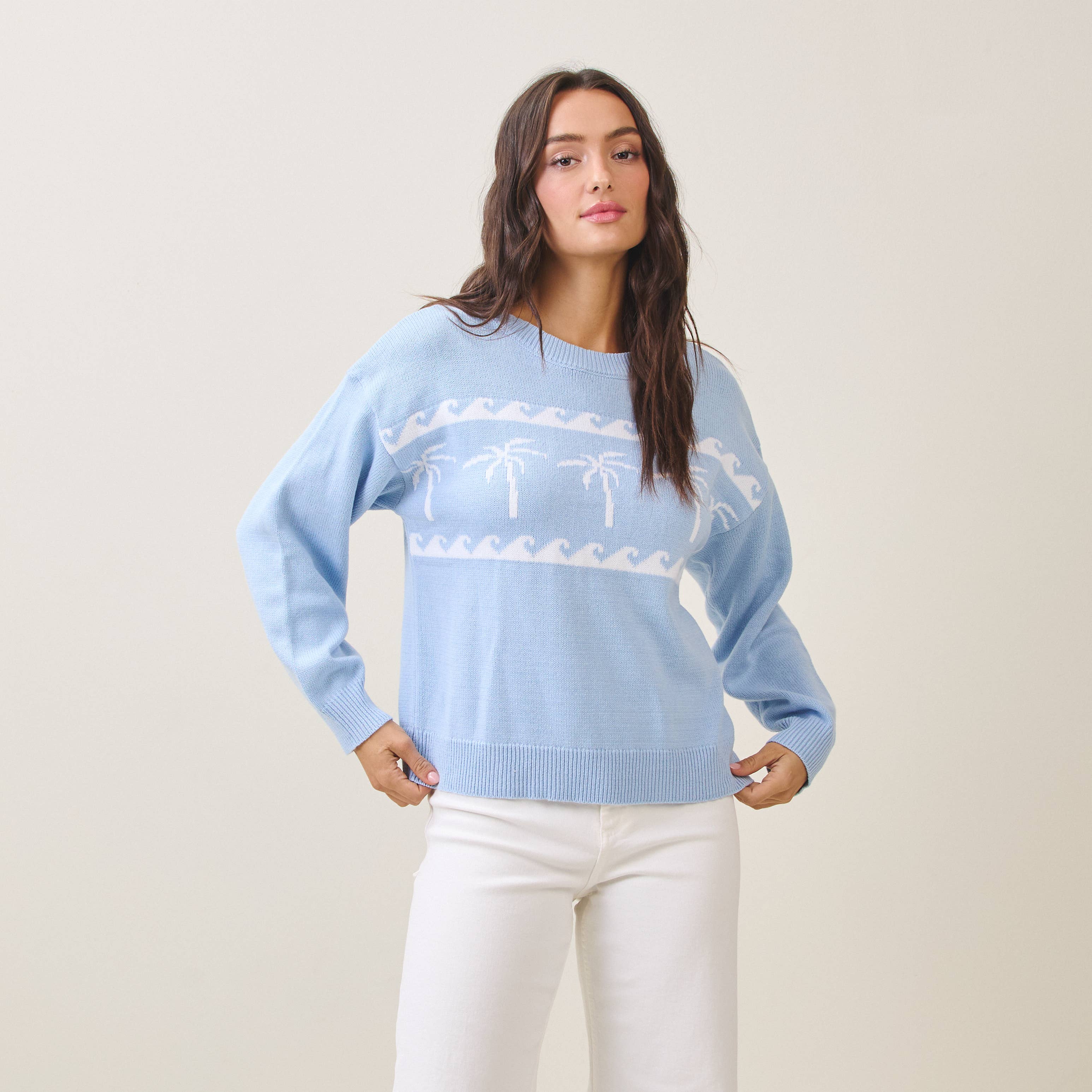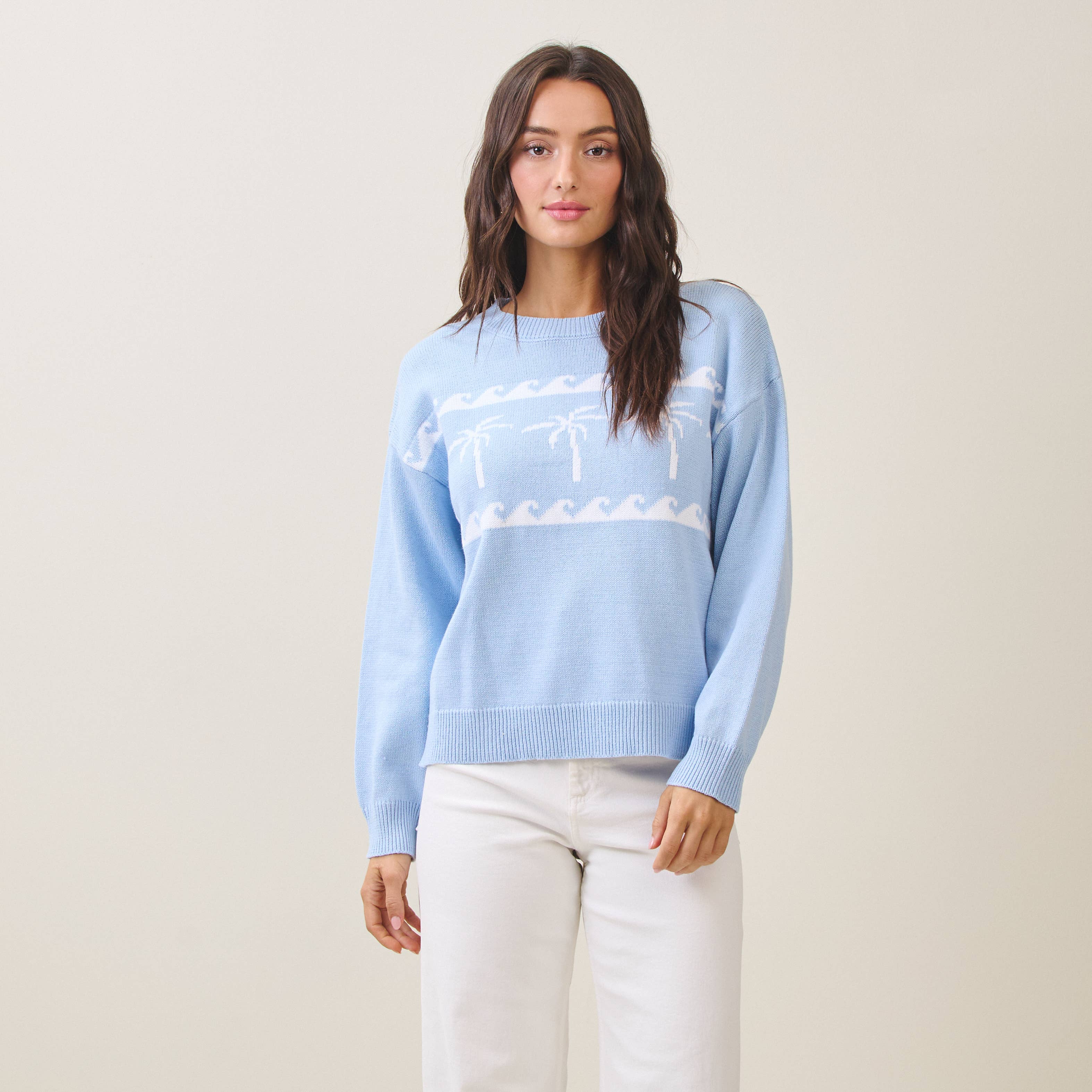 Soft, serene, and effortlessly coastal, this lightweight baby blue knit sweater is a true beachside essential. Featuring crisp white palm tree details, it captures that laid-back surf-inspired vibe while remaining polished enough for everyday wear. Designed with long sleeves and a relaxed pullover fit, this surf sweater is perfect for breezy mornings, cool evenings, and year-round layering. Crafted from a breathable cotton-acrylic blend, it offers lightweight comfort with just the right amount of warmth. Style it with denim, white pants, or linen for an easy coastal look that feels like an endless summer by the shore.