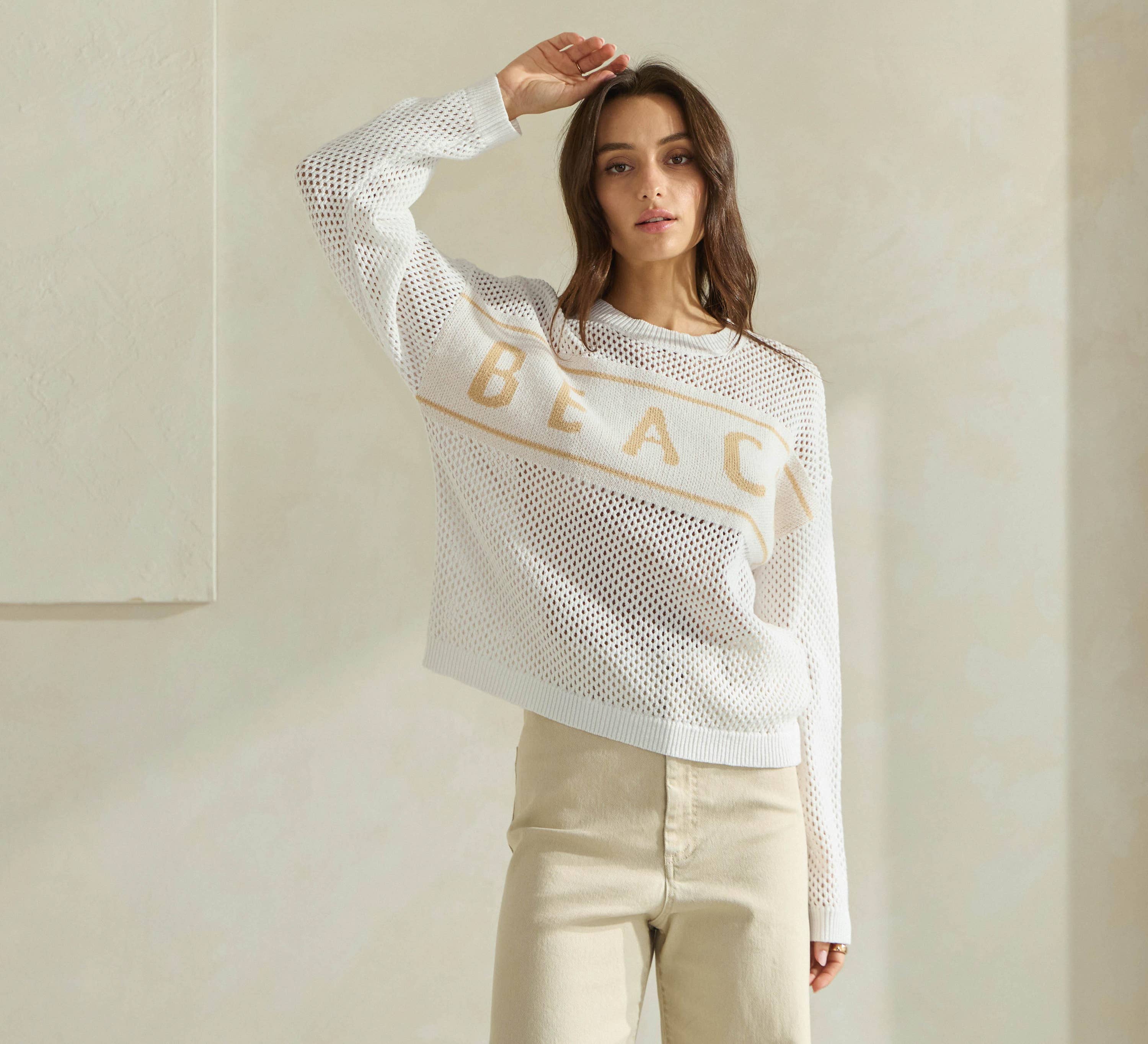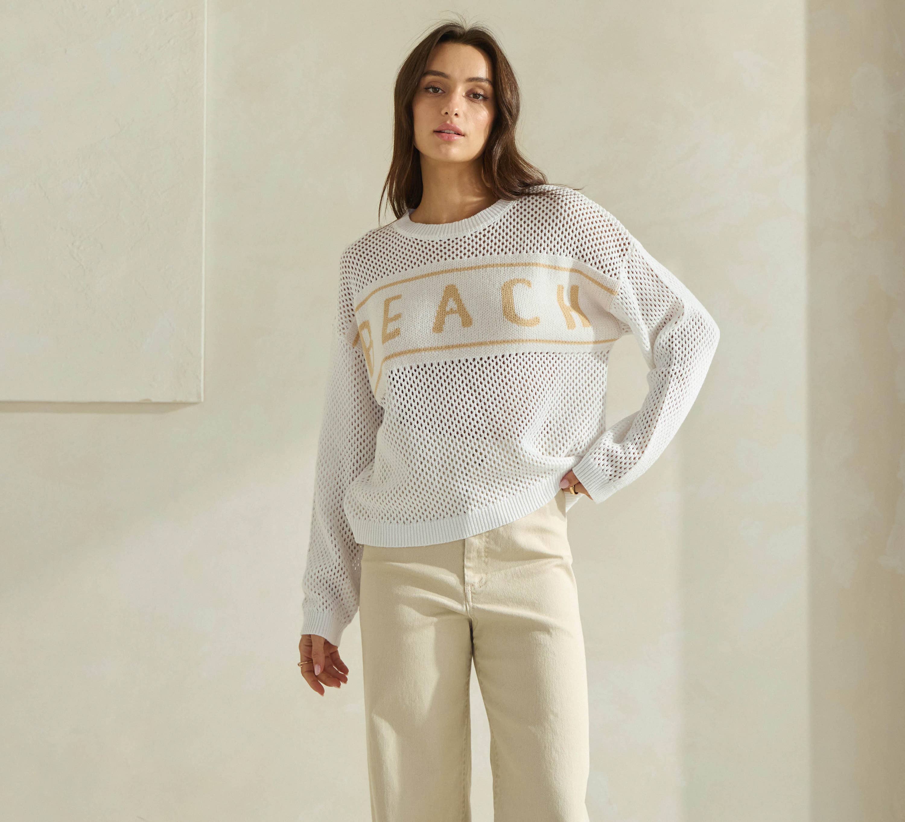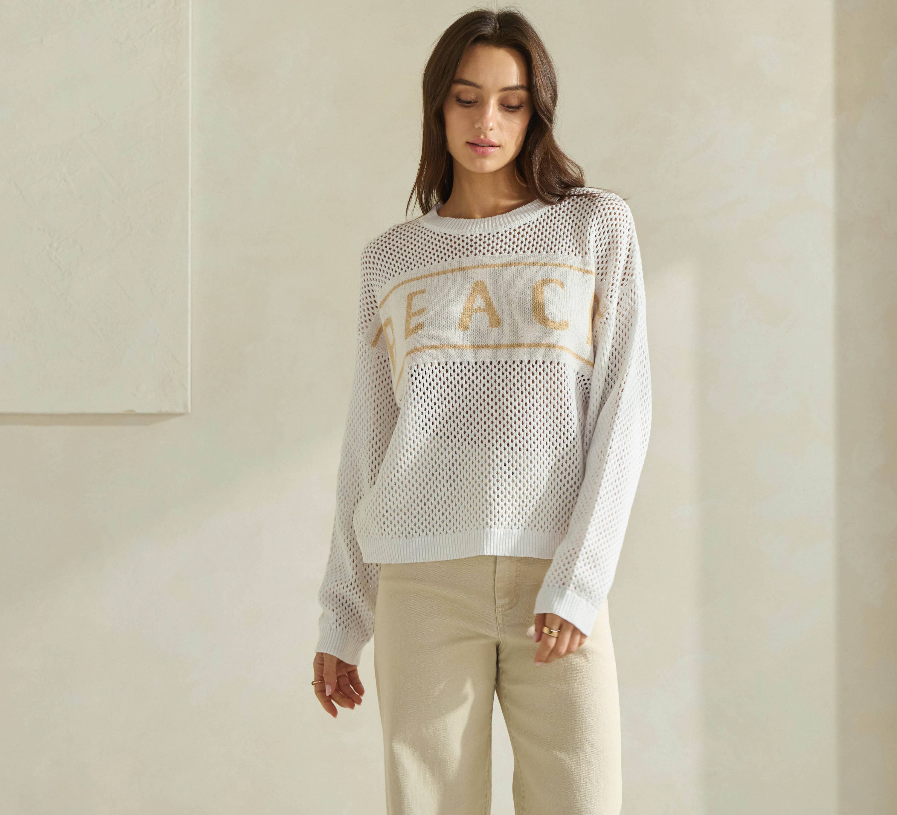 Light as the ocean breeze and effortlessly coastal, our Ivory and Taupe Mesh Beach Sweater is your go-to layer for sun-kissed days and cool summer nights. Featuring soft lettering detail and a breathable mesh knit, this long-sleeve sweater blends comfort and coastal style in the dreamiest way. The relaxed fit and airy texture make it perfect for tossing on over a swimsuit or pairing with linen shorts for a laid-back beachside look.