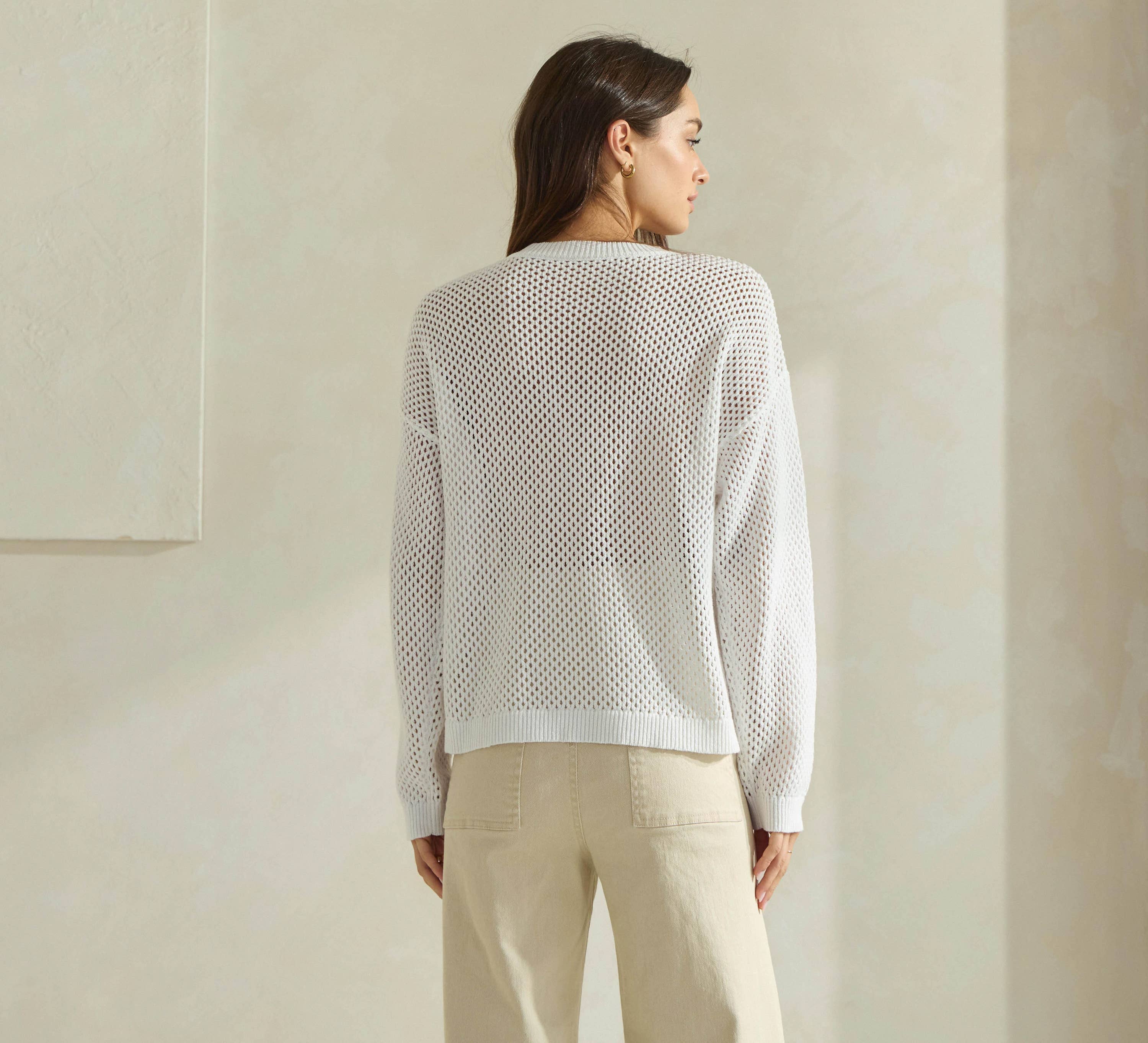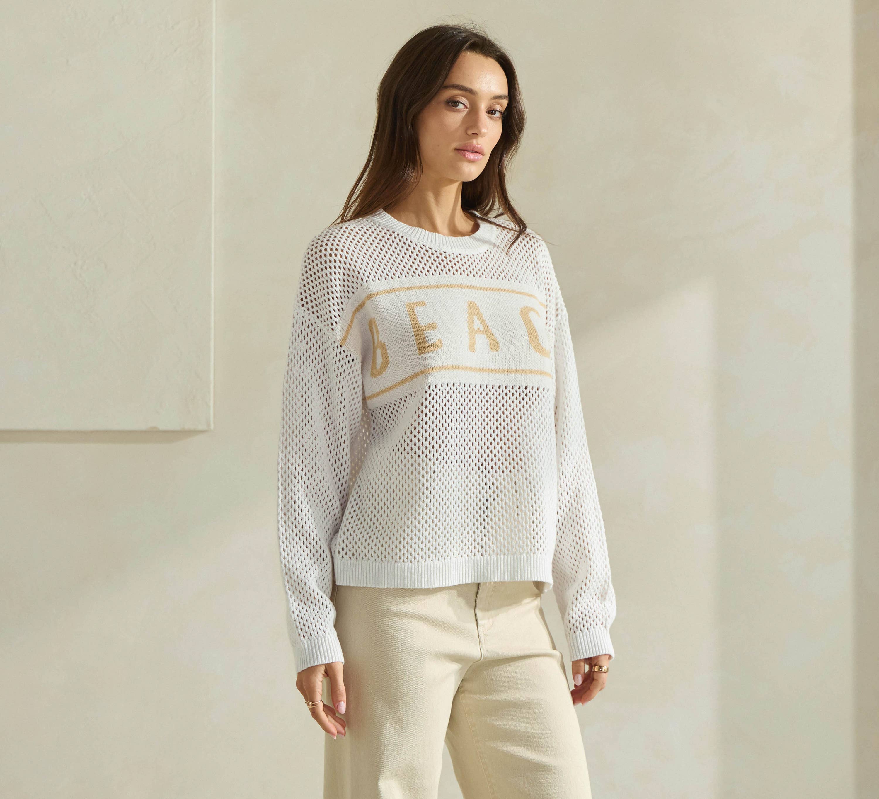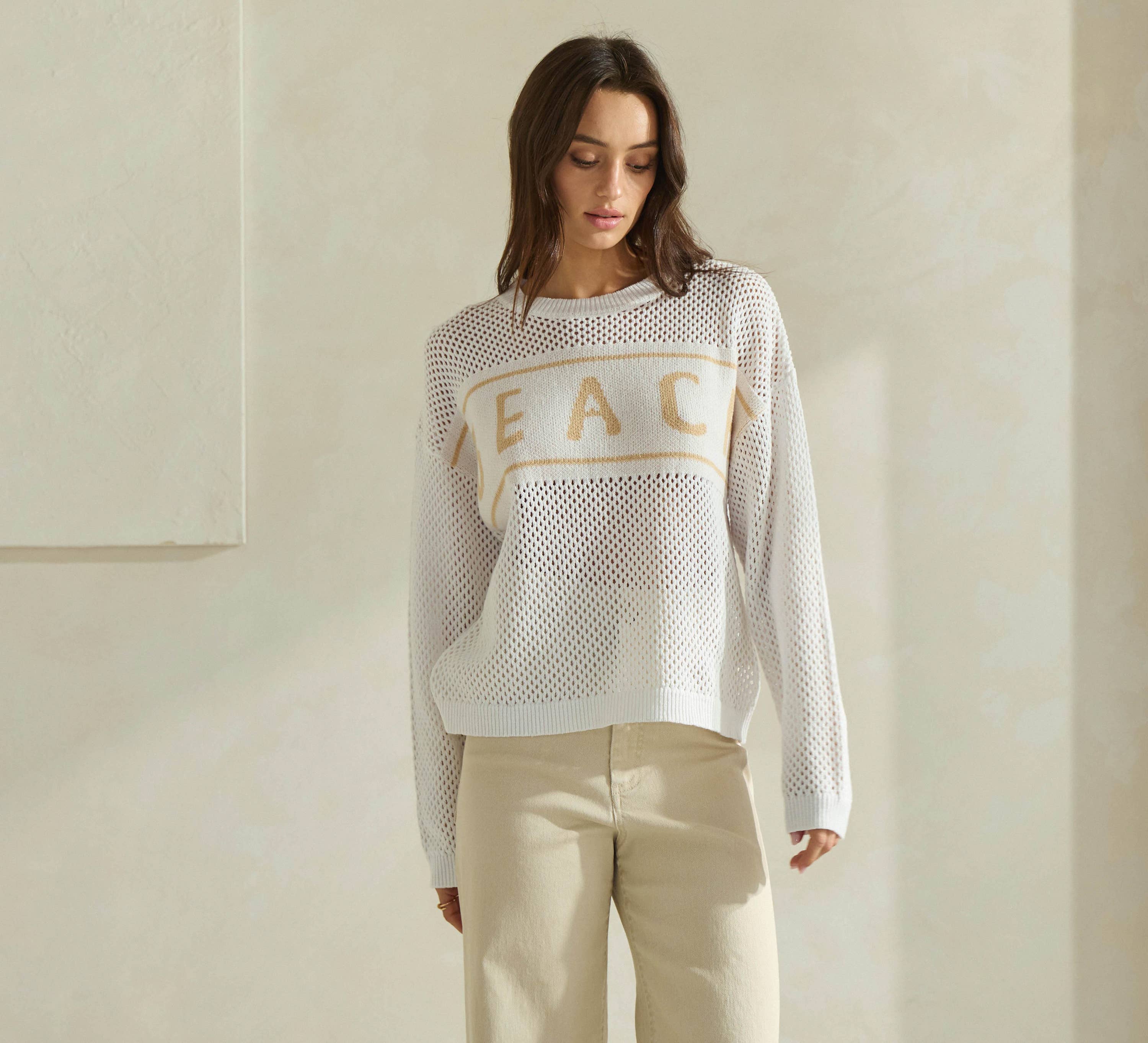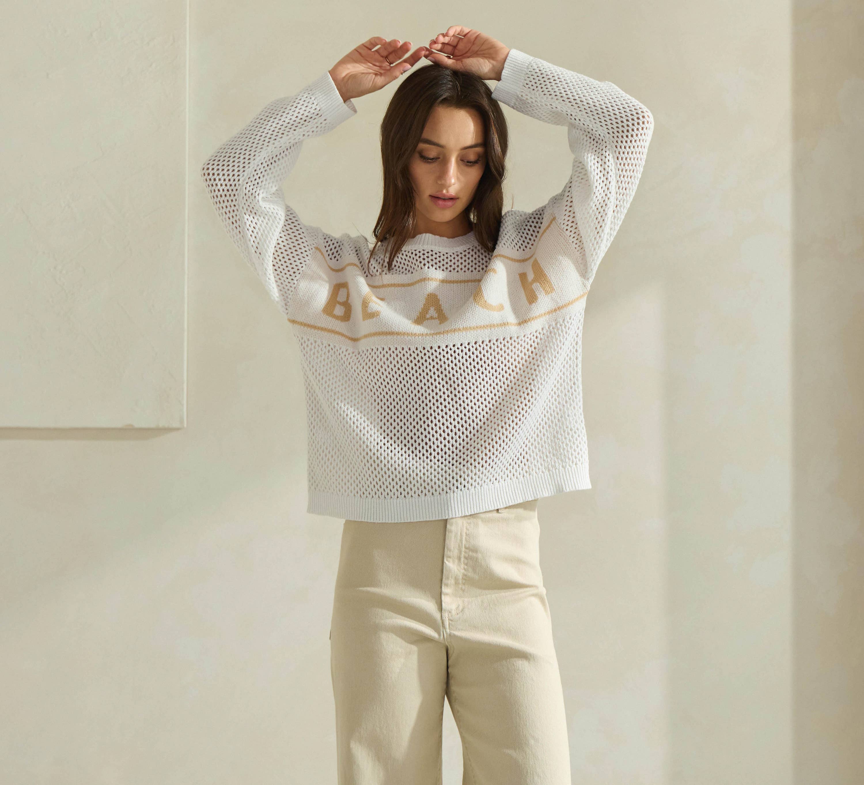 Light as the ocean breeze and effortlessly coastal, our Ivory and Taupe Mesh Beach Sweater is your go-to layer for sun-kissed days and cool summer nights. Featuring soft lettering detail and a breathable mesh knit, this long-sleeve sweater blends comfort and coastal style in the dreamiest way. The relaxed fit and airy texture make it perfect for tossing on over a swimsuit or pairing with linen shorts for a laid-back beachside look.