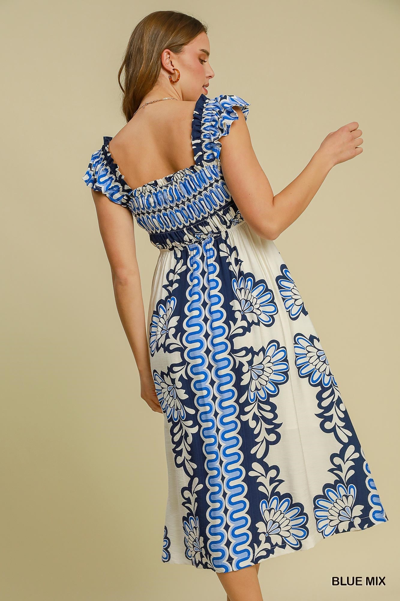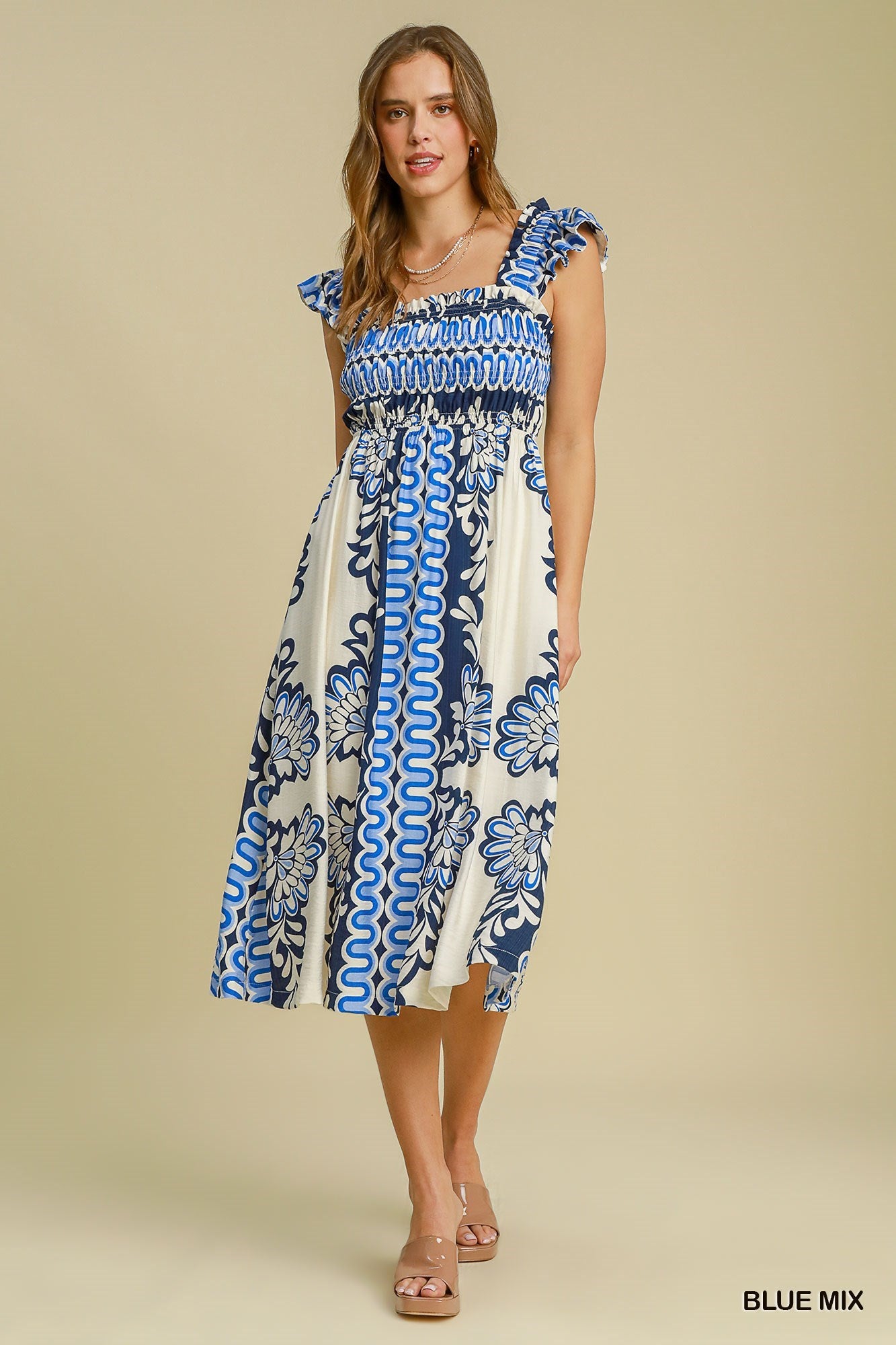 Charming, breezy, and beautifully detailed, this blue mix A-line sundress features a flattering smocked bodice, delicate ruffled tie straps, and a striking placement print in tones of blue, black, and white. Crafted from soft viscose and fully lined for comfort, the dress flows effortlessly in a timeless A-line silhouette. Whether you're headed to a beachside brunch or a warm evening stroll, this piece delivers easy elegance with a bold coastal twist. Add sandals and delicate jewelry for a look that’s polished yet playfully relaxed.