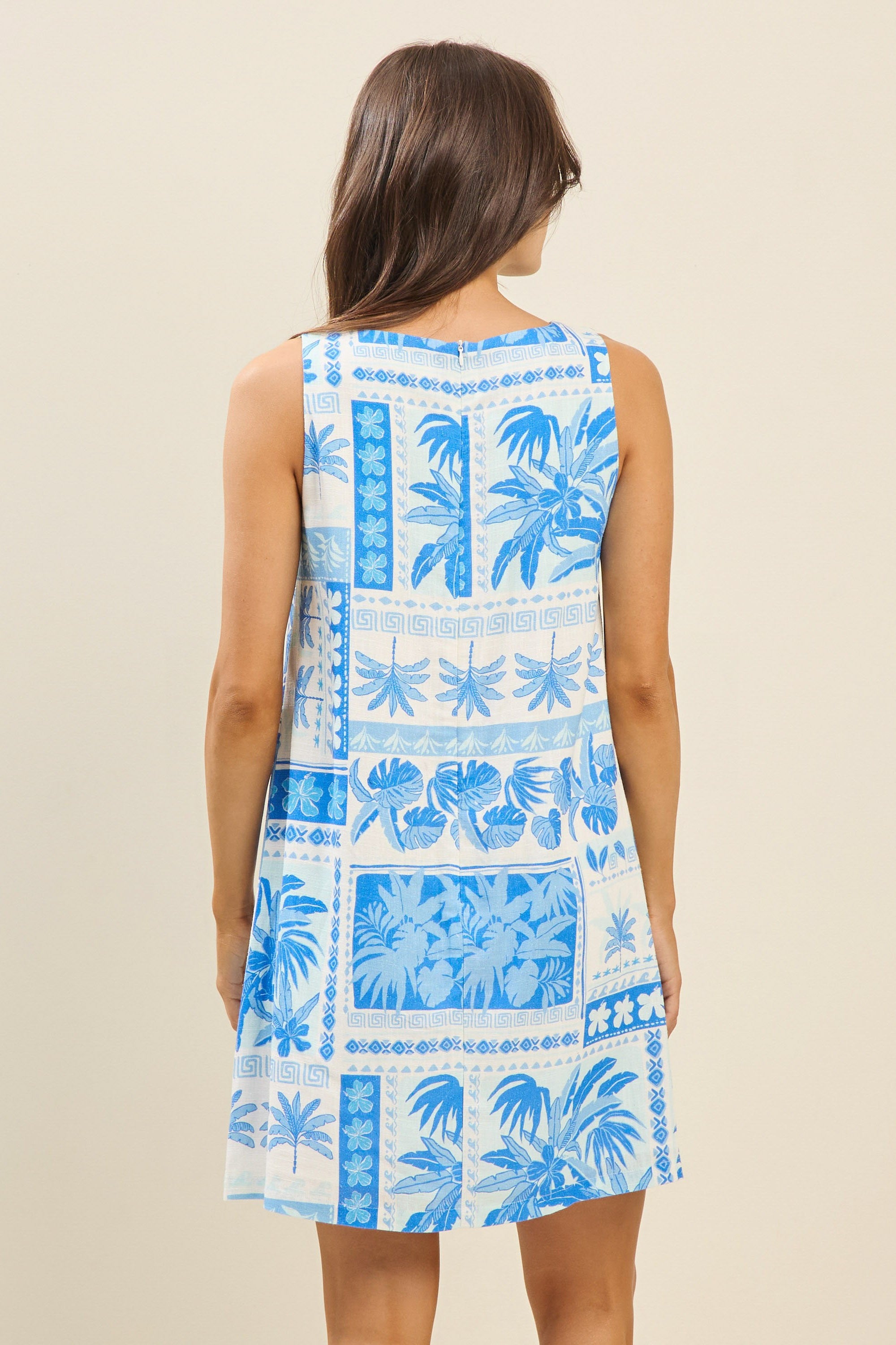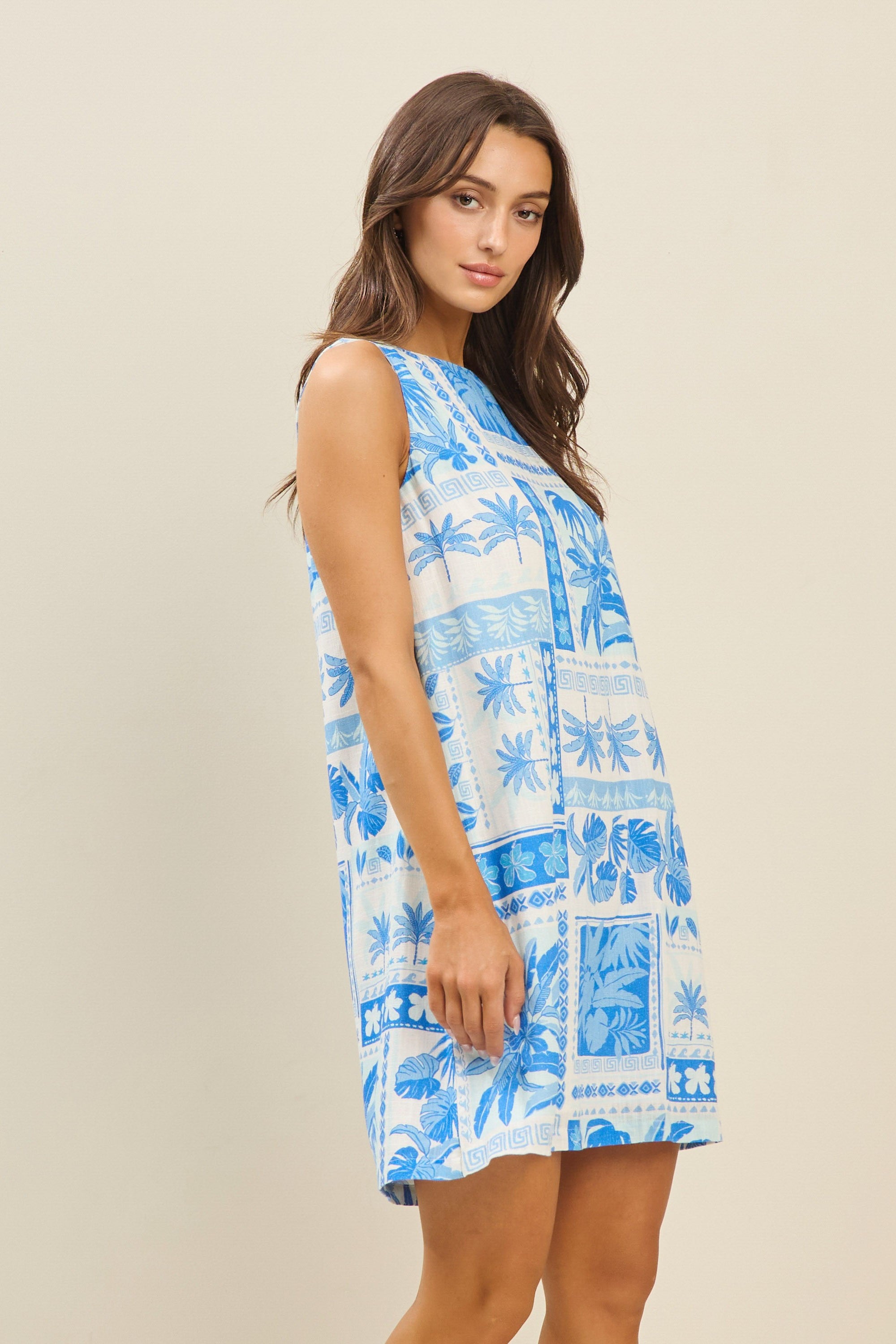 Fresh, flirty, and ready for the coast — the Blue Tropic Breeze Mini Dress captures island charm in every detail. This sleeveless stunner features a crisp white base adorned with a bold blue tropical print, offering a light and airy look perfect for sun-soaked days. Made from a breathable rayon-linen blend, it’s as comfortable as it is eye-catching. Whether you're strolling beachside or brunching in the sun, this mini dress brings a splash of coastal beauty wherever you go.