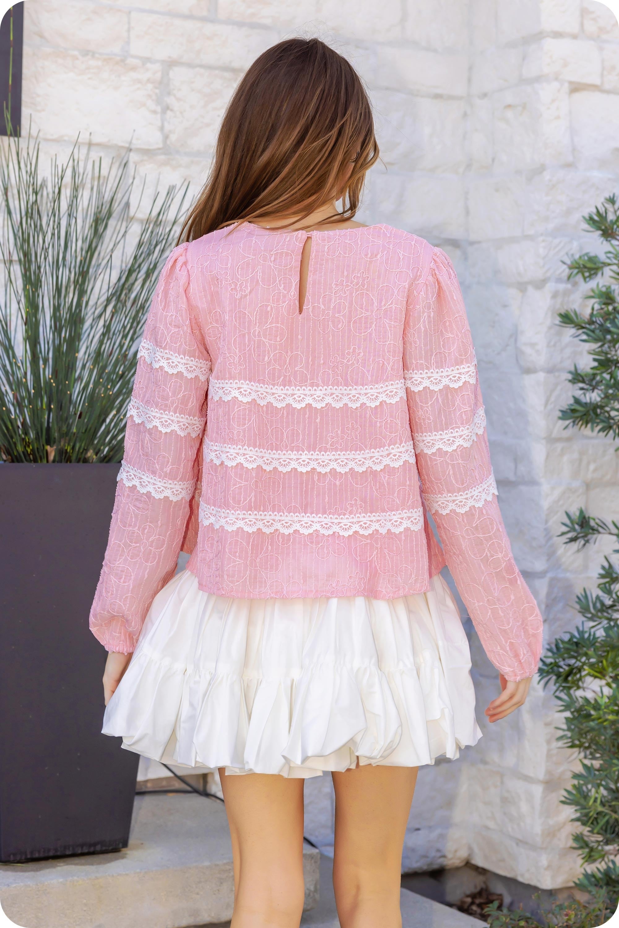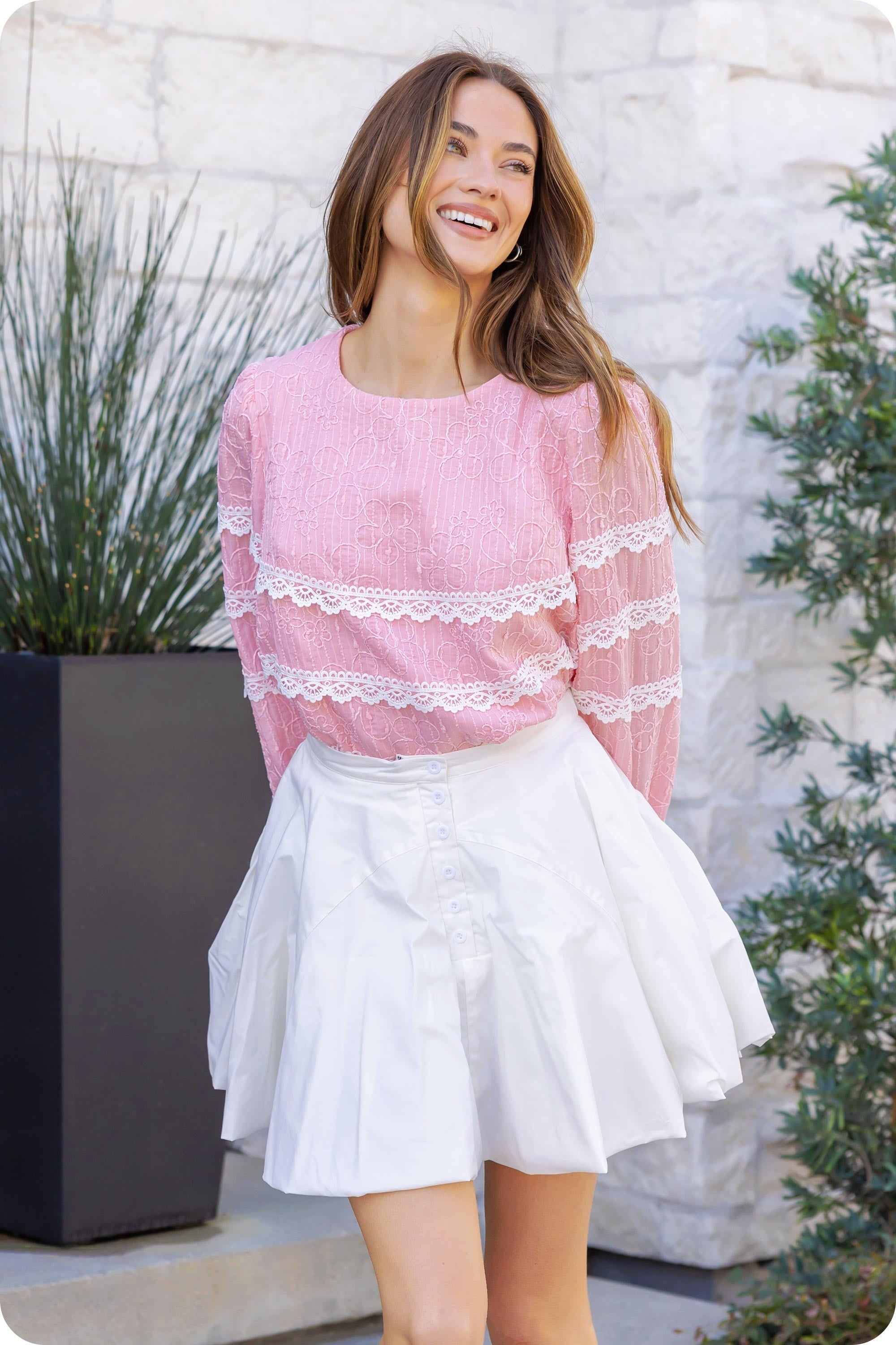Romantic and coastal-chic, the Blush Tide Lace Blouse brings soft elegance to any seaside escape. Crafted in a delicate light pink hue, this textured lurex woven top features all-over floral embroidery and feminine scalloped lace trim throughout. The relaxed fit, round neckline, and long sleeves with elastic cuffs add flowy comfort, while a keyhole button closure at the back offers a graceful finishing touch. Fully lined for ease, this blouse is perfect for garden strolls, oceanfront dinners, or whenever you want to add a little seaside romance to your day.