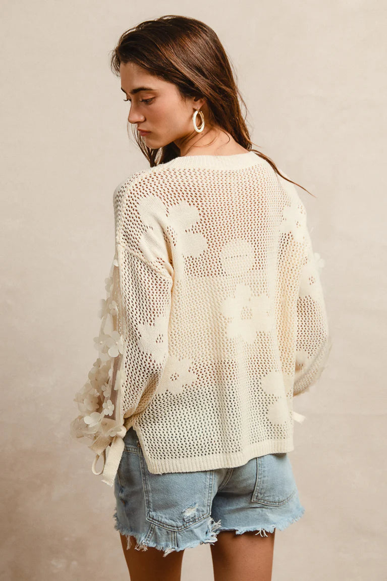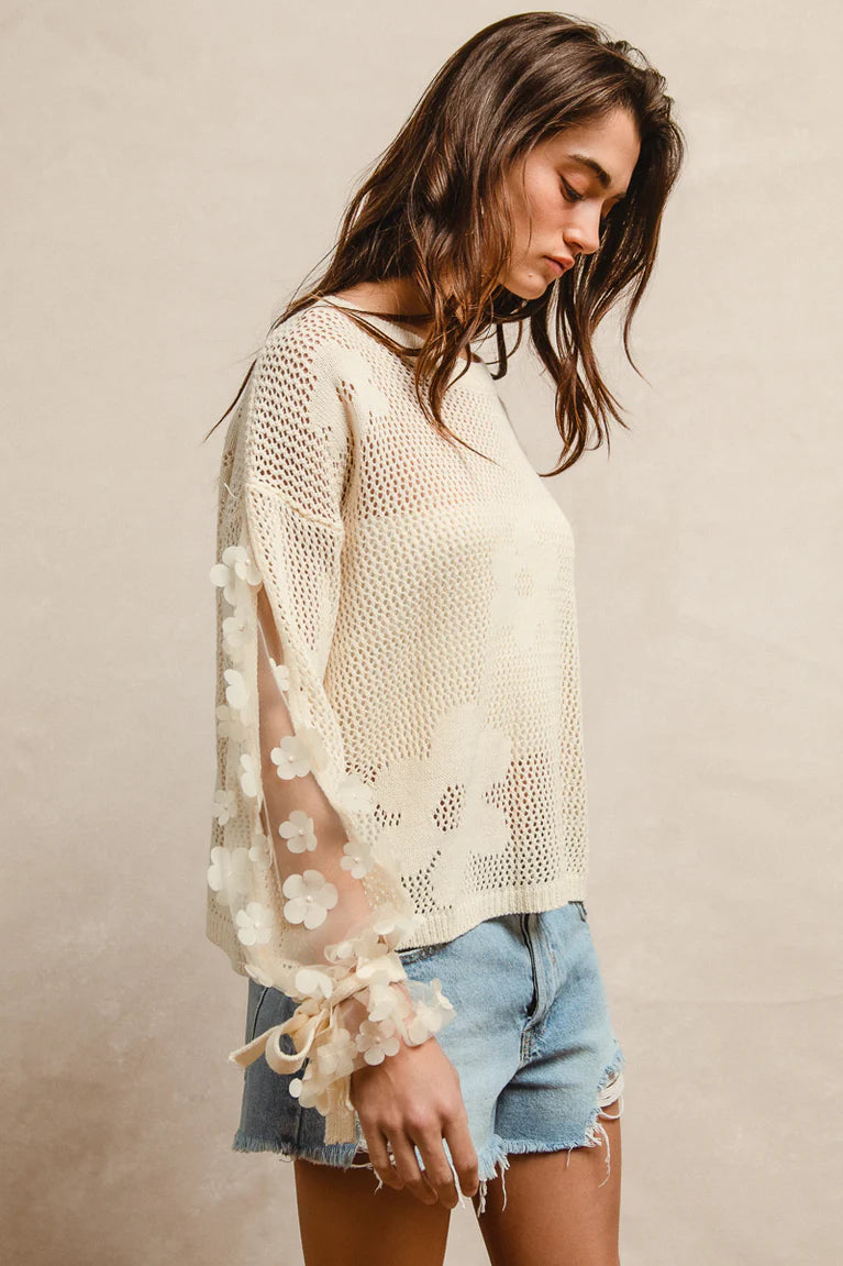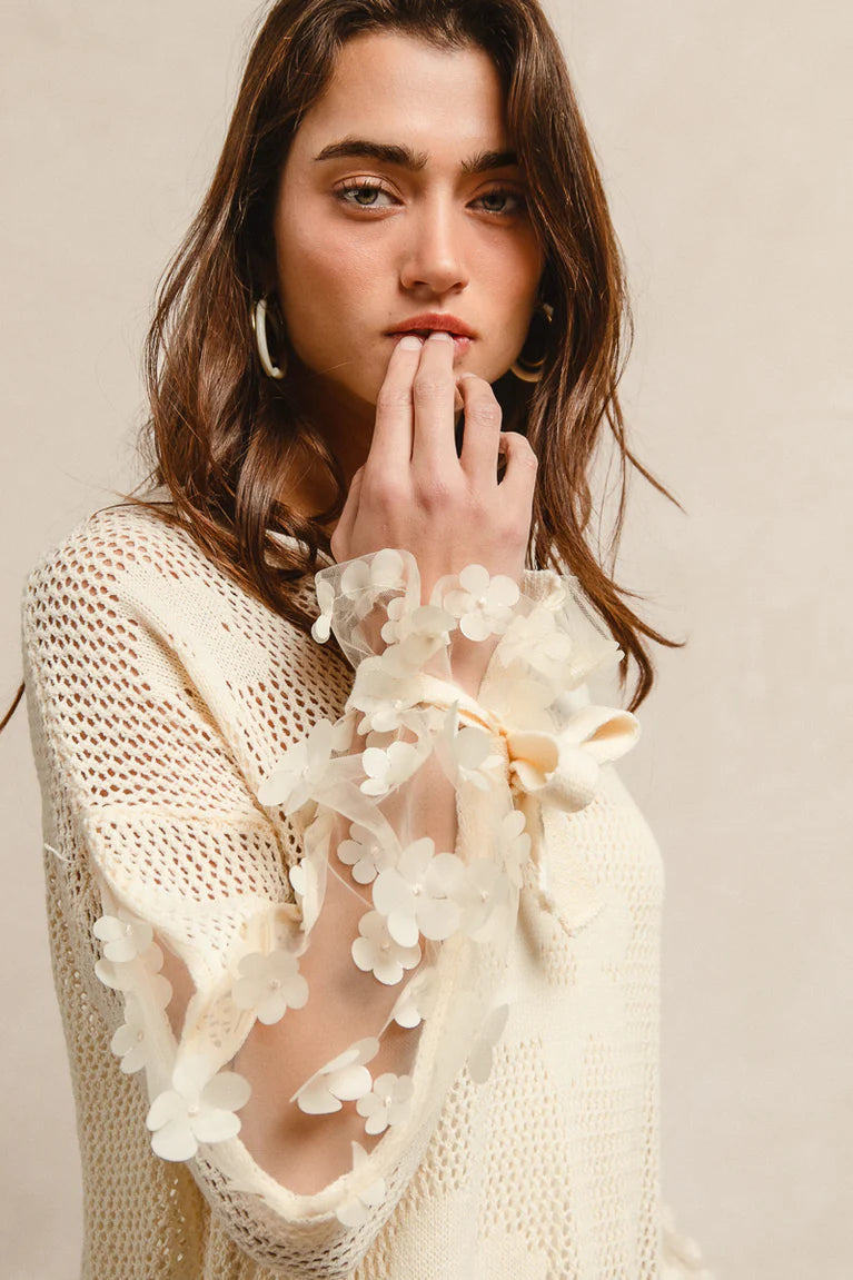 Delicate details meet effortless style in the Coastal Bloom Embellished Knit Top. This cream-toned open knit piece features see-through sleeves adorned with beautiful floral embellishments and charming tie accents at the cuff. Side slits add a touch of was and movement, making it a flattering choice for layering over a tank. Pair it with denim for a laid-back charm or dress pants for a more polished coastal look, it's a standout style that blends soft femininity with everyday elegance.