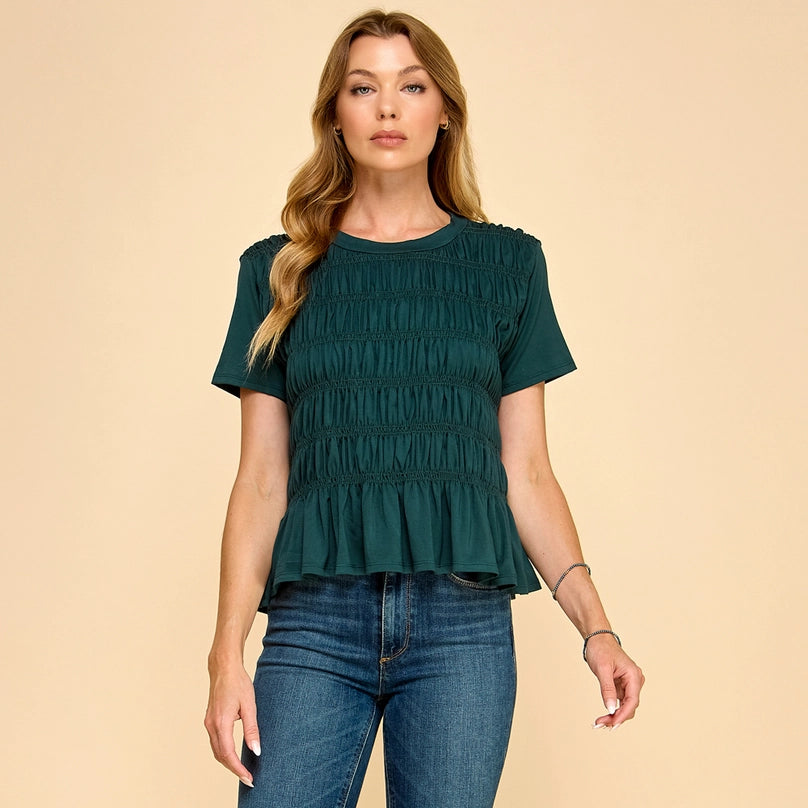 Infused with timeless coastal elegance, this hunter green top features delicate smock detailing that adds texture and sophistication to its classic silhouette. Crafted from soft, breathable fabric, it promises all-day comfort while maintaining an effortlessly polished look. Whether paired with jeans for a casual outing, styled with one of our matching skorts or pants, or dressed up with tailored trousers, this versatile piece transitions seamlessly from day to night with coastal ease.